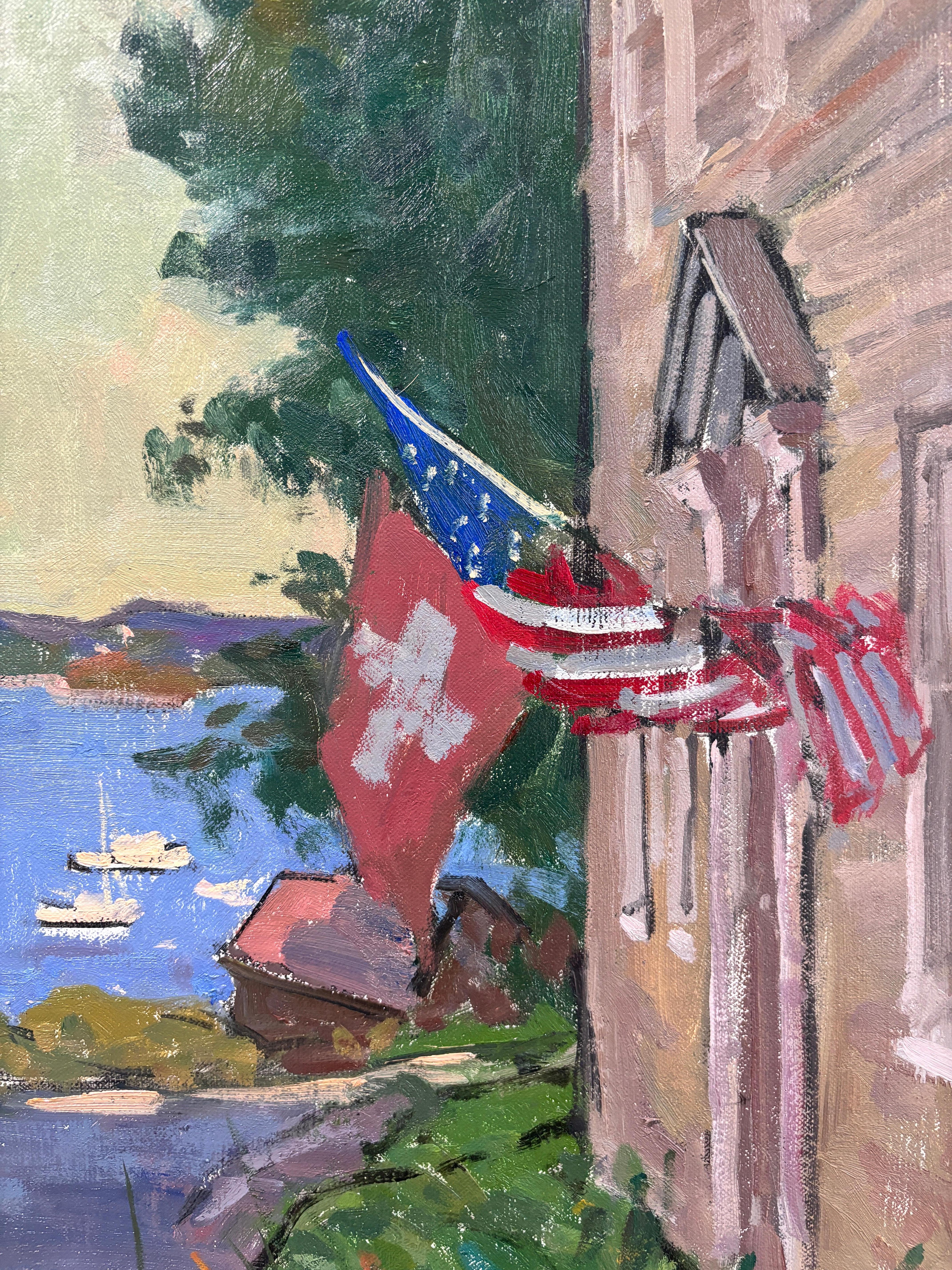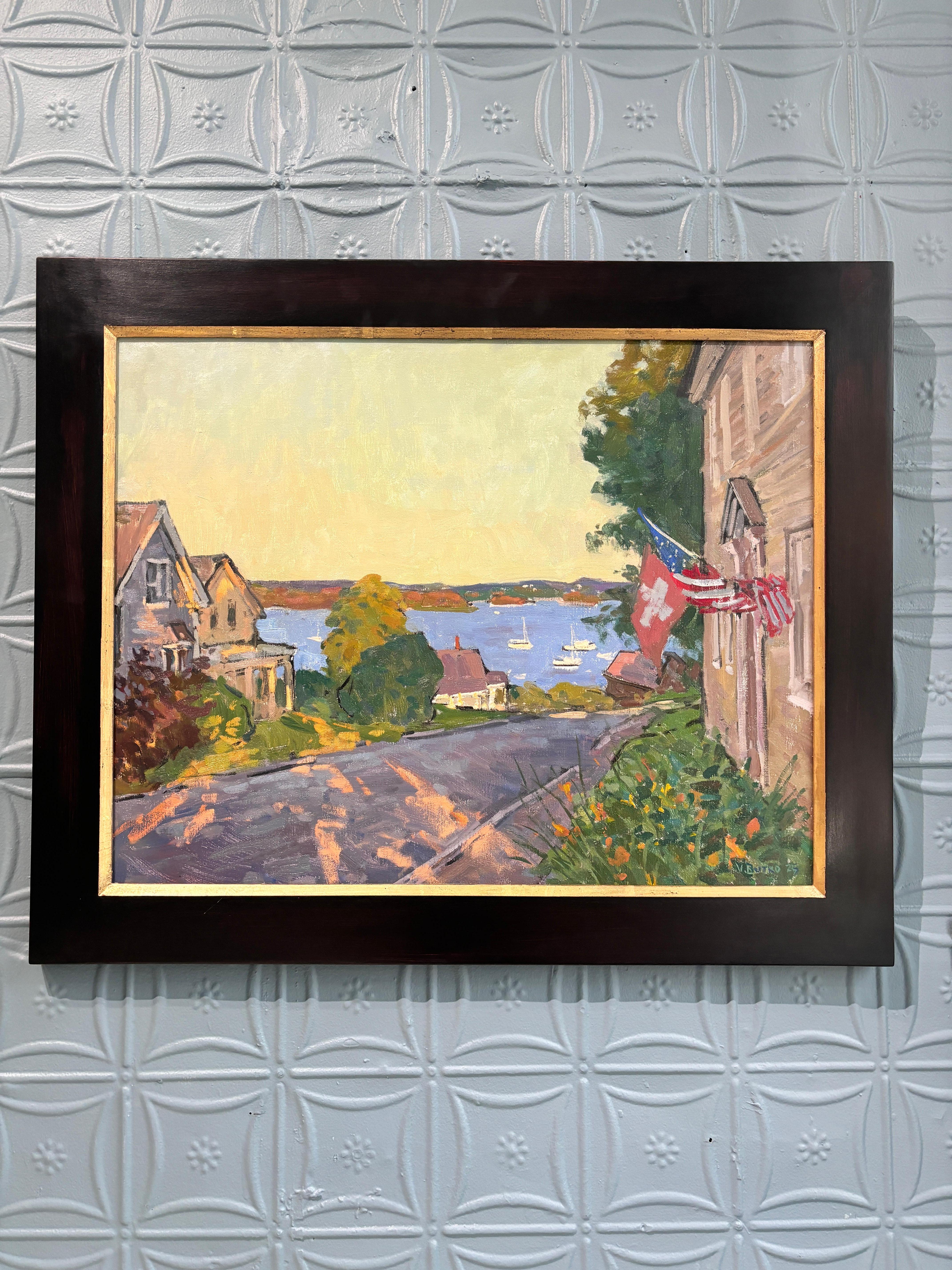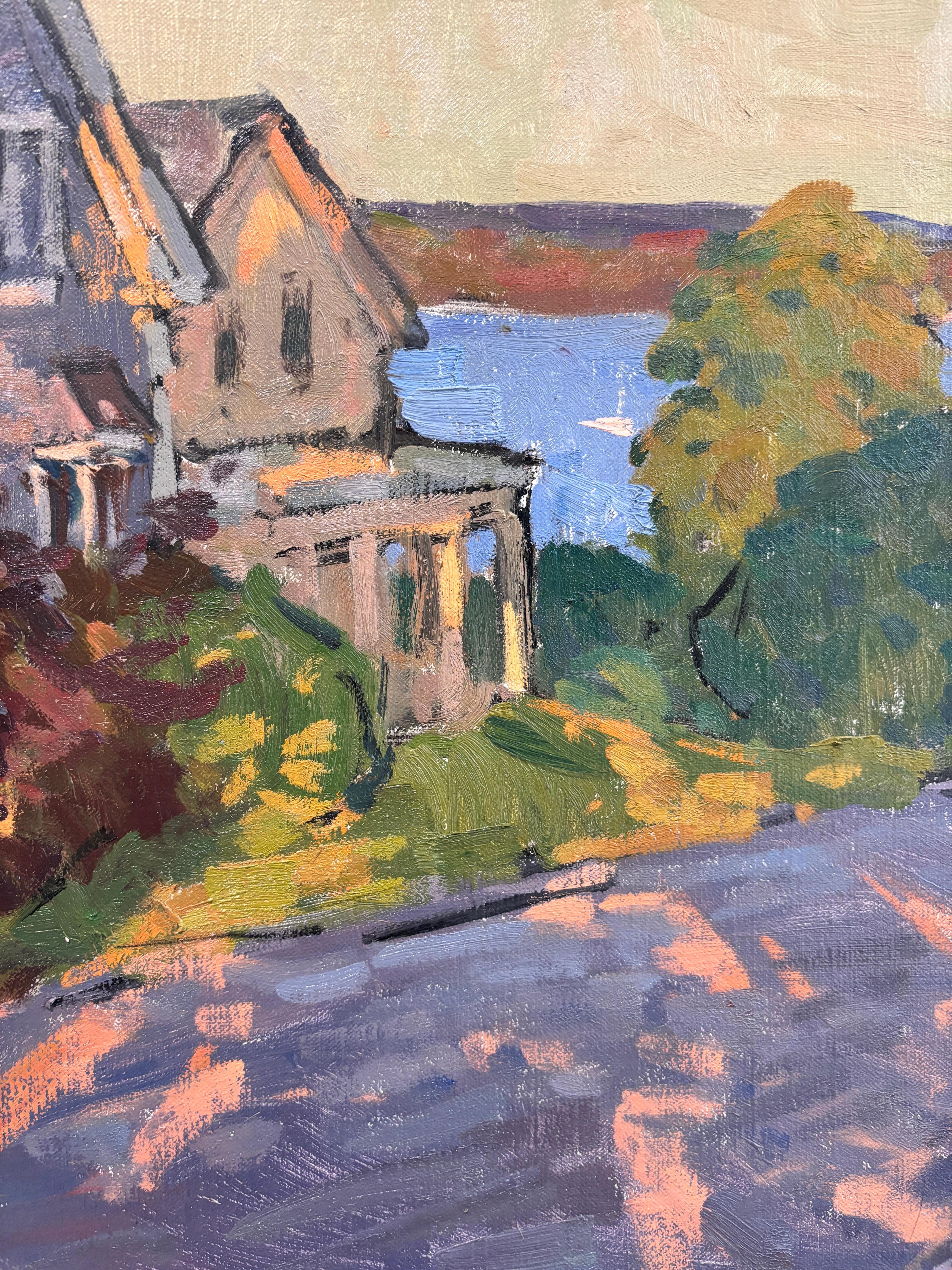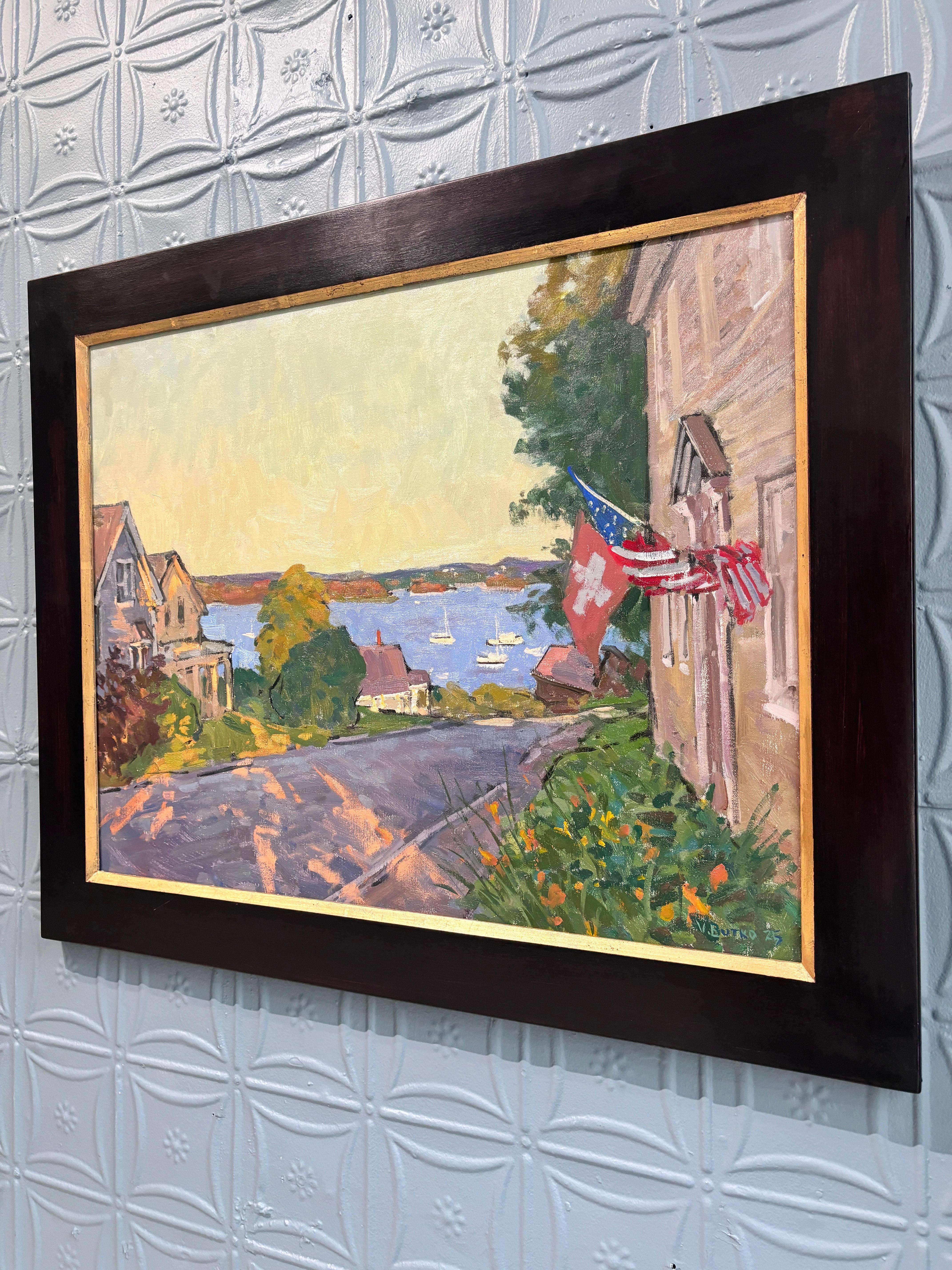 "Abendschatten" von Victor Butko (1978, Moskau) ist ein zeitgenössisches neoimpressionistisches Gemälde von Stonington Harbor, Maine, das ein Viertel entlang des Hafens in der Abenddämmerung zeigt. Das goldene Licht berührt die Dächer und die Straße, während eine amerikanische und eine Rotkreuzflagge in der sanften Seeluft wehen. Victor Butko ist ein bekannter neoimpressionistischer Maler, der ursprünglich aus Moskau, Russland, stammt und heute in Massachussets, USA, lebt und arbeitet.