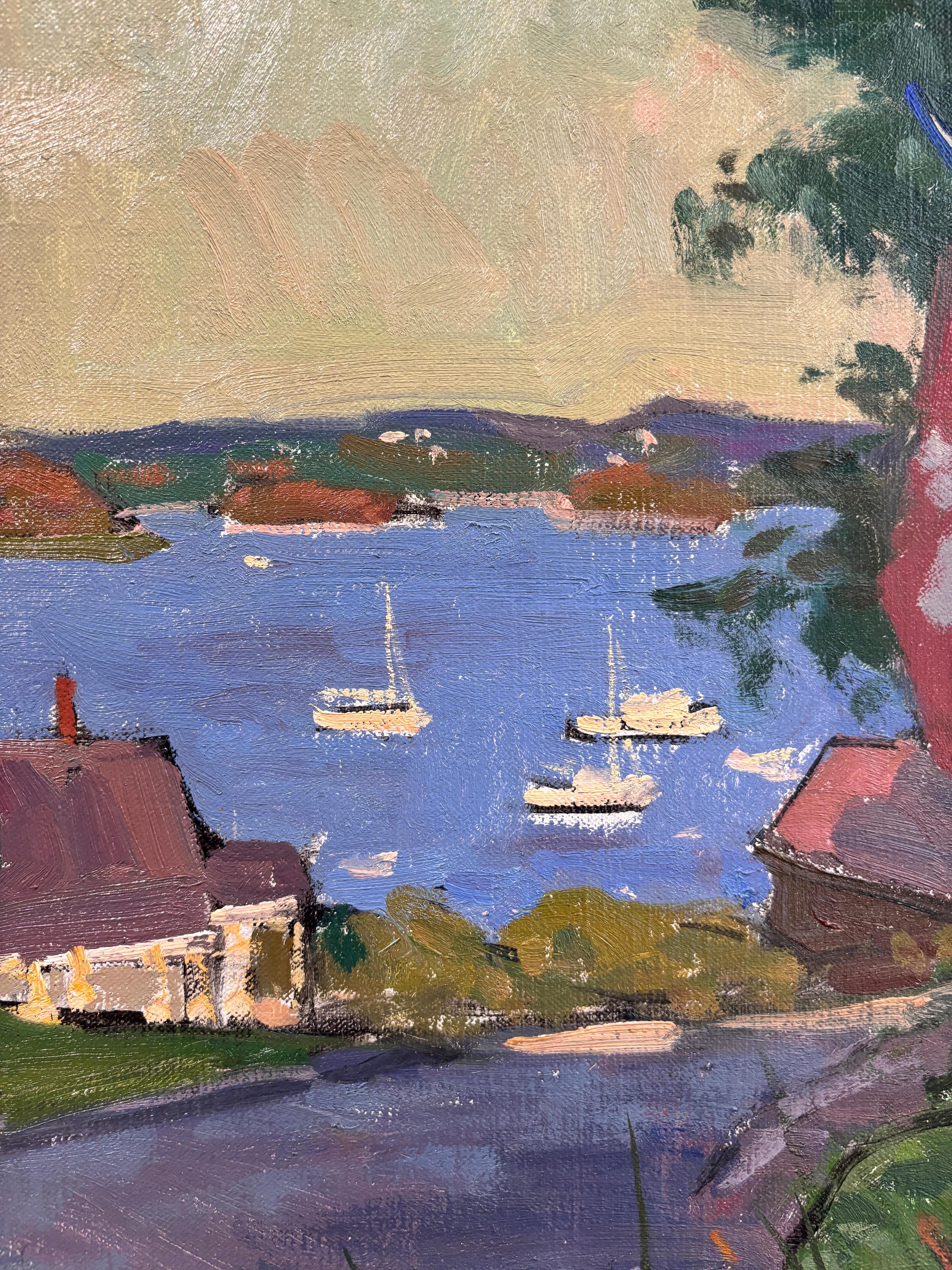 "Sonniger Nachmittag" von Viktor Butko (1978, Moskau) ist eine zeitgenössische neoimpressionistische Landschaft eines Küstenviertels in Stonington Harbor, Maine, die drei Figuren ze...