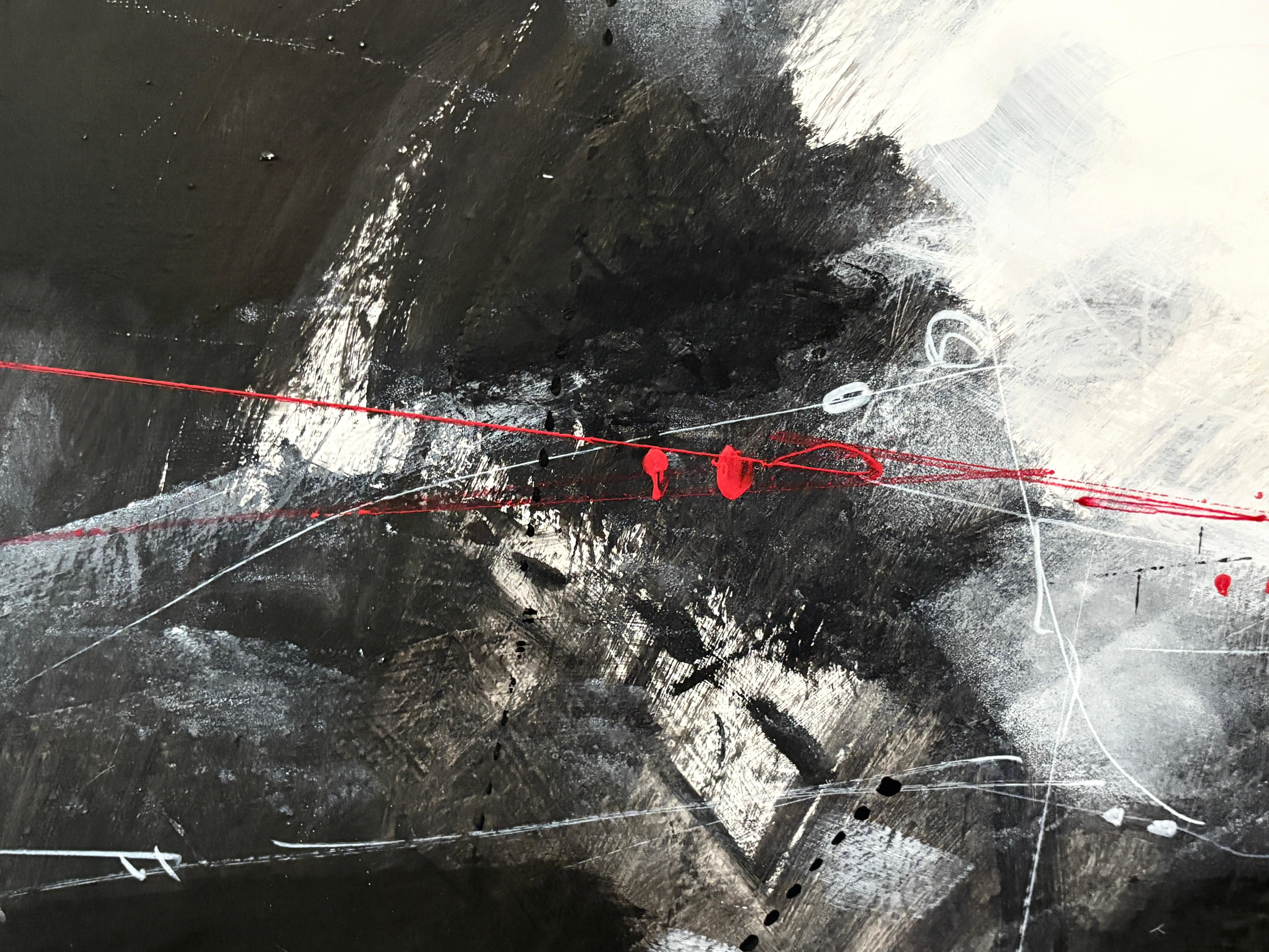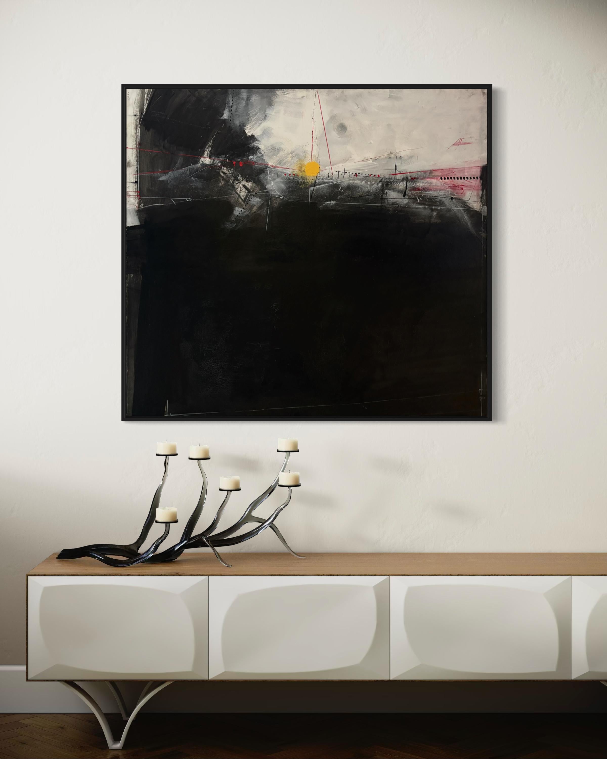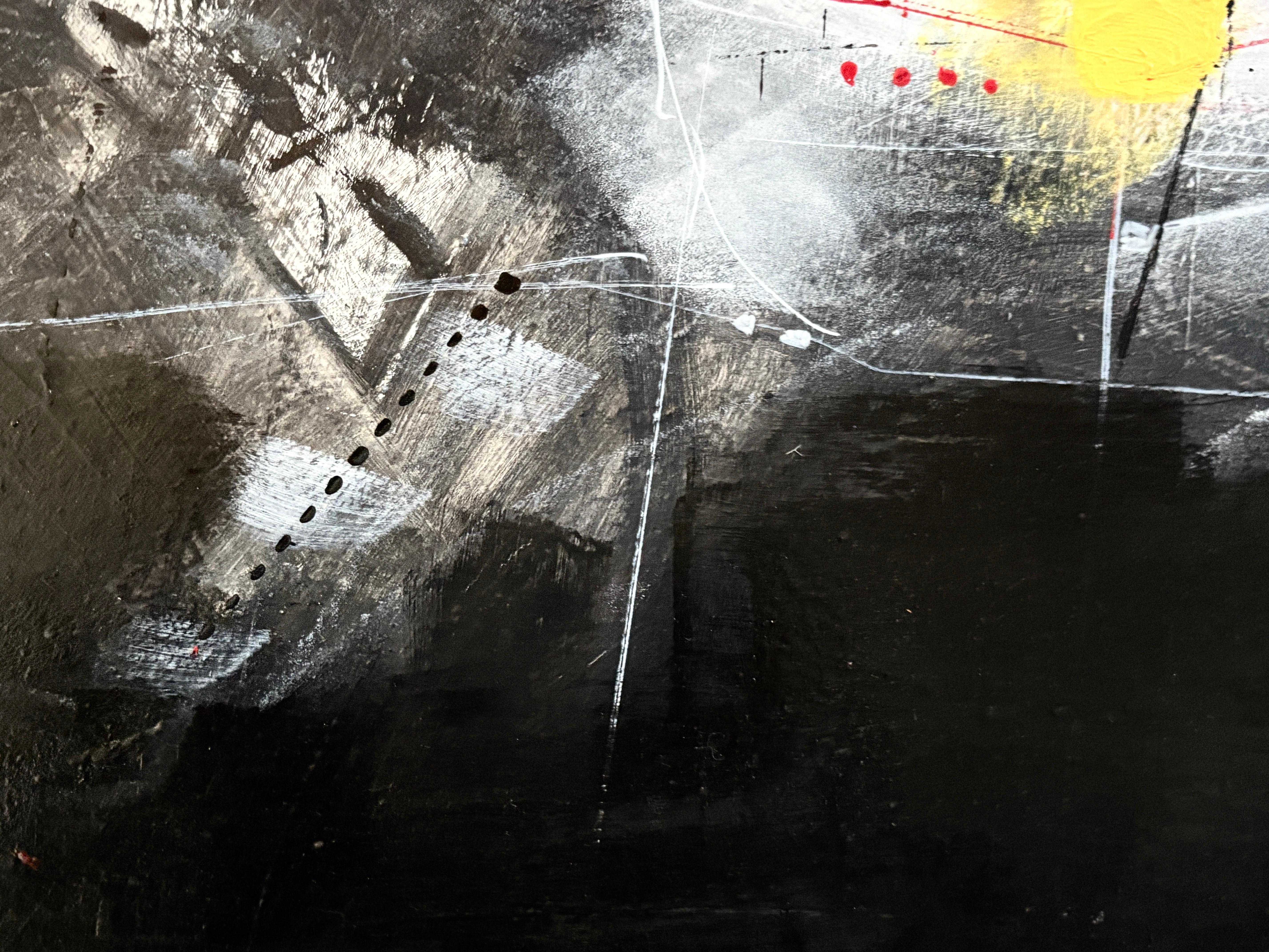 "Cargo" von Zion Mor hüllt den Betrachter in eine riesige Leinwand des abstrakten Expressionismus ein, die an die Feinheiten urbaner Landschaften erinnert. Die vorherrschenden Grautöne und tiefen Schwarztöne, durchzogen von roten Linien und einem auffälligen gelben Kreis, wecken Gefühle von Geheimnis und Erkundung. Jedes Element wirkt wie ein Fragment einer größeren Geschichte, wie eine Fracht, die von einem Ort zum anderen transportiert wird und ihre eigene Geschichte und Erzählung trägt. Mors Hingabe an das Gleichgewicht von Linie, Farbe und Komposition ist offensichtlich, ebenso wie seine mathematische Präzision. Die rohen Emotionen und die tiefe Tiefe, die in den Kunstwerken stecken, gleichen diese Präzision jedoch wunderbar aus. Mit "Cargo" nimmt Mor den Betrachter mit auf eine Reise der Kontemplation und Interpretation und bietet einen Einblick in die Verbindung von Chaos und Ordnung in der urbanen Welt.