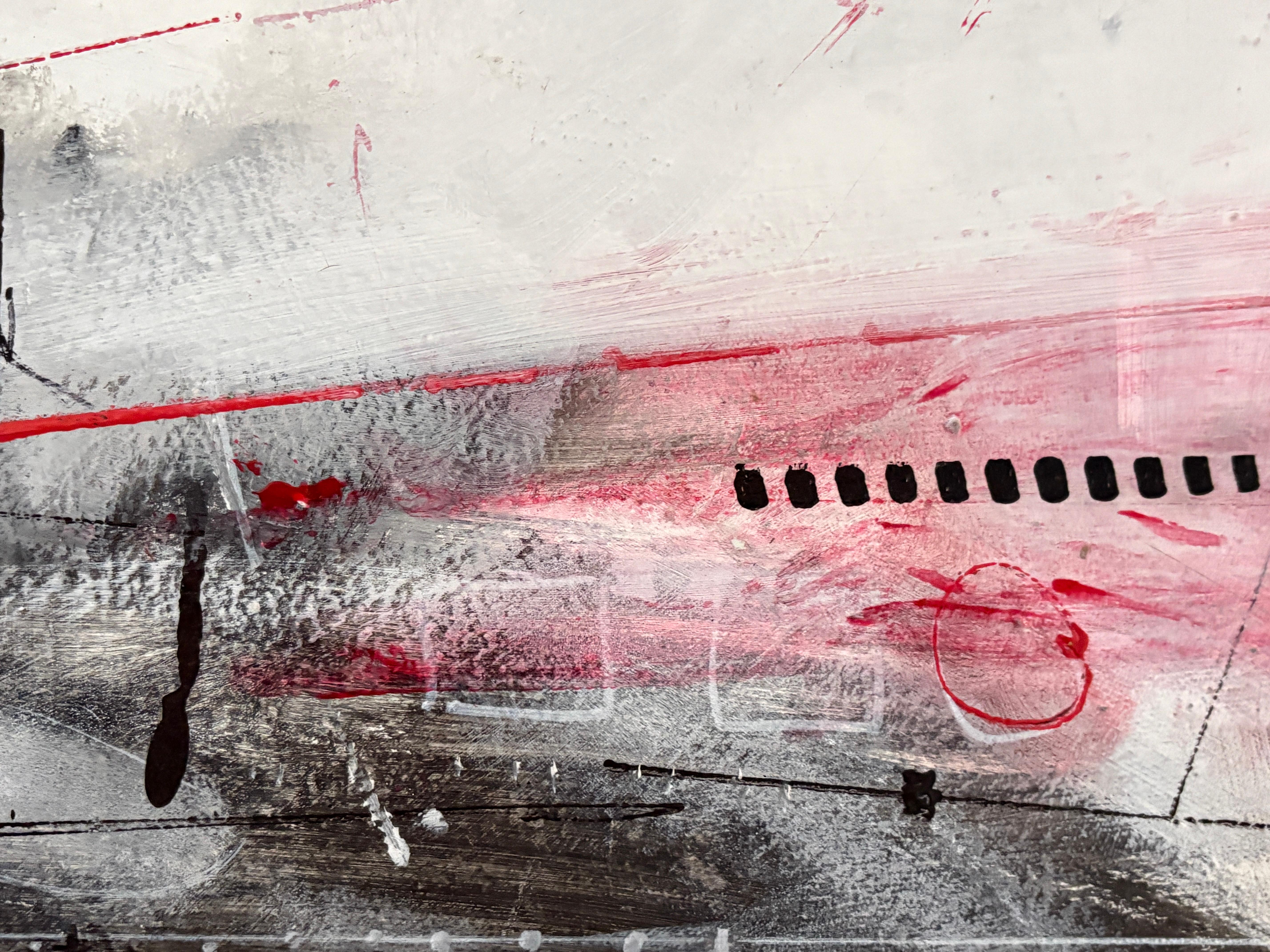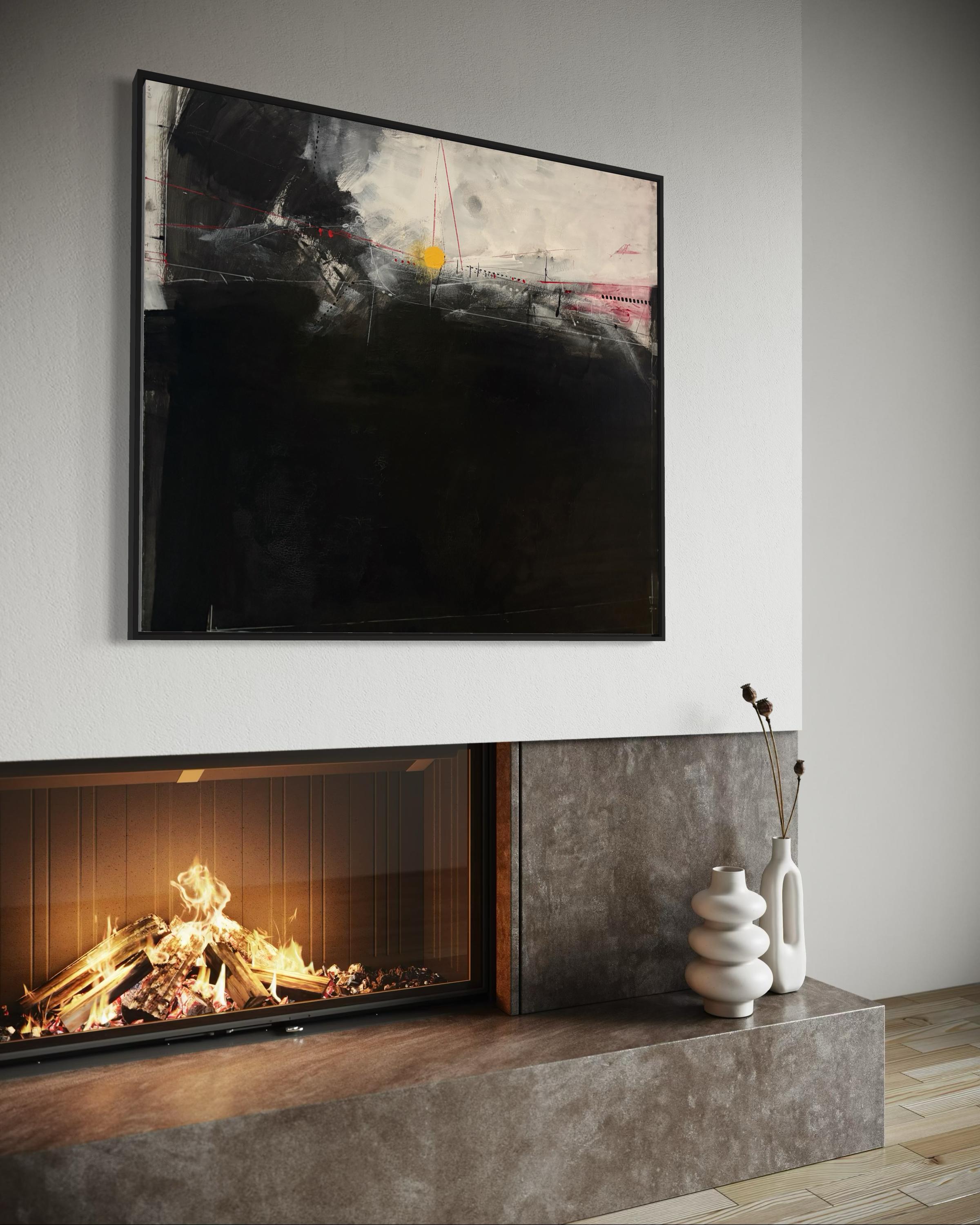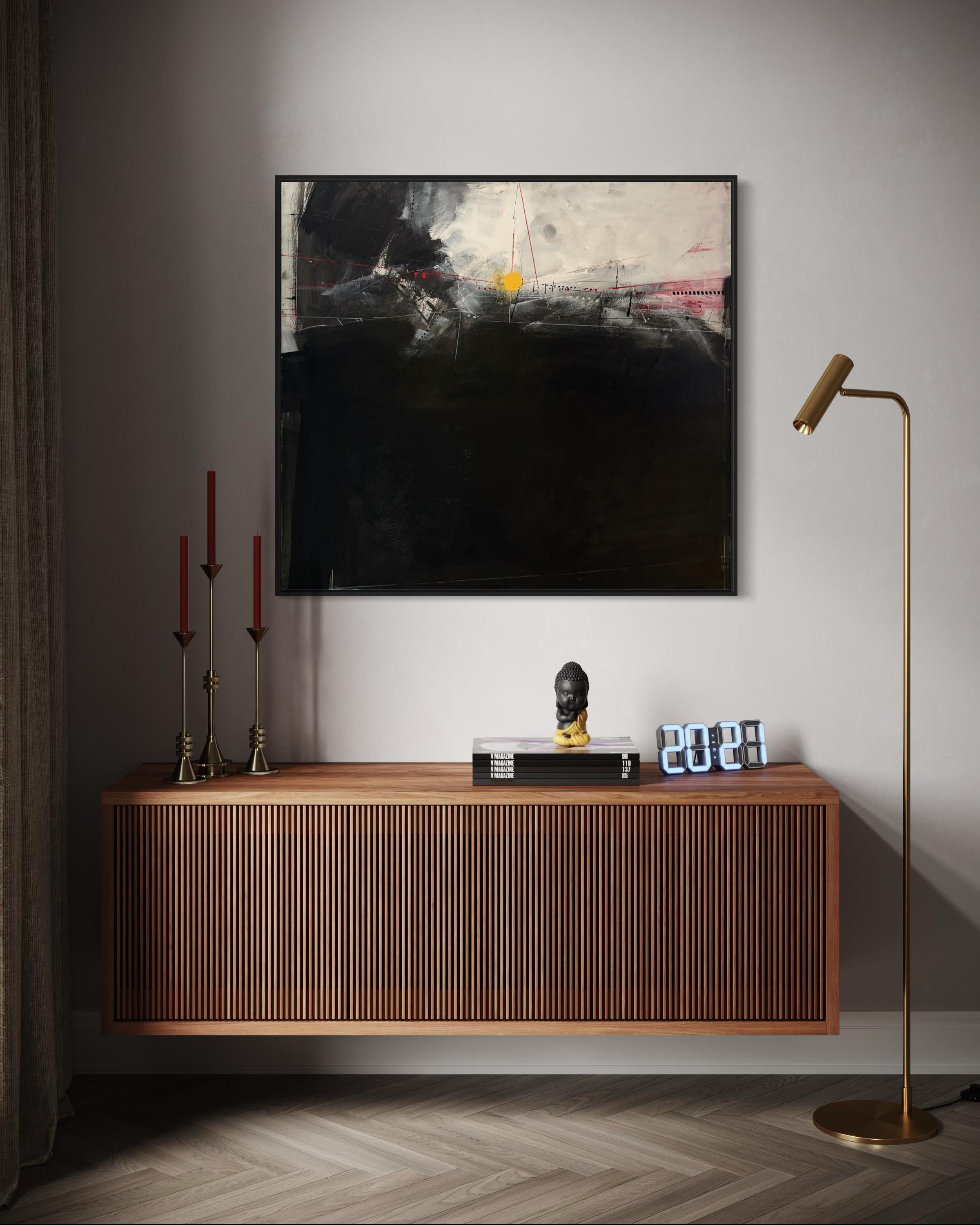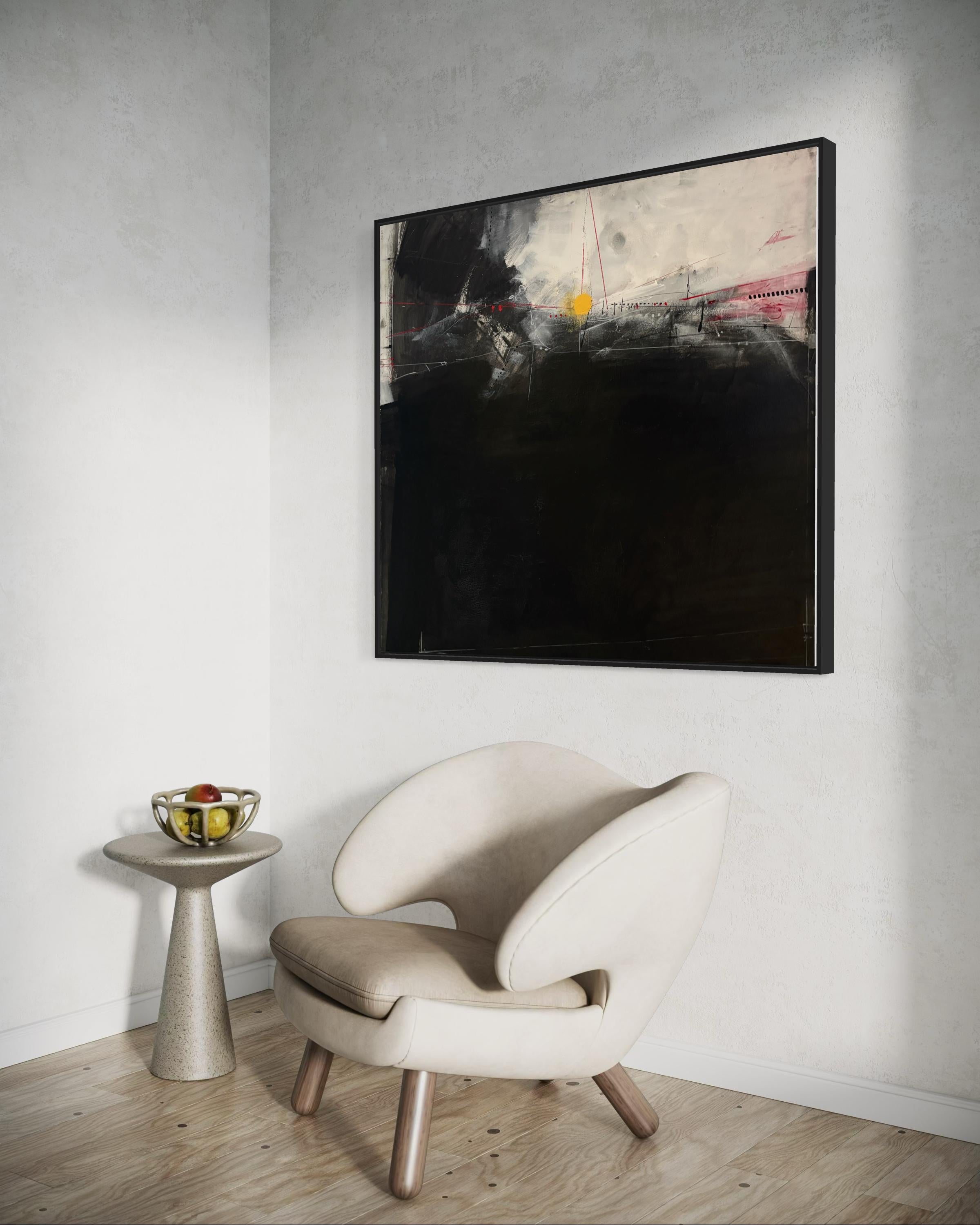 "Cargo" von Zion Mor hüllt den Betrachter in eine riesige Leinwand des abstrakten Expressionismus ein, die an die Feinheiten urbaner Landschaften erinnert. Die vorherrschenden Grautöne und tiefen Schwarztöne, durchzogen von roten Linien und einem auffälligen gelben Kreis, wecken Gefühle von Geheimnis und Erkundung. Jedes Element wirkt wie ein Fragment einer größeren Geschichte, wie eine Fracht, die von einem Ort zum anderen transportiert wird und ihre eigene Geschichte und Erzählung trägt. Mors Hingabe an das Gleichgewicht von Linie, Farbe und Komposition ist offensichtlich, ebenso wie seine mathematische Präzision. Die rohen Emotionen und die tiefe Tiefe, die in den Kunstwerken stecken, gleichen diese Präzision jedoch wunderbar aus. Mit "Cargo" nimmt Mor den Betrachter mit auf eine Reise der Kontemplation und Interpretation und bietet einen Einblick in die Verbindung von Chaos und Ordnung in der urbanen Welt.