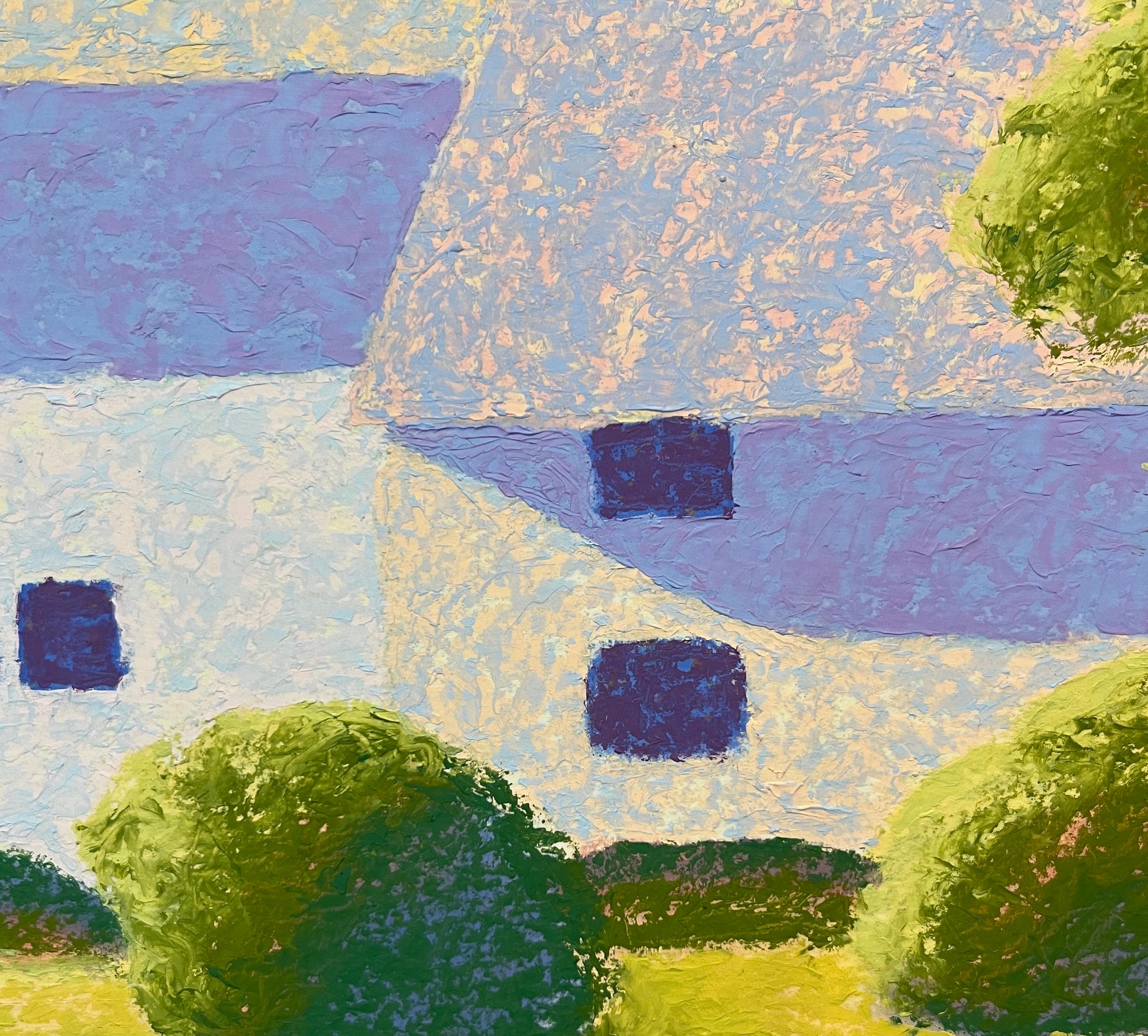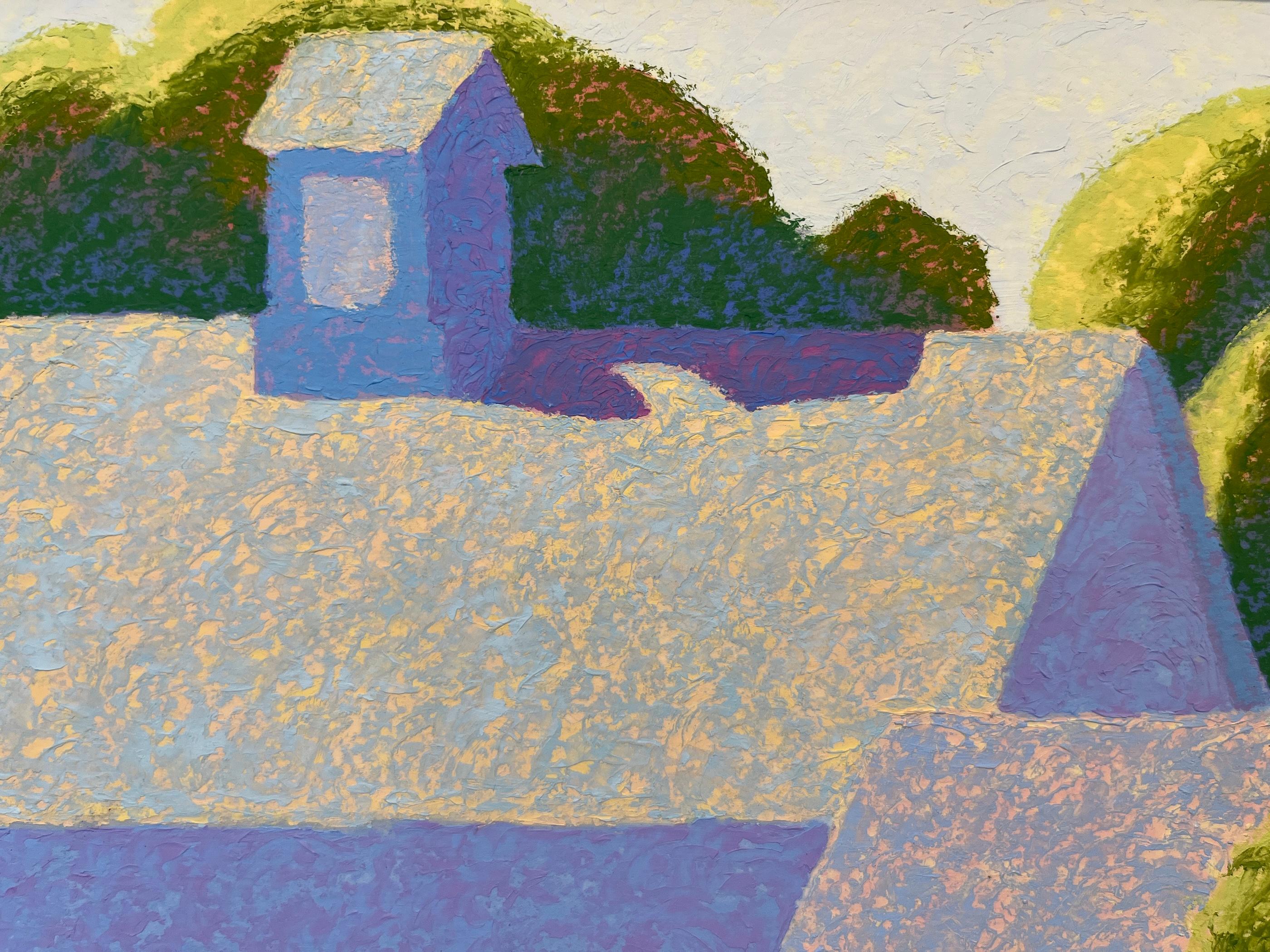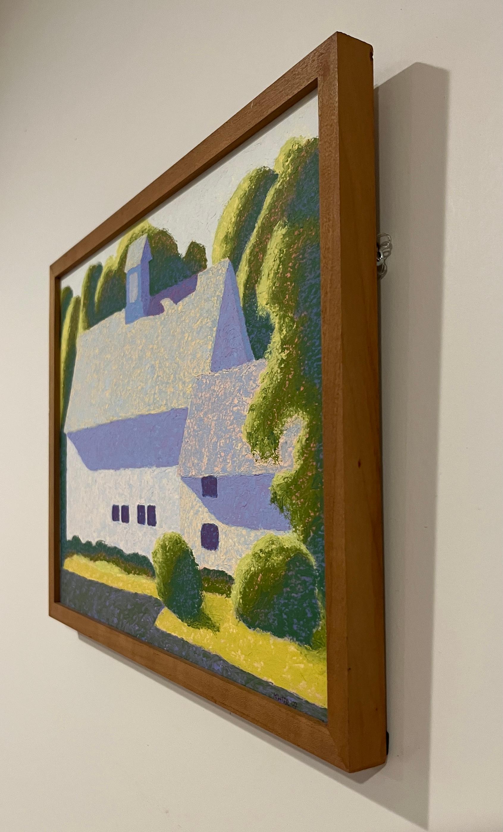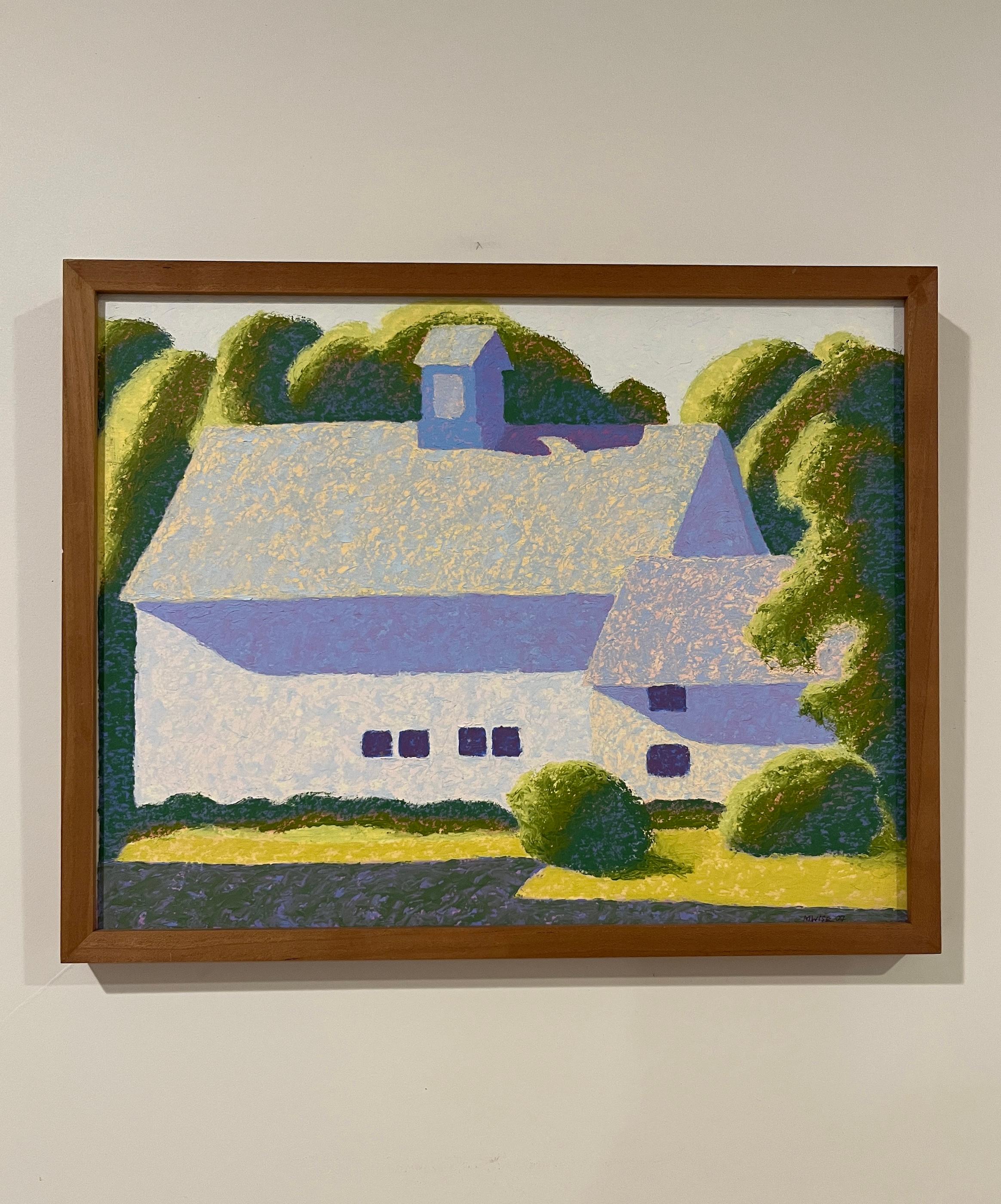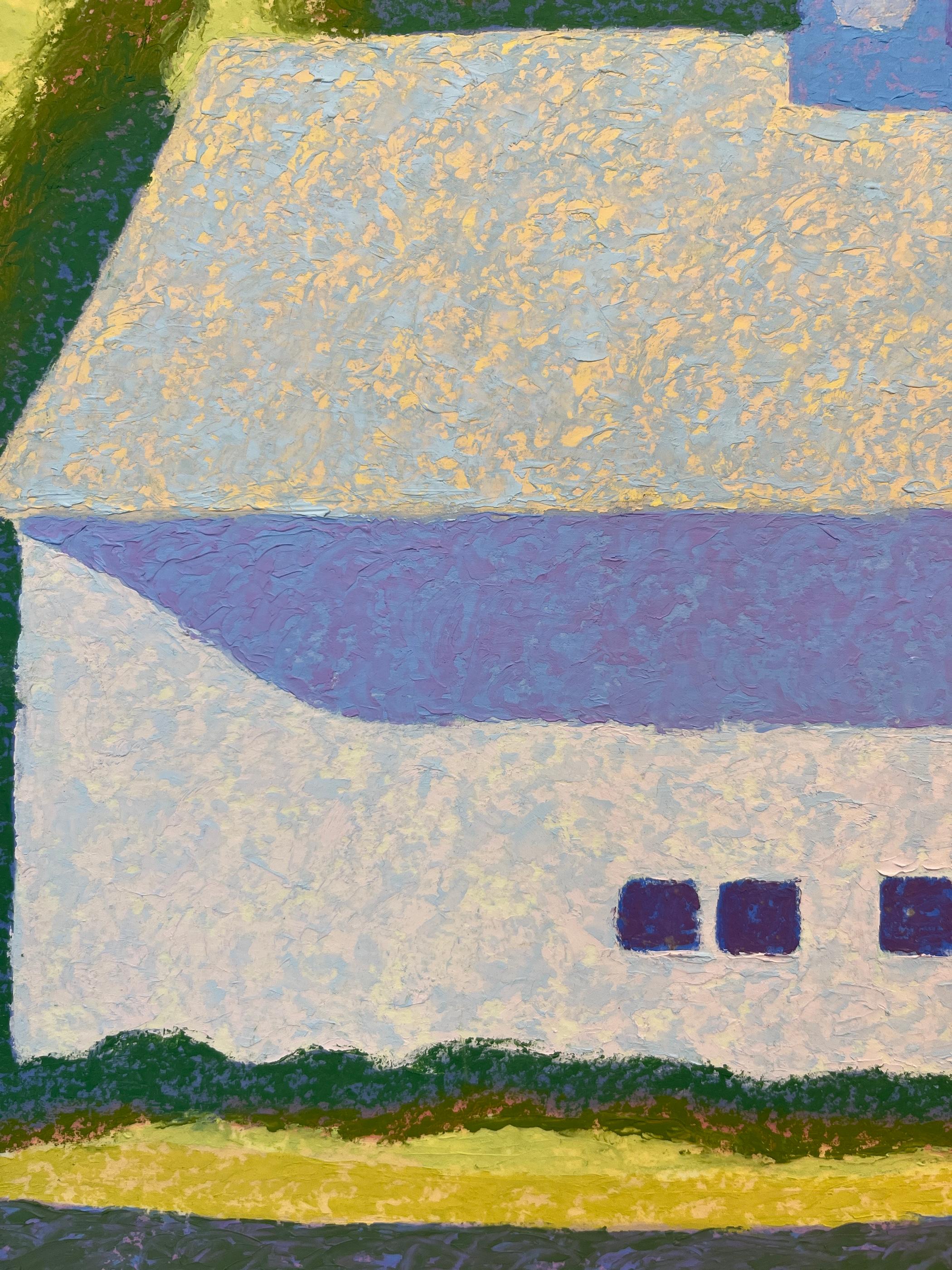 Marcia Wise"Weiße Scheune", Zeitgenössische Landschaft, Blau, Grün, Rot, Lila, Ölgemälde2007