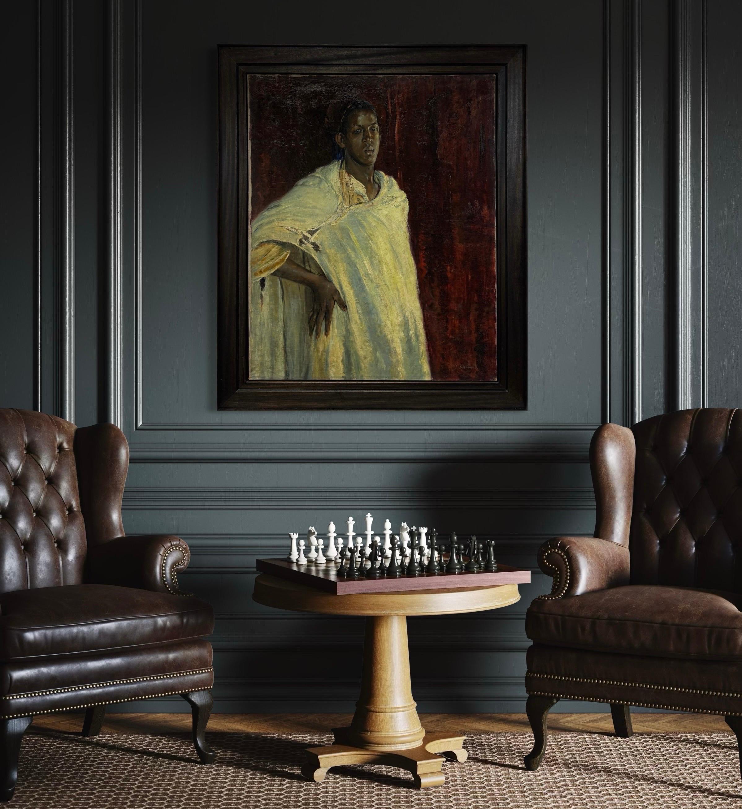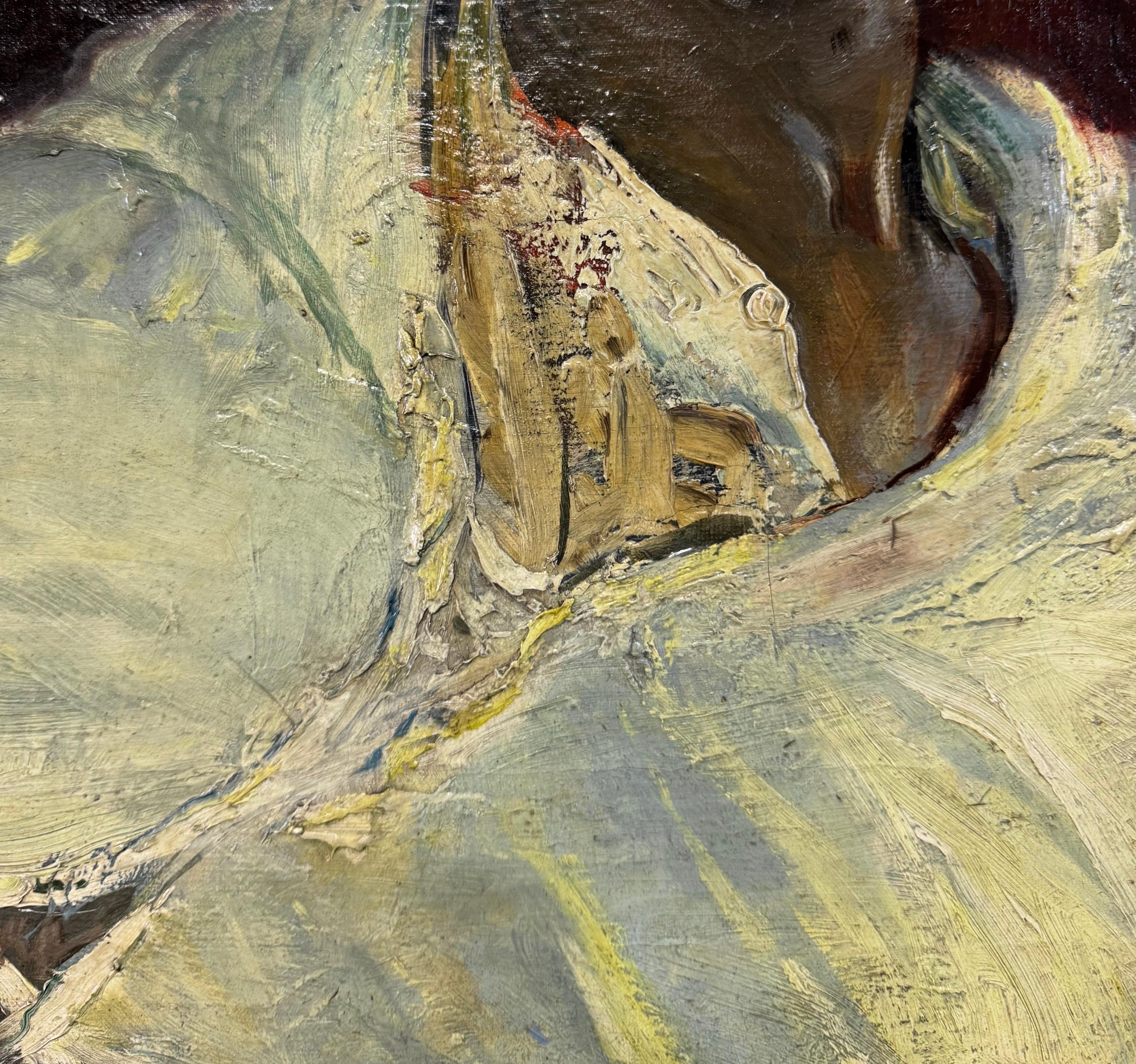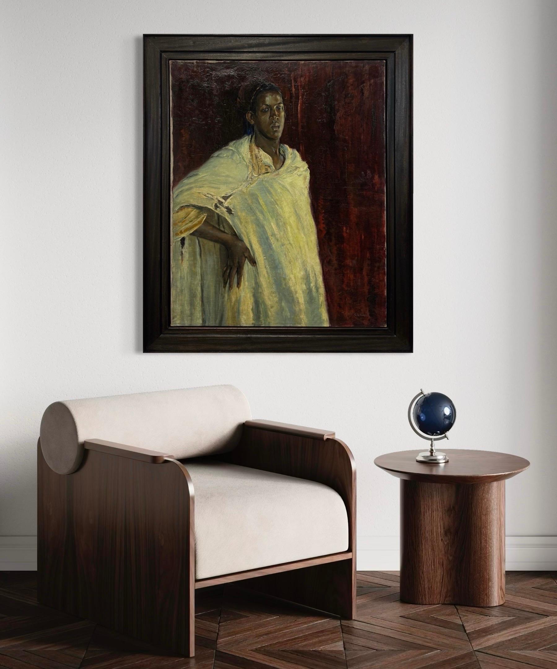 Inspiriert von Slades Reisen in Algerien und Tunesien, zeigt dieses bemerkenswerte Porträt einen jungen Mann, der in einem blassen, voluminösen Mantel gekleidet ist und mit gelassener Würde dasteht. Das Motiv begegnet dem Blick des Betrachters direkt, sein ruhiger Ausdruck strahlt eine stille Stärke aus. Der Hintergrund aus tiefen, strukturierten Karmin- und Umbra-Tönen bildet einen auffälligen Kontrast zu dem leuchtenden Kleidungsstück und verstärkt die physische Präsenz und emotionale Schwere des Motivs.