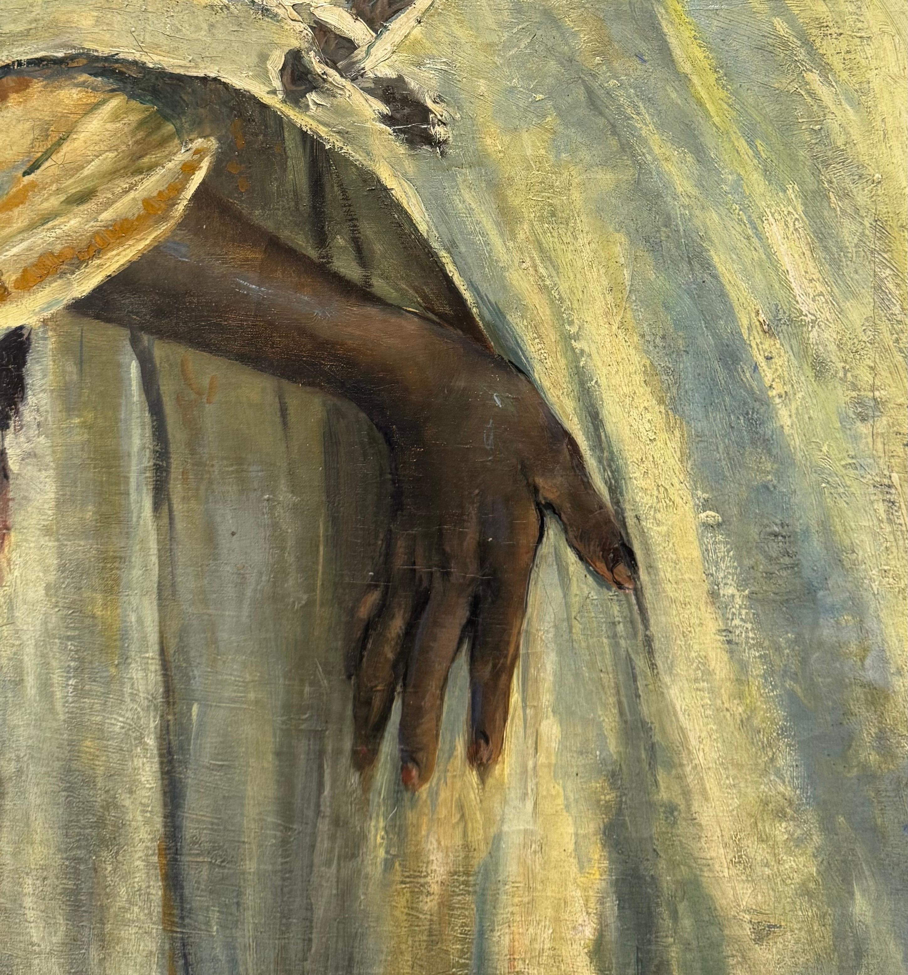 Slade, der für seine respektvollen und vermenschlichenden Darstellungen von nicht-westlichen Personen bekannt ist, behandelt diese Figur als ein Individuum mit aristokratischer Haltung und Handlungsfähigkeit. Die Pose ist elegant und doch ungezwungen: Die rechte Hand des Mannes ruht auf der Hüfte, der linke Arm liegt entspannt unter den Falten seines Gewandes. Es gibt keine Ornamente, keine überladenen Requisiten oder Kulissen - nur das Motiv, den Maler und den Betrachter.
