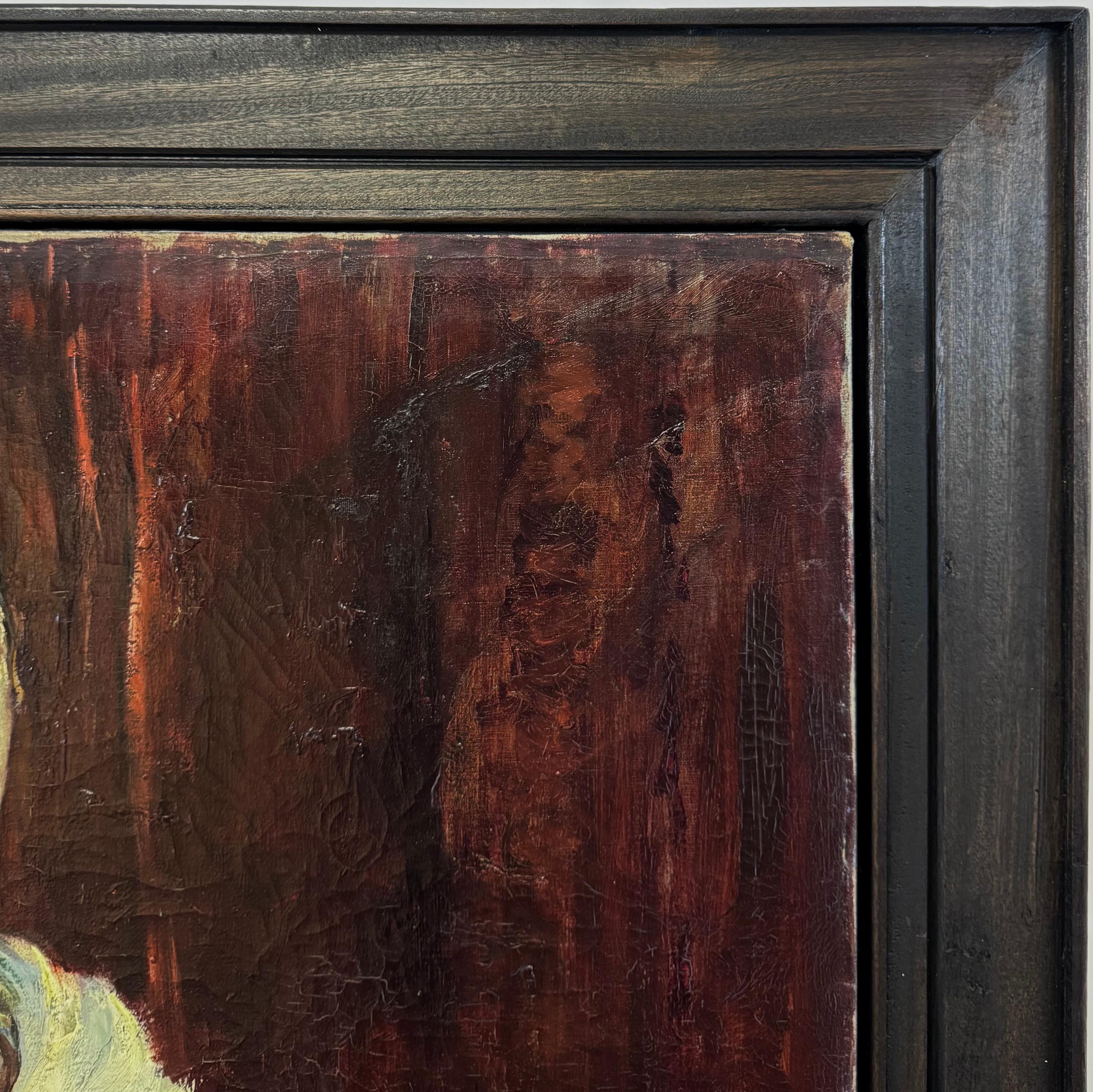 Ein auffälliges Porträt, das eine Frau mit Kopftuch zeigt. Signiert unten rechts. Präsentiert in einem Holzrahmen mit gemusterten Schnitzereien. Auf dem Podium.