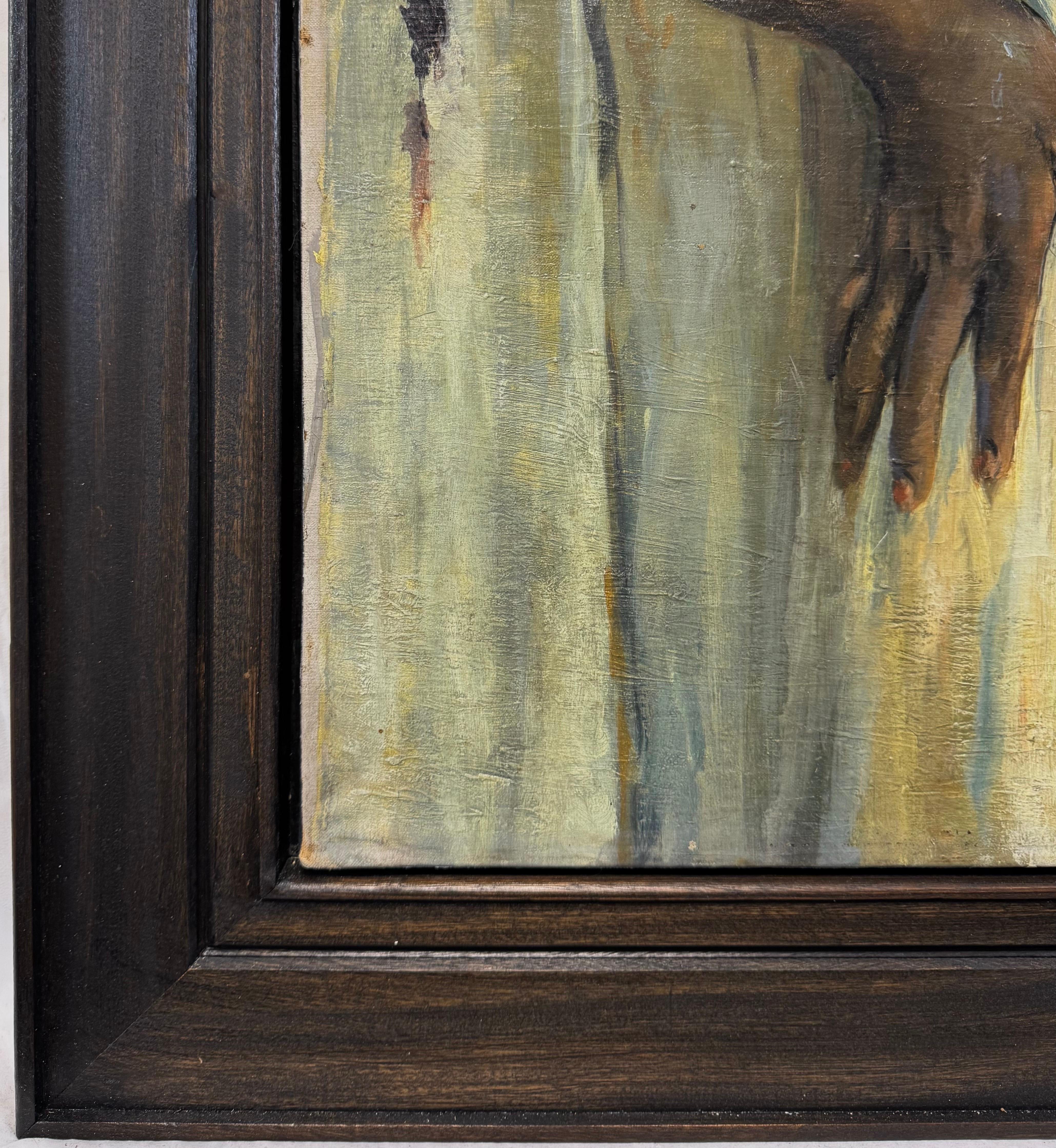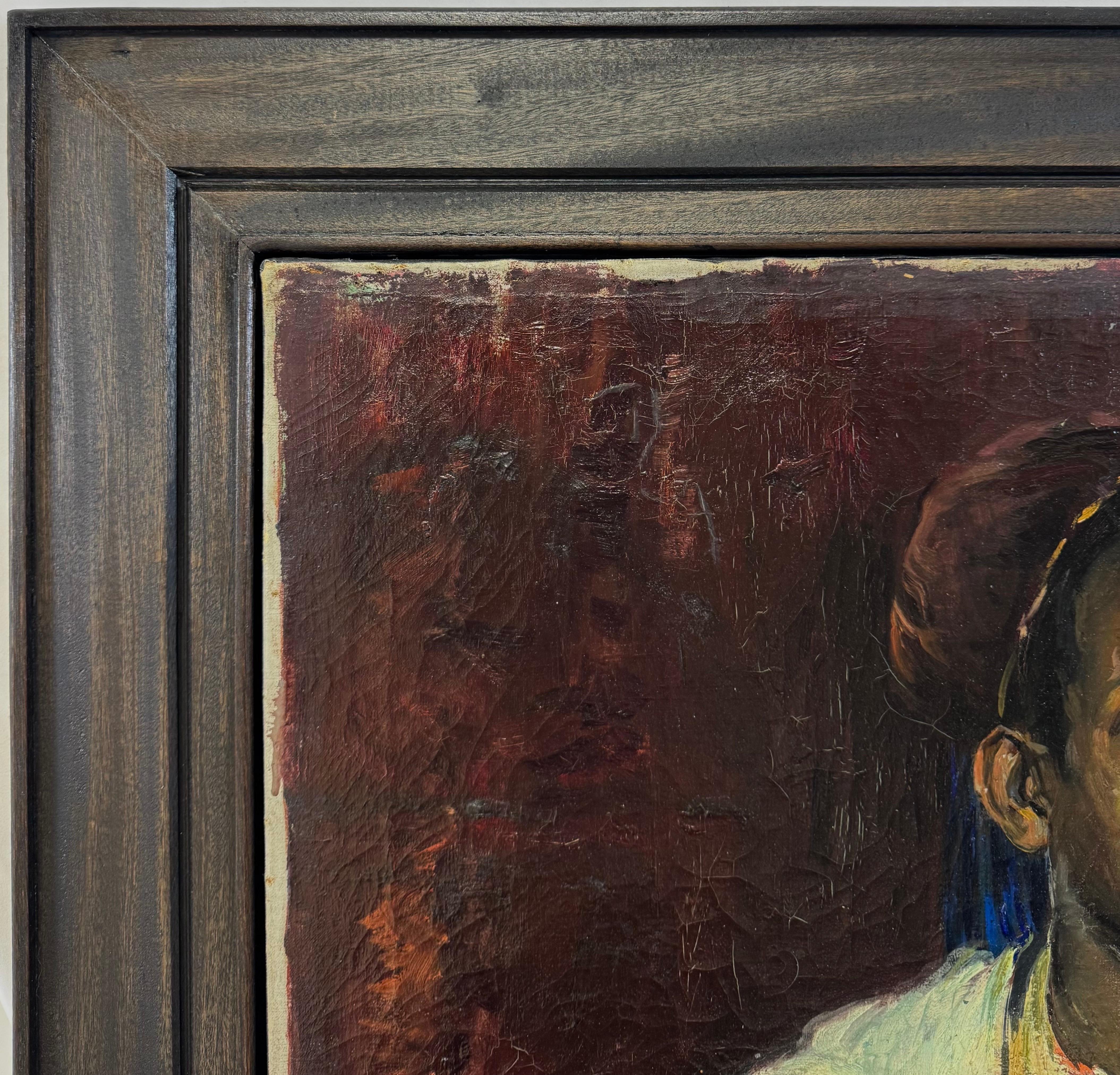Eine schöne Mitte des 20. Jahrhunderts Französisch Öl auf dem Brett Porträt einer schwarzen Frau. Das Werk wird in einem sehr hochwertigen Holzrahmen präsentiert. Oben rechts undeutl...