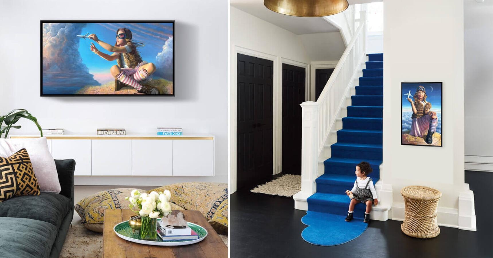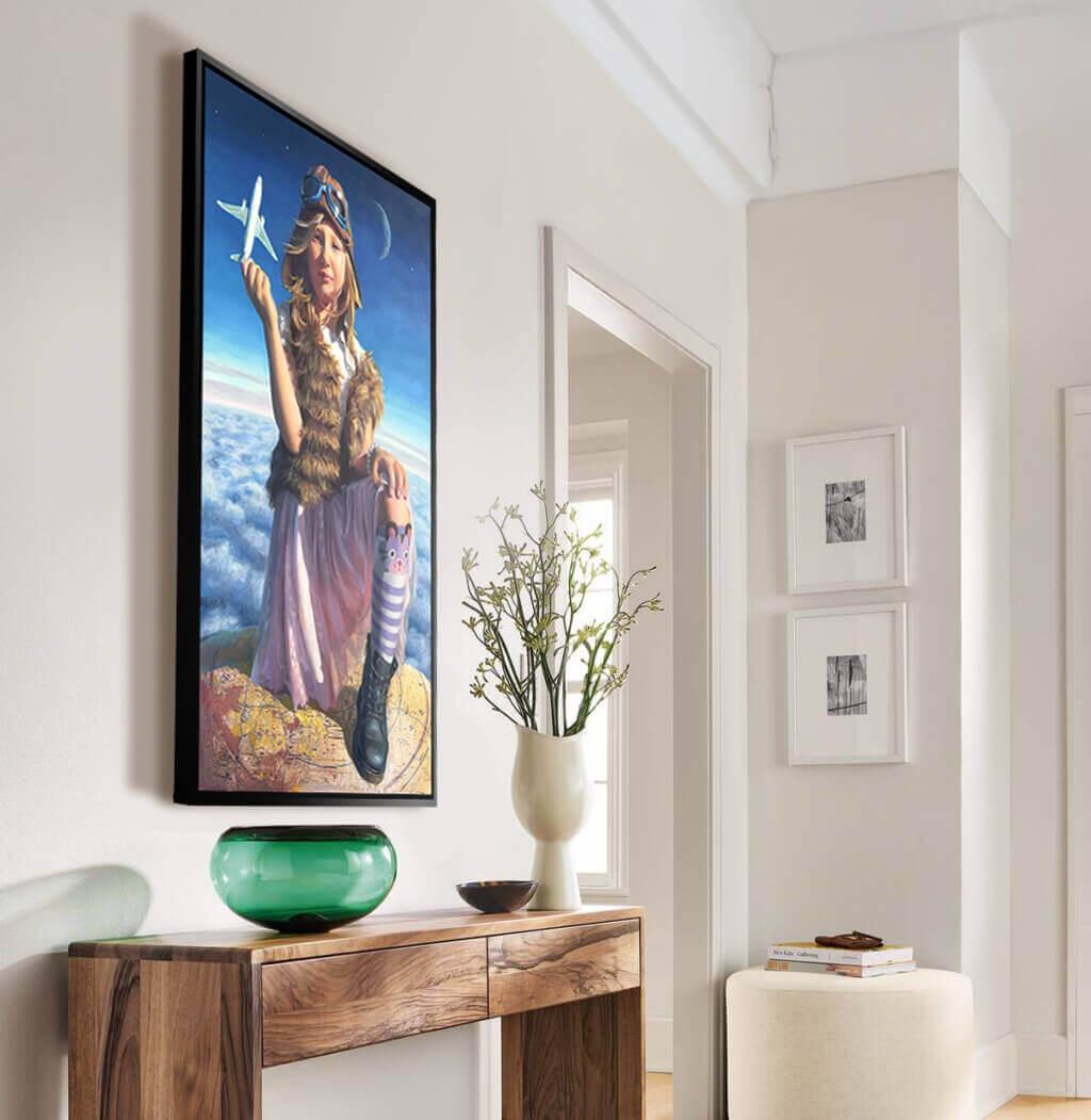 "Future of Flight" (2025) von Denise Dambrackas ist ein Original-Ölgemälde, das ein junges Mädchen zeigt, das inmitten eines farbenprächtigen Himmels ein Flugzeug in die Luft schickt, dargestellt in einem realistischen Stil. Dieses Werk ist gerahmt, 33,50 x 22,50 cm groß und kann aufgehängt werden.