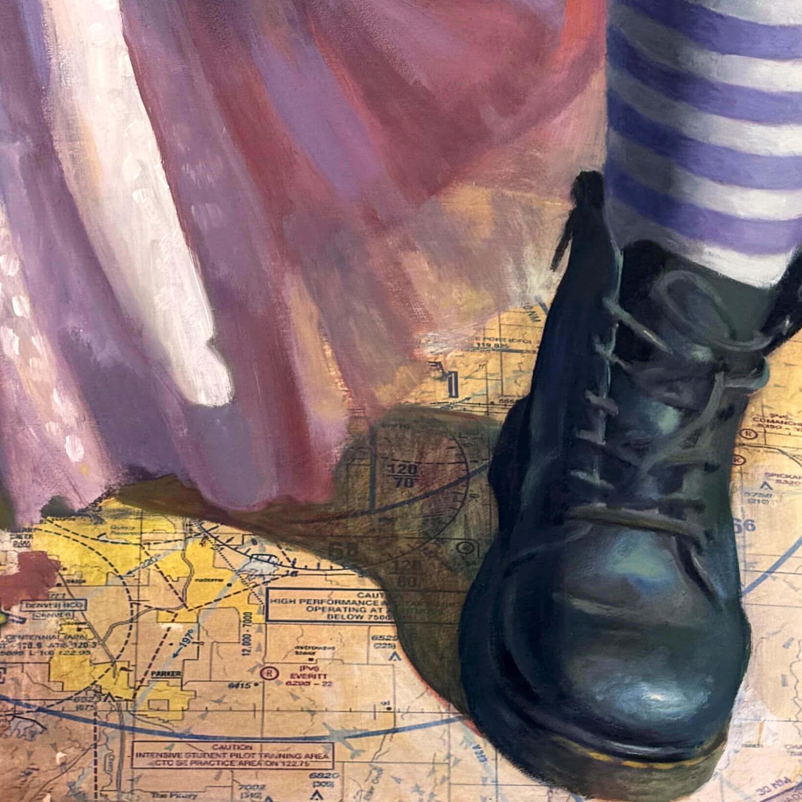 "Impenetrable Princess" (2020) von Denise Dambrackas ist ein Originalgemälde in Mischtechnik, das ein junges Mädchen zeigt, das vor einer Menschenmenge einen Bogen abschießt. Dieses ...