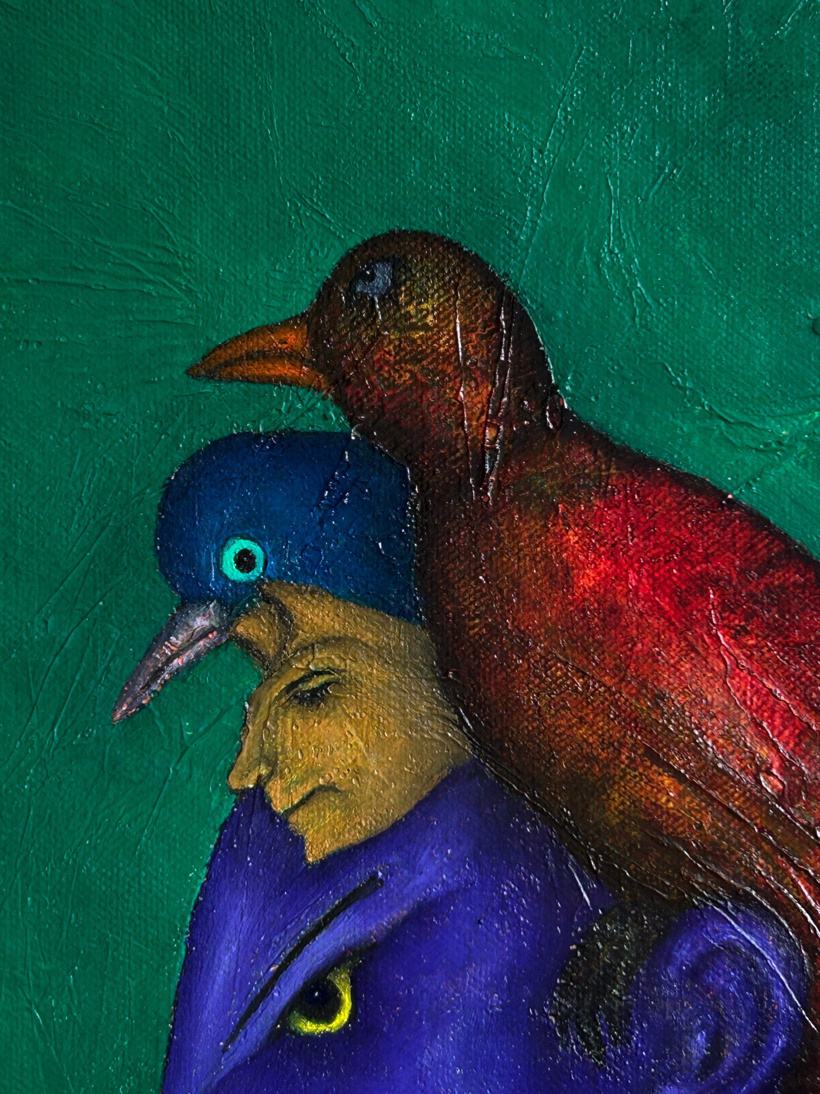 Ölgemälde auf Leinwand in Smaragdgrün, quadratisches Format. Eine menschliche Silhouette mit grünen Texturen und zwei fantastischen Tieren. Ein Werk, das figurative und abstrakte Ele...