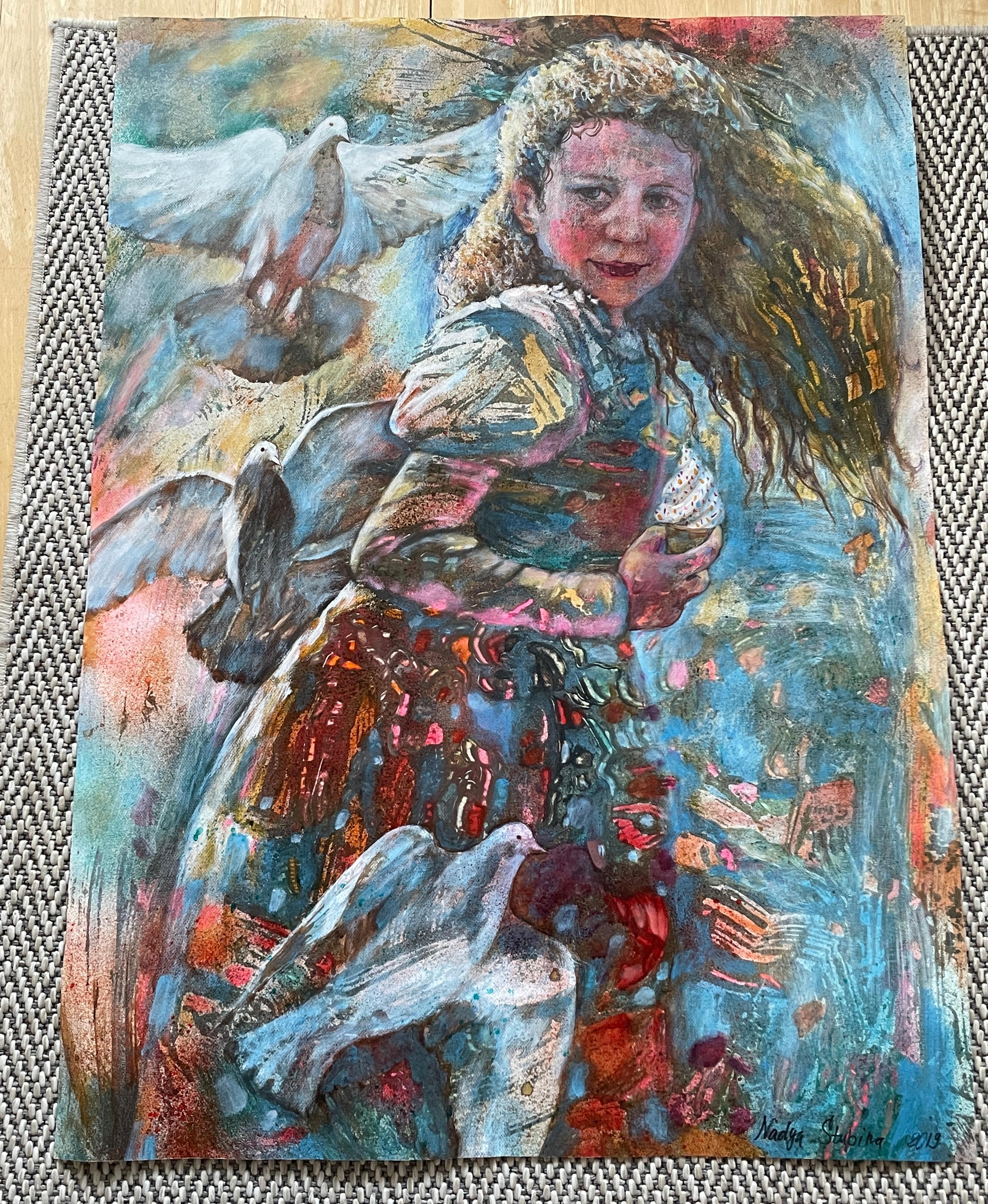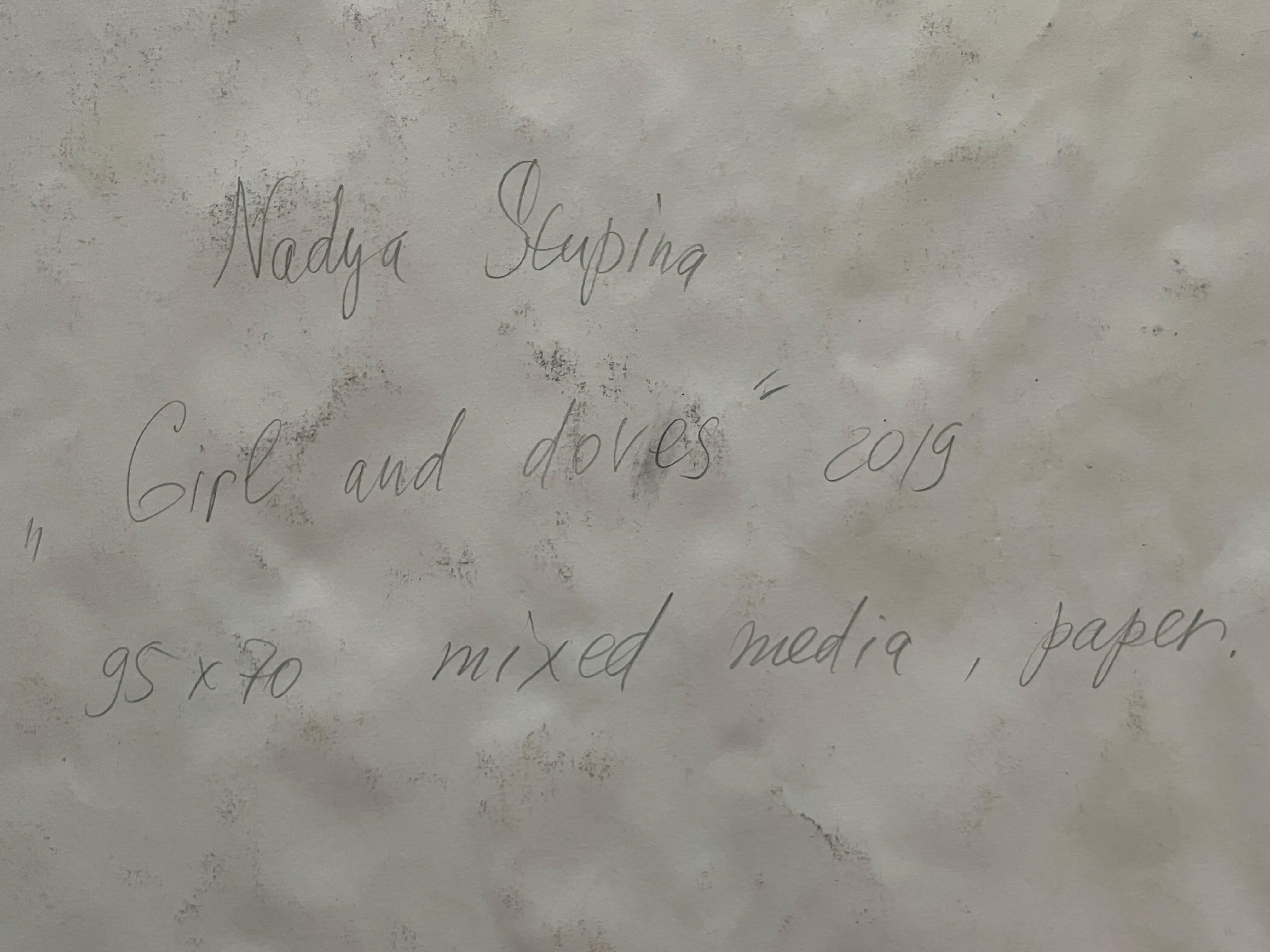 Nadezda Stupina"Mädchen und Tauben" Original figurative Malerei. Große Vertikale auf Papier.2019
