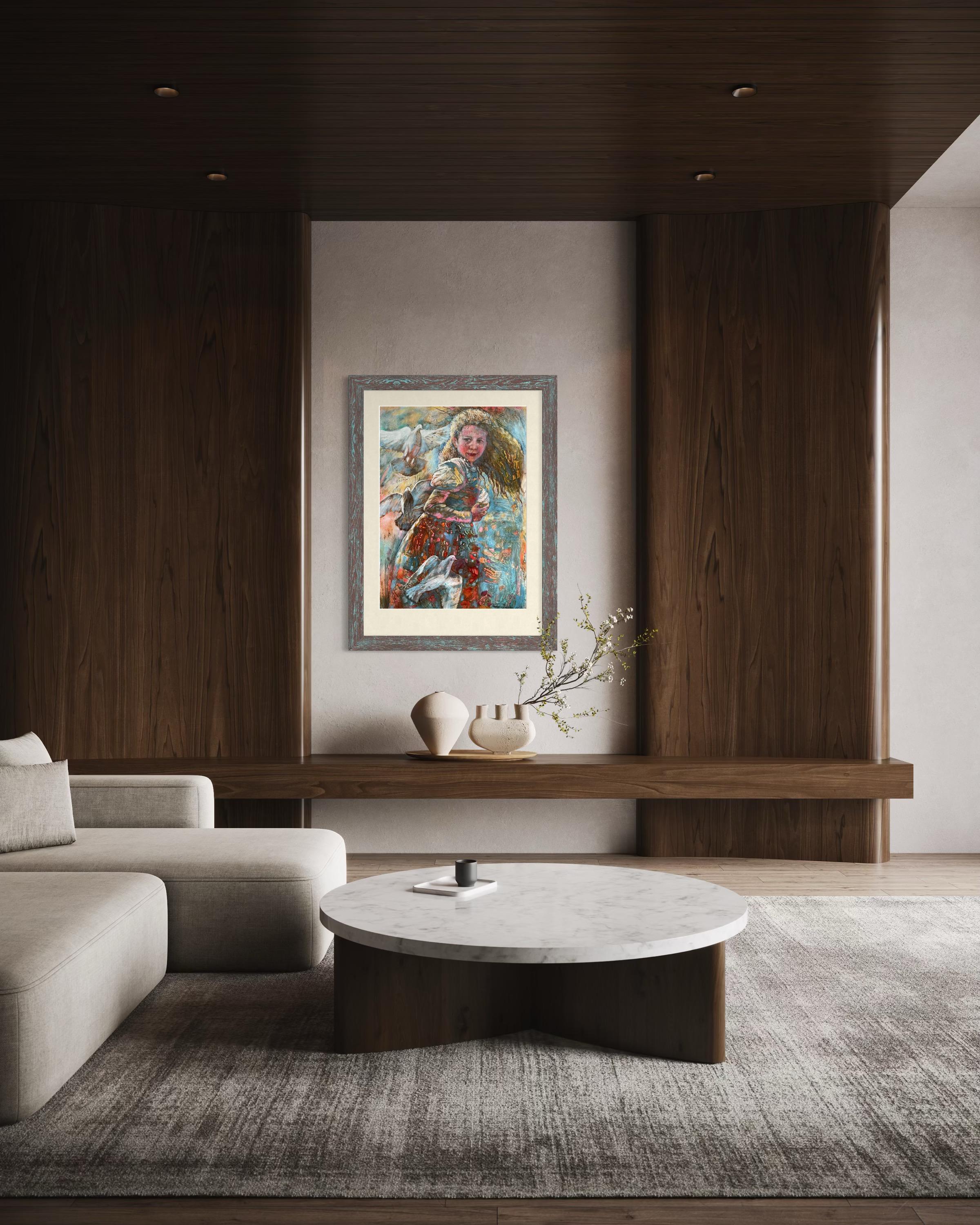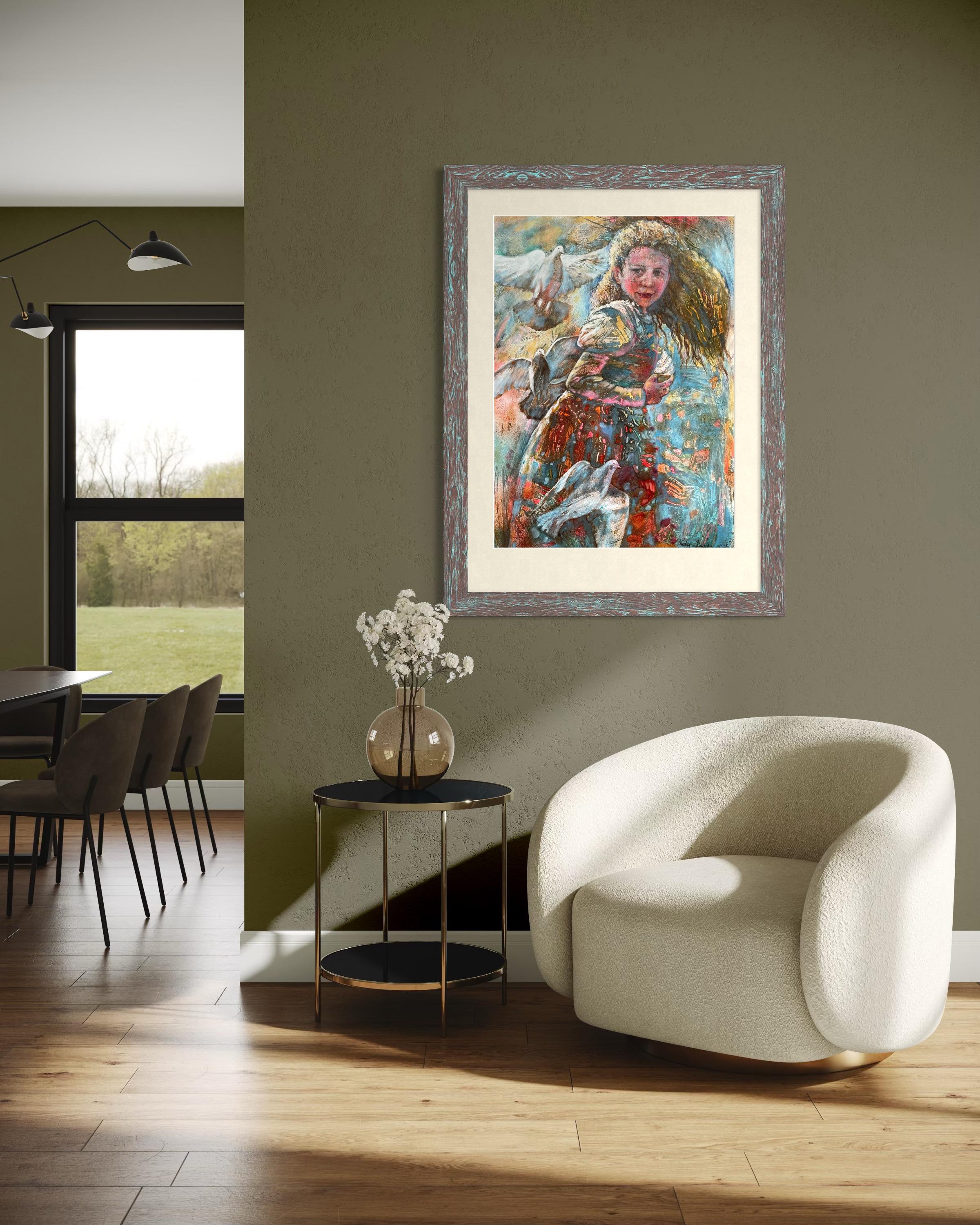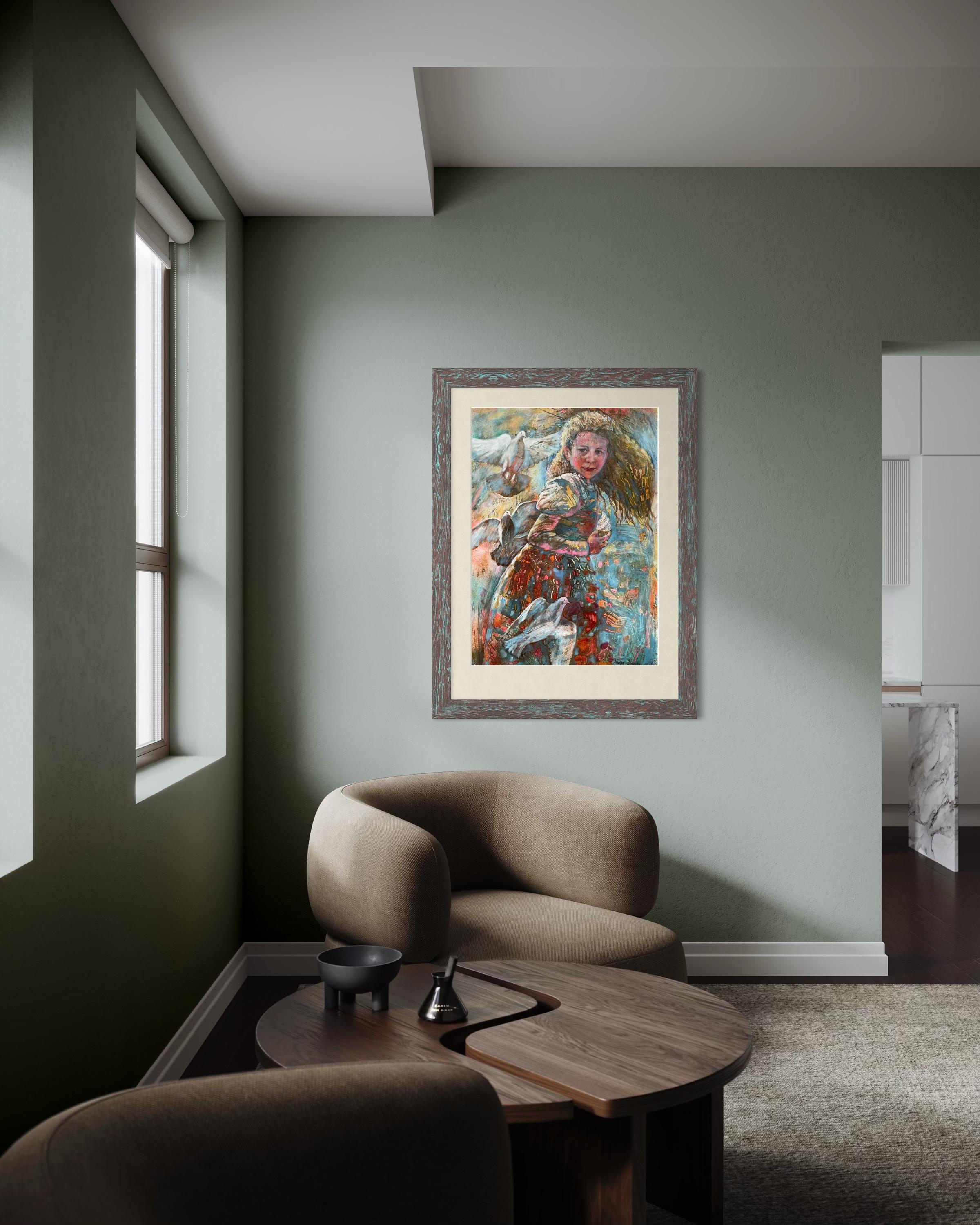 Dieses bezaubernde Kunstwerk zeigt ein junges Mädchen inmitten eines Wirbels von ätherischen Tauben und verbindet Realismus mit traumhaften Elementen. Der Ausdruck des Kindes strahlt Unschuld und Staunen aus, sein Haar weht wild, als würde es von einer sanften Brise erfasst. Die Tauben, die Frieden und Freiheit symbolisieren, umgeben sie dynamisch, ihre Flügel sind mit weichen, fließenden Strichen gemalt, die ein Gefühl der Bewegung hervorrufen. Die lebhafte Palette von Blau-, Rot- und Erdtönen geht harmonisch ineinander über und schafft einen lebendigen und doch ruhigen Hintergrund, der die mystische Atmosphäre noch verstärkt. Der meisterhafte Einsatz von Licht und Schatten verleiht der Szene Tiefe und Dimension, so dass es scheint, als würde sie gleich zum Leben erwachen. Das einzigartige Zusammenspiel von lebendigen Farben und feinen Details lädt den Betrachter in eine Welt ein, in der Fantasie und Realität mühelos ineinander übergehen. Dieses fesselnde Stück ist sowohl ein visuelles Vergnügen als auch eine emotionale Reise.