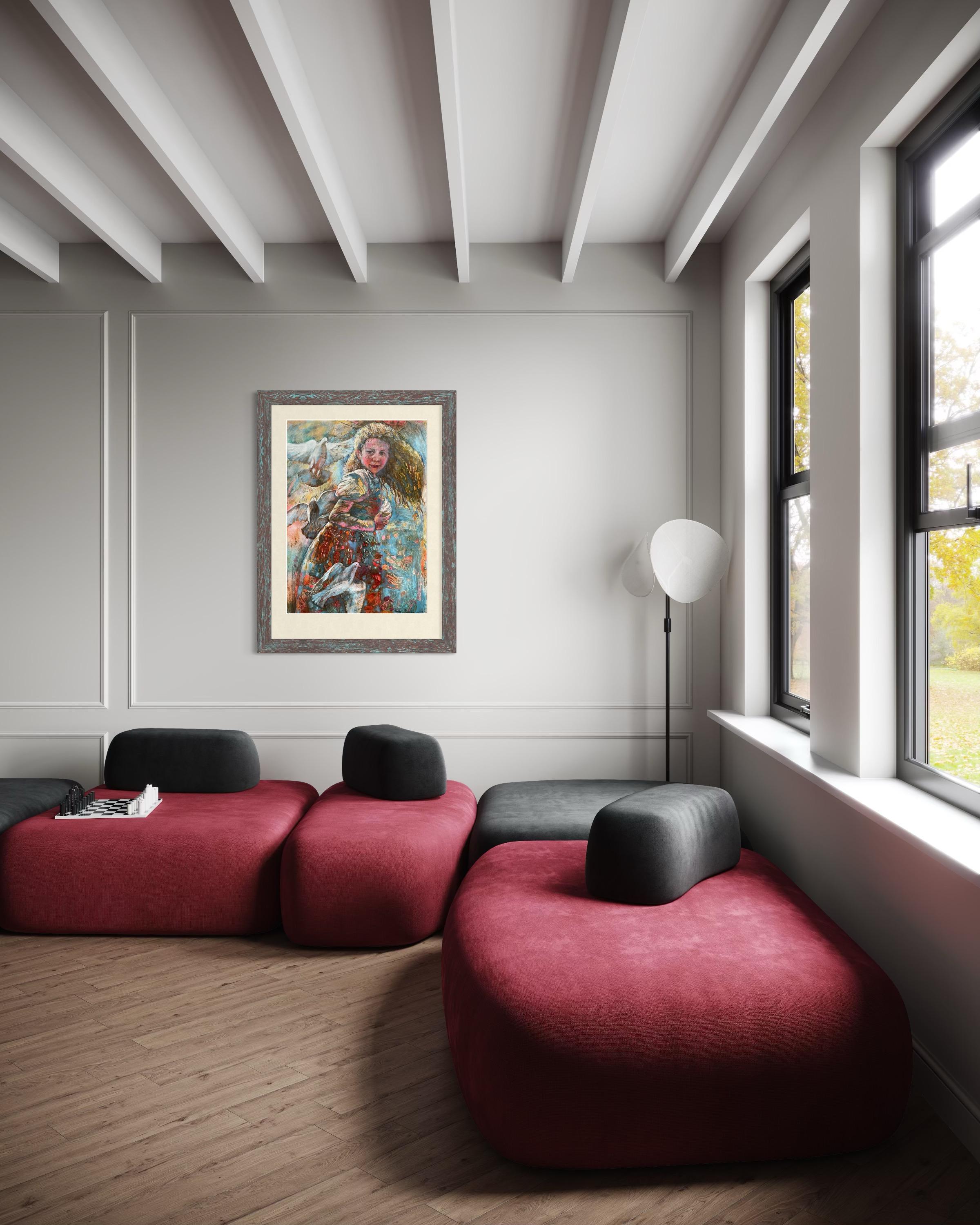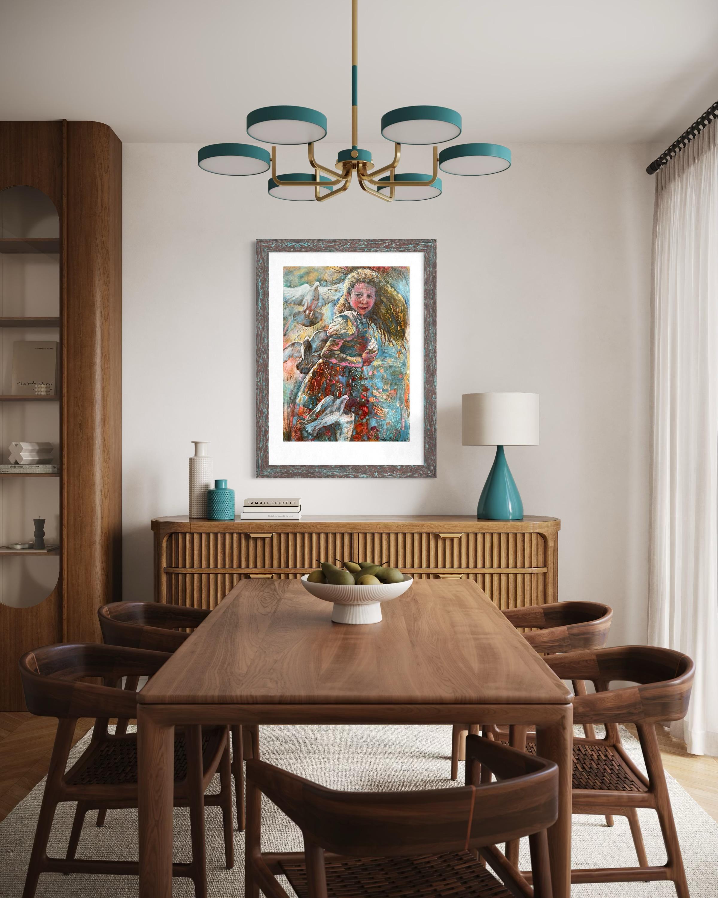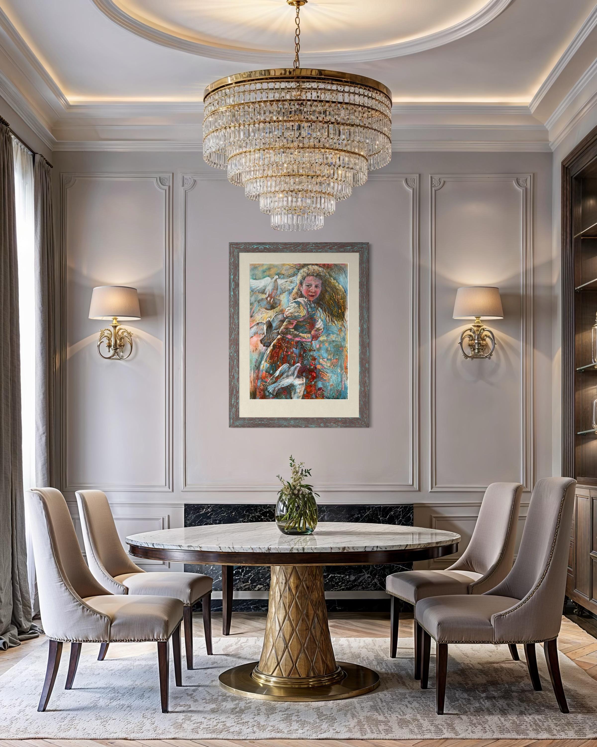 Dieses bezaubernde Kunstwerk zeigt ein junges Mädchen inmitten eines Wirbels von ätherischen Tauben und verbindet Realismus mit traumhaften Elementen. Der Ausdruck des Kindes strahlt Unschuld und Staunen aus, sein Haar weht wild, als würde es von einer sanften Brise erfasst. Die Tauben, die Frieden und Freiheit symbolisieren, umgeben sie dynamisch, ihre Flügel sind mit weichen, fließenden Strichen gemalt, die ein Gefühl der Bewegung hervorrufen. Die lebhafte Palette von Blau-, Rot- und Erdtönen geht harmonisch ineinander über und schafft einen lebendigen und doch ruhigen Hintergrund, der die mystische Atmosphäre noch verstärkt. Der meisterhafte Einsatz von Licht und Schatten verleiht der Szene Tiefe und Dimension, so dass es scheint, als würde sie gleich zum Leben erwachen. Das einzigartige Zusammenspiel von lebendigen Farben und feinen Details lädt den Betrachter in eine Welt ein, in der Fantasie und Realität mühelos ineinander übergehen. Dieses fesselnde Stück ist sowohl ein visuelles Vergnügen als auch eine emotionale Reise.