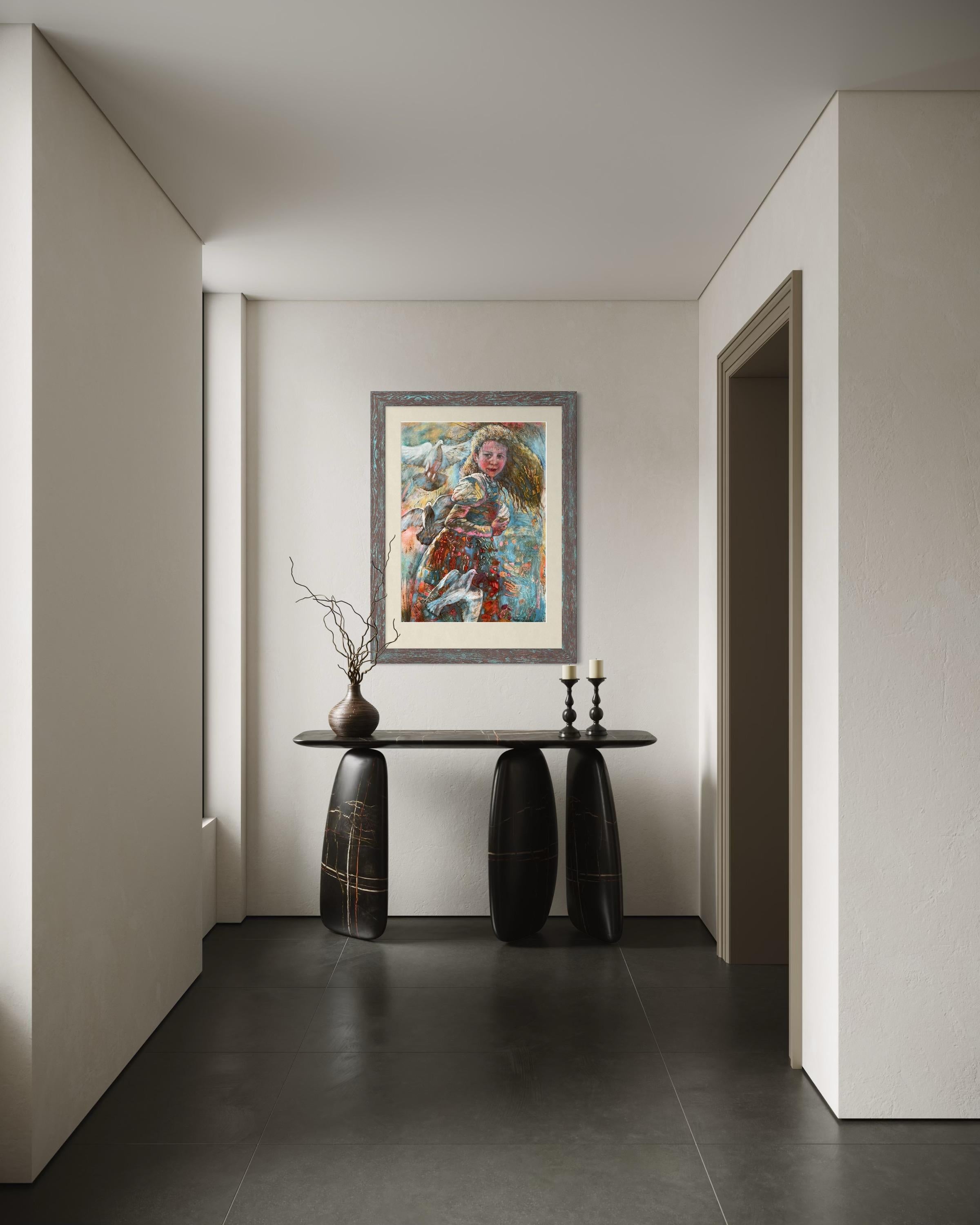 Im Zentrum des Gemäldes steht eine weibliche Figur - ruhig, konzentriert und fast durchscheinend, als gehöre ihre Präsenz nicht nur der irdischen Welt. Sie berührt den Vogel nicht al...