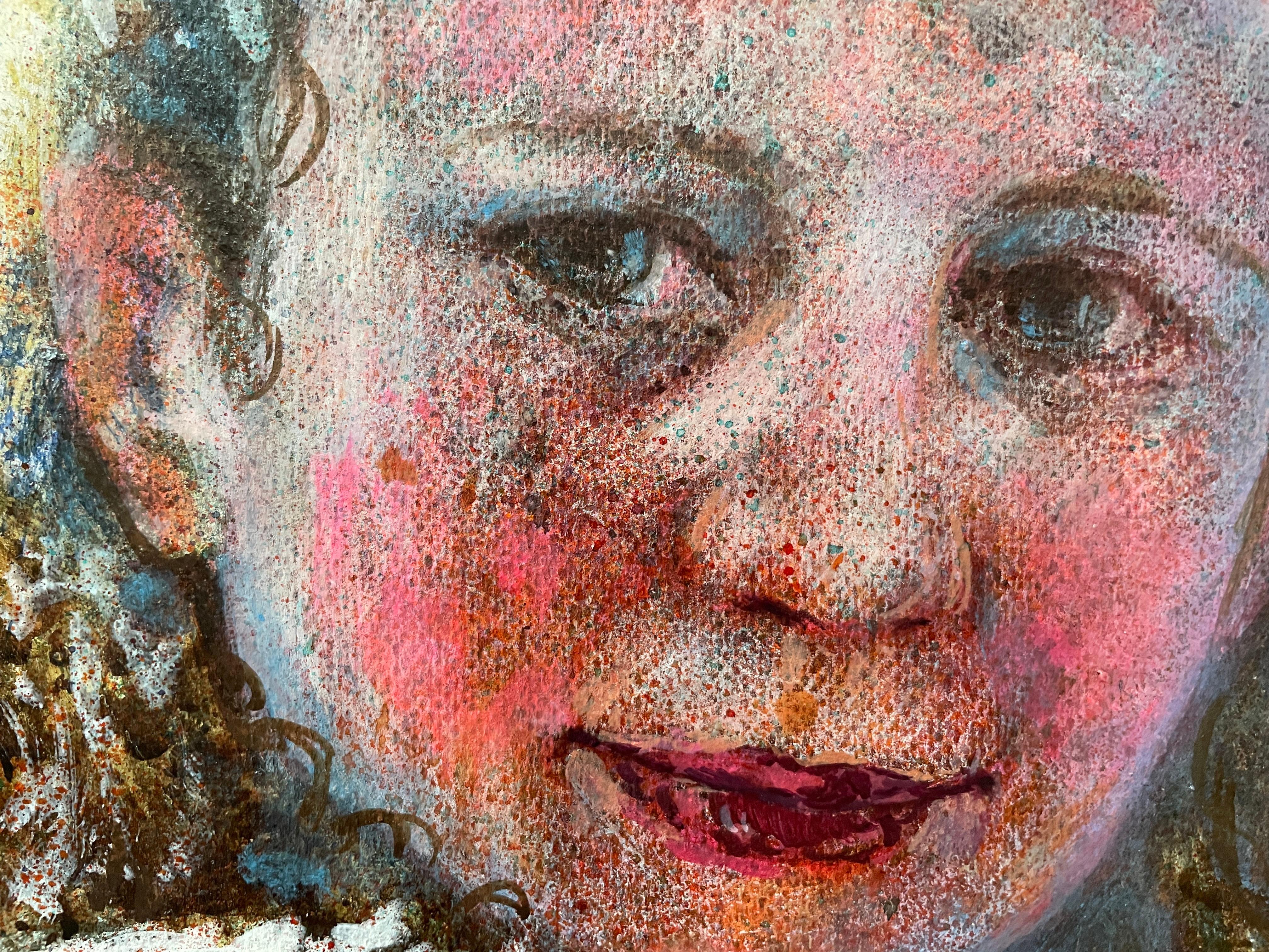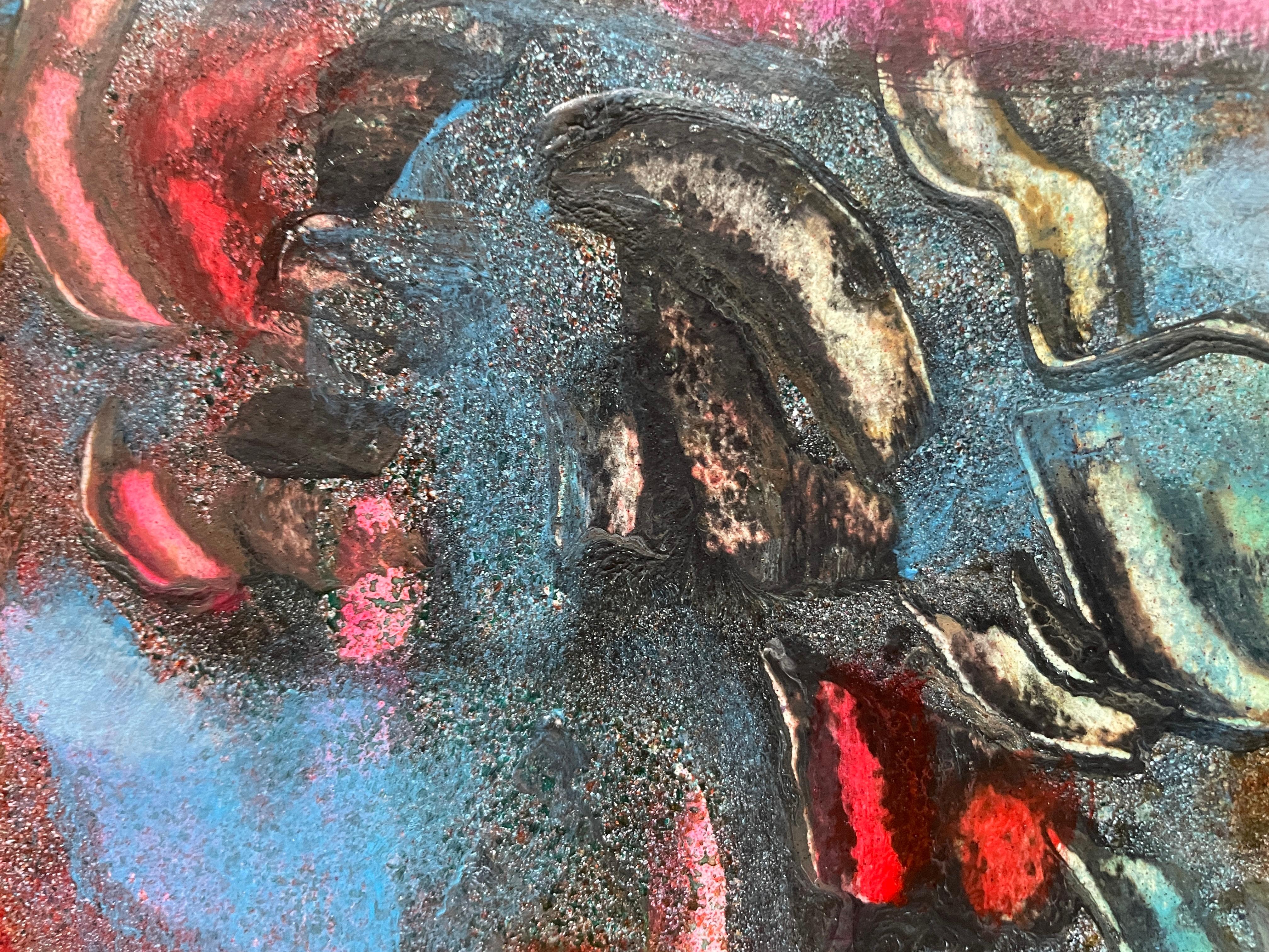 In diesem Gemälde habe ich die taktile Tiefe des Reliefdrucks mit der Fließfähigkeit von Acryl- und Ölfarben kombiniert. Seine figurative Natur fängt die menschliche Essenz inmitten ...