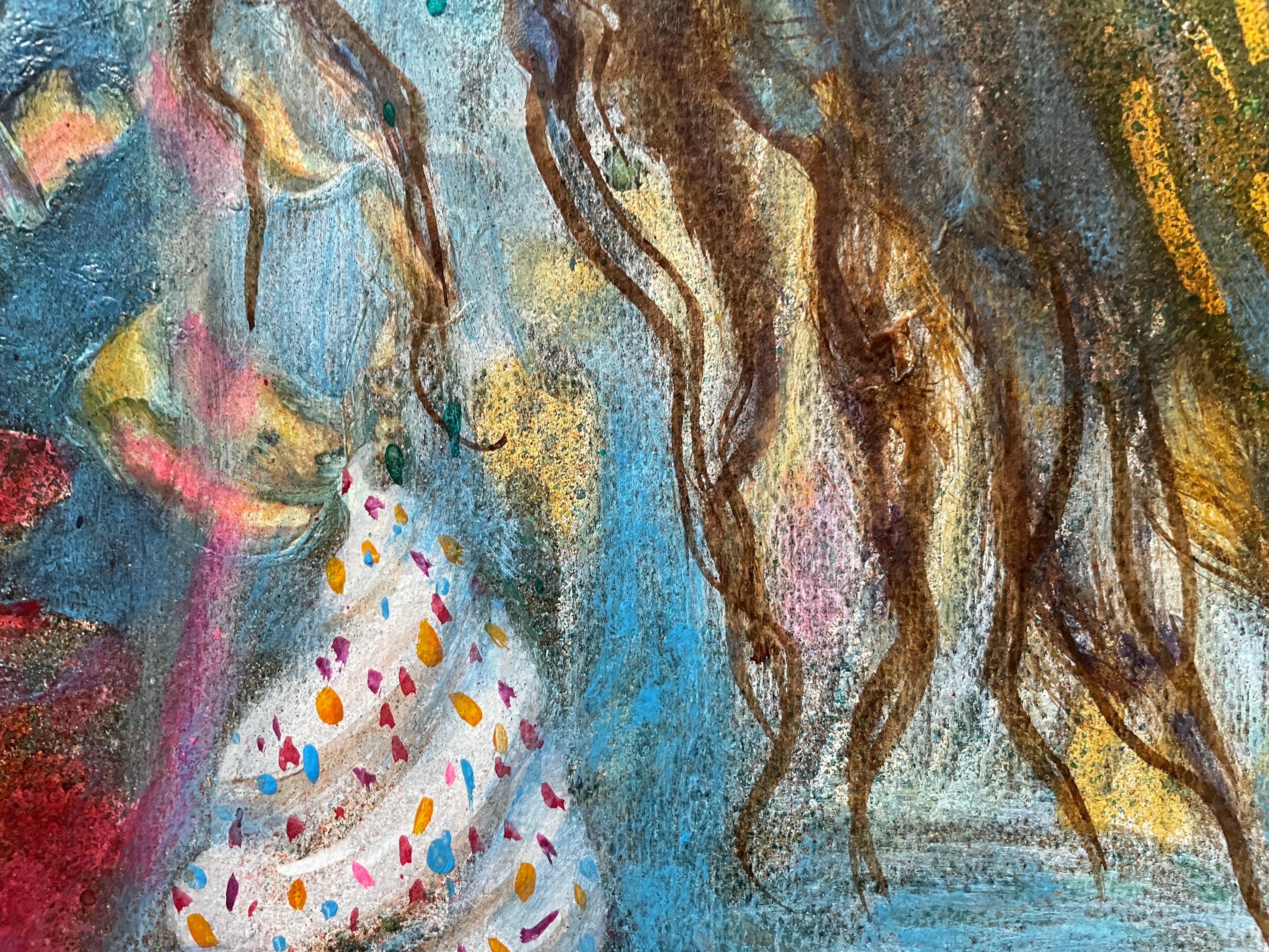 In diesem Ölgemälde habe ich versucht, einen Moment ruhiger Selbstbetrachtung einzufangen, in dem eine Frau, eingehüllt in ein zartes weißes Kleid, allein vor einer lebhaften, fast ä...