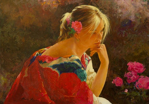 Román Francés erzielt mit seiner hervorragenden Zeichenkunst eine Gesamtwirkung von Harmonie, Frieden und großer Schönheit. Jedes Werk ist erfüllt von dem Gefühl des Lichts, das er in allen seinen Gemälden widerspiegelt. Seine Gemälde sind verschwenderisch eingesetzt, mit dichten Aufbauten in den floralen Gruppierungen und Landschaften, die die weiblichen Figuren und Kinder umgeben, die den Kern und Fokus bilden, von dem alles andere ausstrahlt. Francés' Arbeit spiegelt seine Liebe zur Natur und sein spanisches Erbe wider.