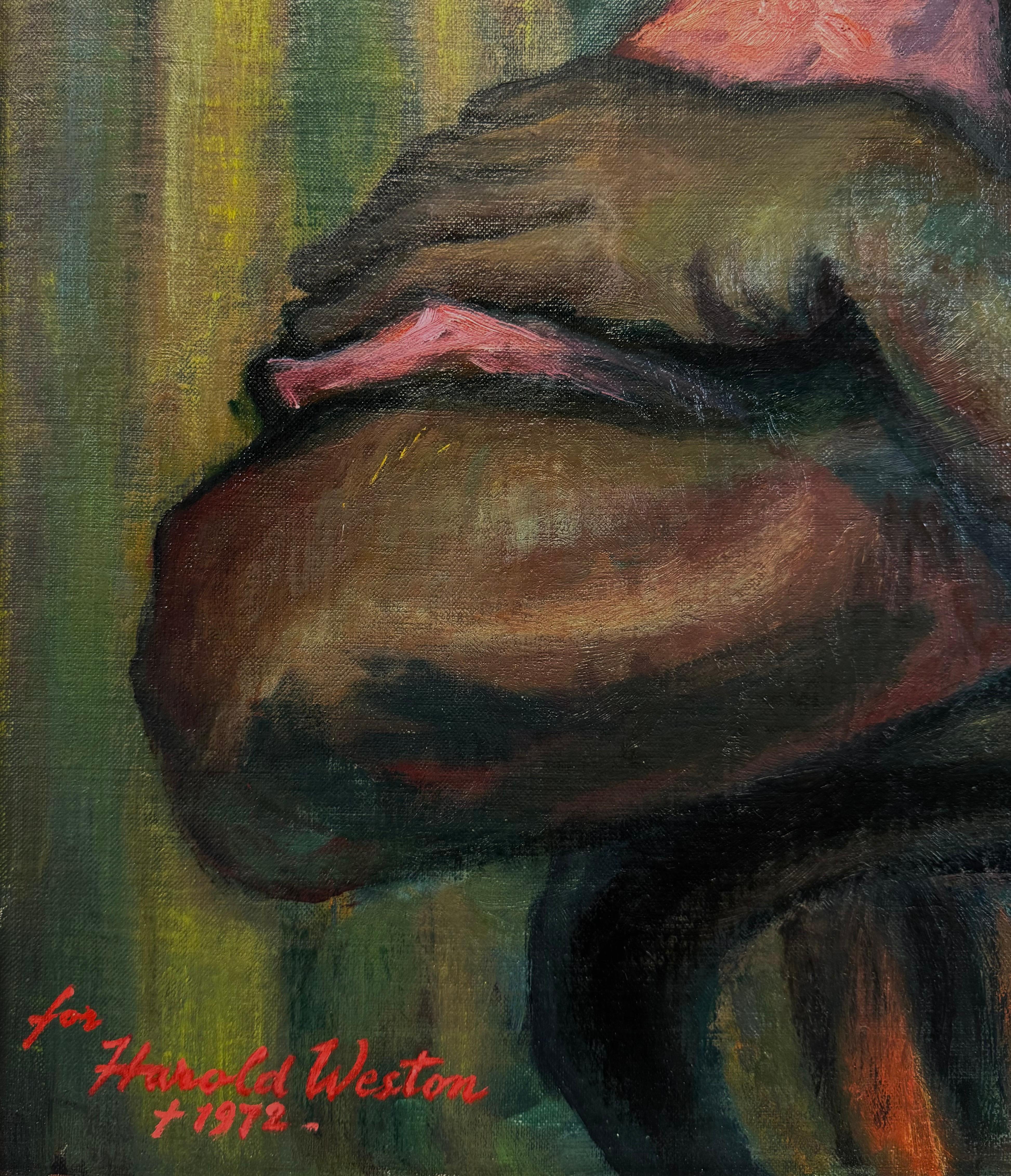 Dieses Gemälde hatte der Künstler zuvor dem Edwin A. Ulrich Museum of Art in Kansas zum Gedenken an Harold Weston, einen anderen bekannten Künstler und Freund von Fried, geschenkt. Der Künstler hat die Widmung unten links eingraviert.