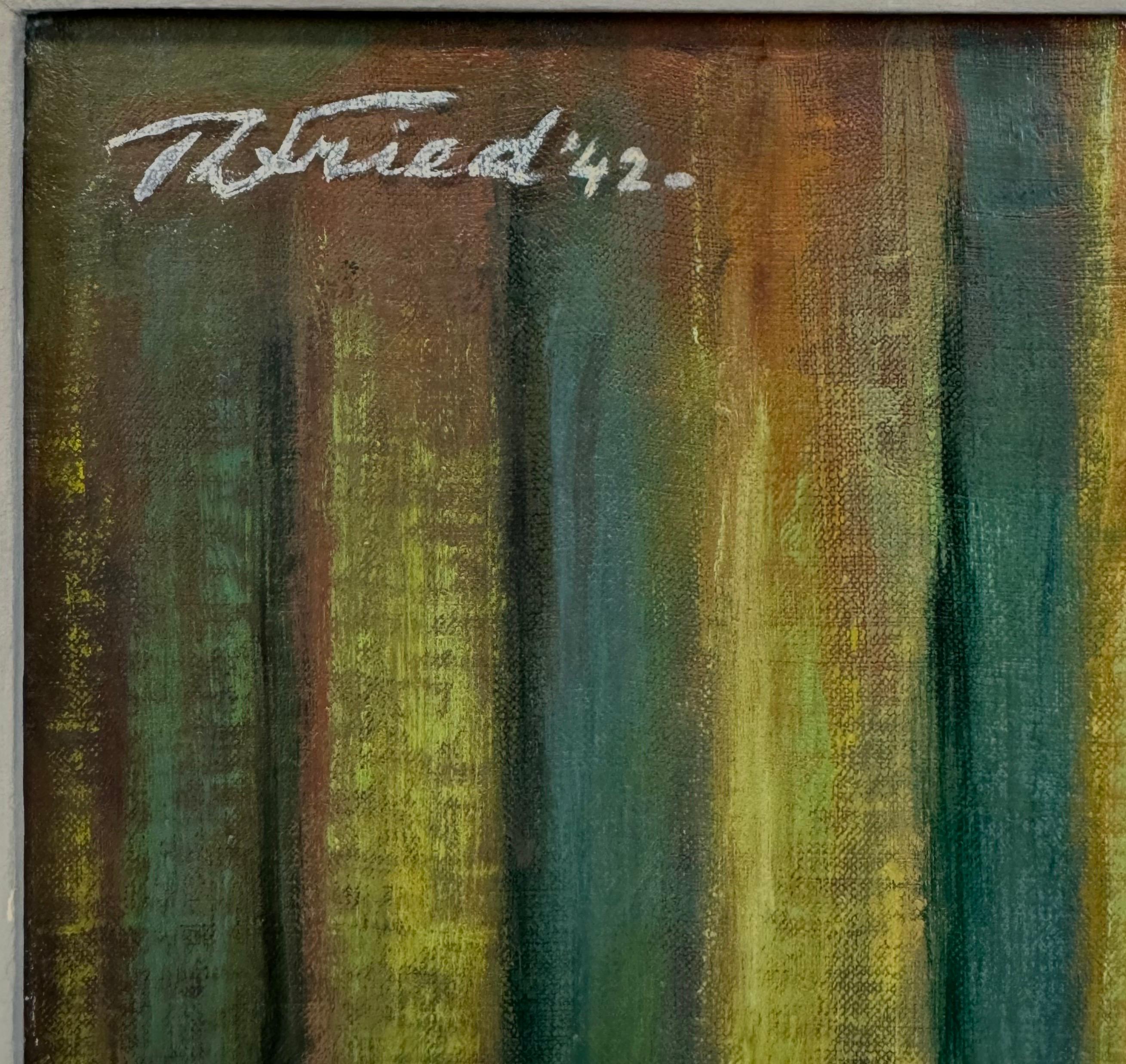 Theodore Fried (1902-1980), geboren in Ungarn, war ein bedeutender Maler der Moderne, der an der Akademie der Schönen Künste in Budapest studierte. Fried floh während des aufkommenden Faschismus aus Europa und arbeitete als Porträtfotograf und Passfälscher, bevor er 1942 ein Notvisum erhielt, um in die Vereinigten Staaten zu fliehen, wo er Teil der florierenden Emigranten-Kunstszene in New York City wurde. Fried, der für seine lebendige Farbgebung und seine gefühlsbetonten Porträts bekannt ist, erforschte eine Vielzahl von Themen, von Antifaschismus bis hin zu unpolitischen, lyrischen Themen, wobei er sich von seinen eigenen Erfahrungen als Flüchtling und seinen Beobachtungen des amerikanischen Lebens inspirieren ließ.