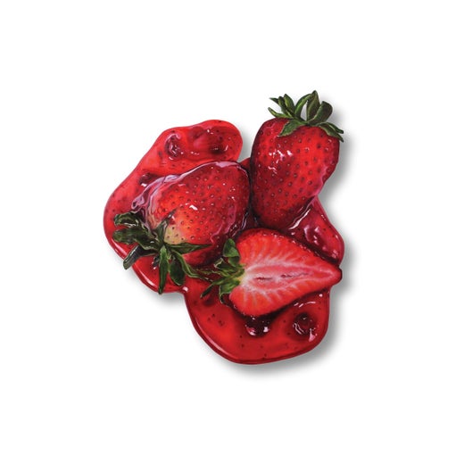 Abra Johnsons "Saucy Strawberry" ist eine lebendige Feier der Süße der Natur, die mit atemberaubendem Realismus auf einer maßgefertigten Birkenholzplatte dargestellt ist. Dieses leuc...