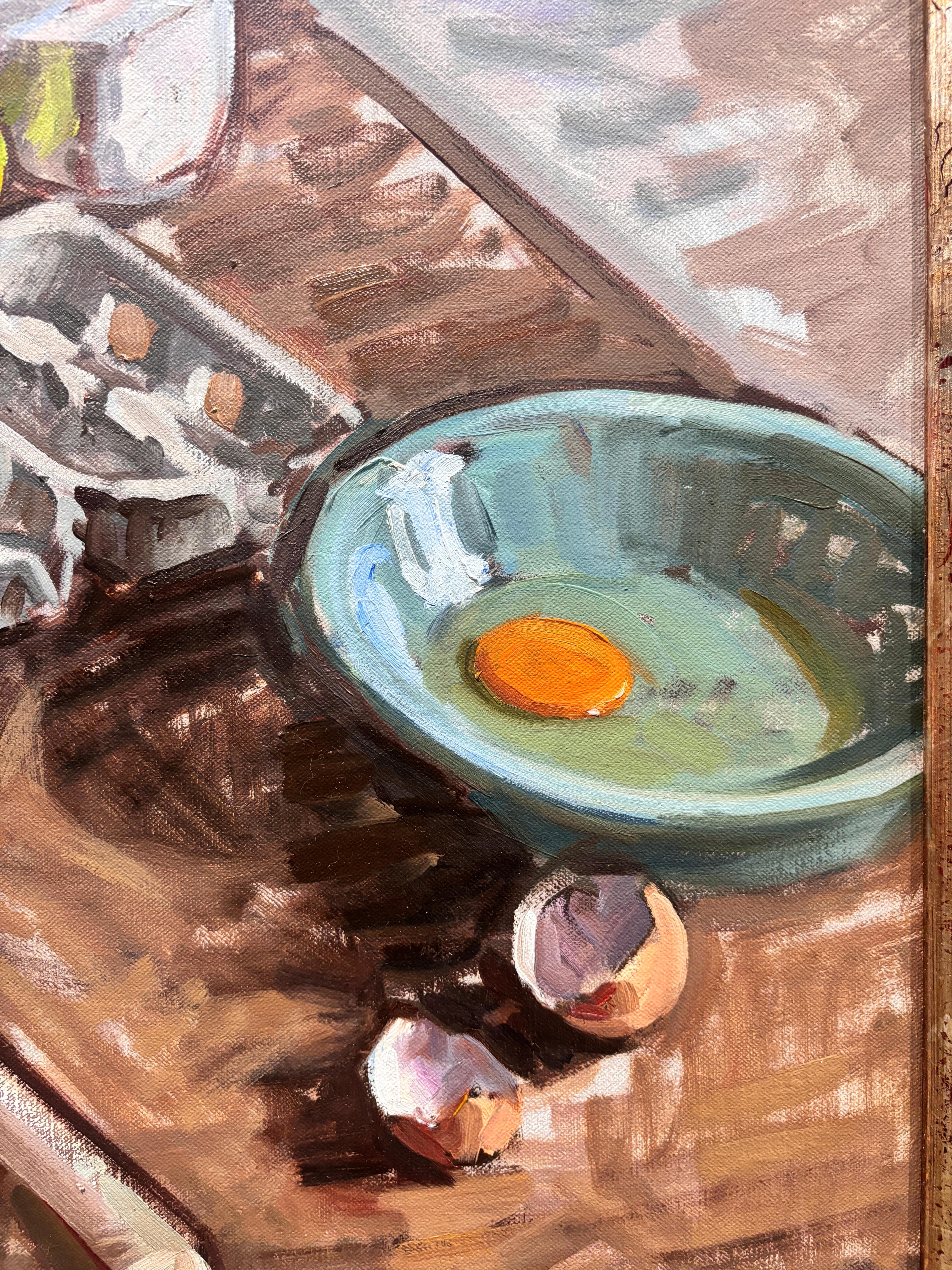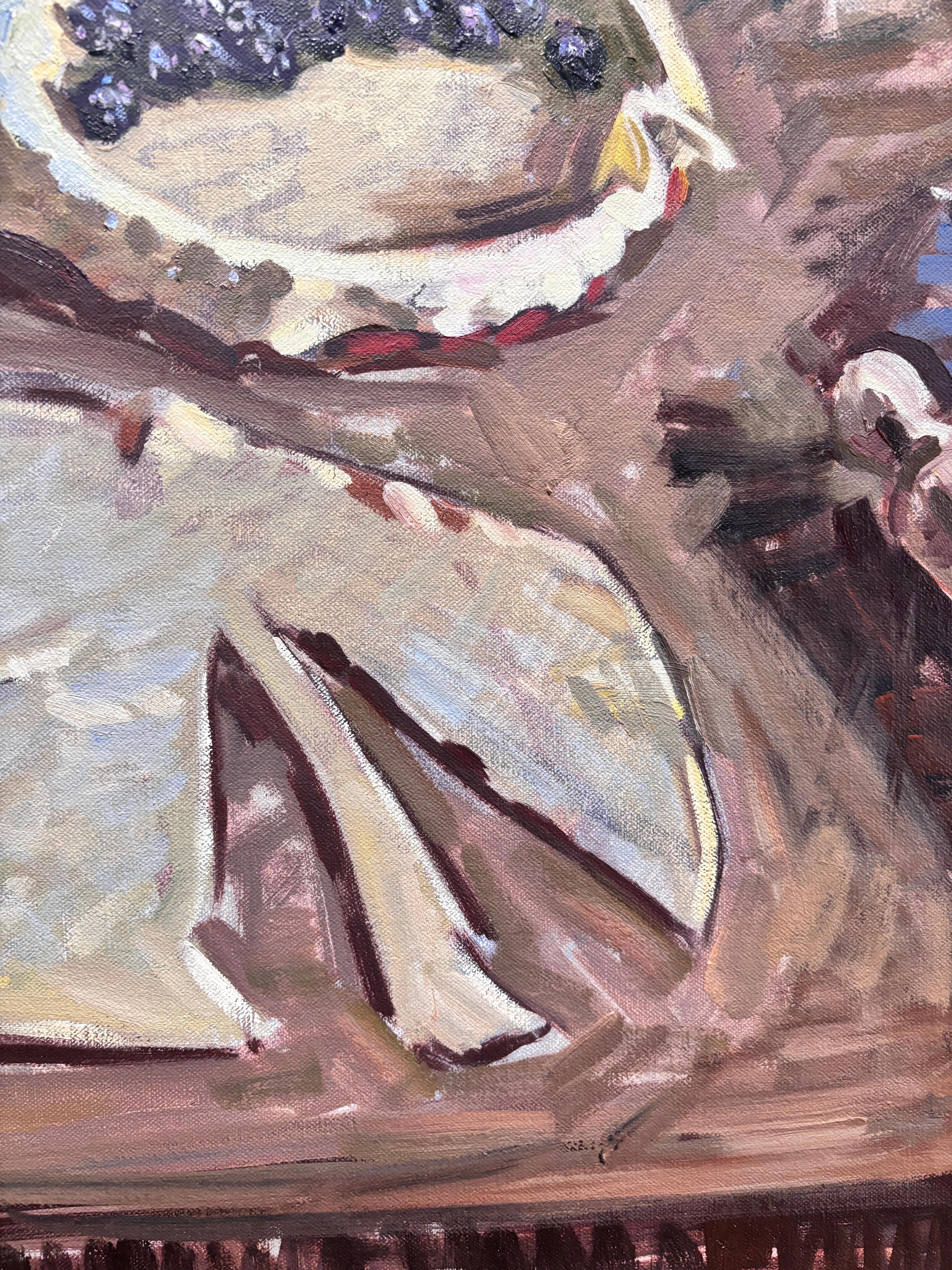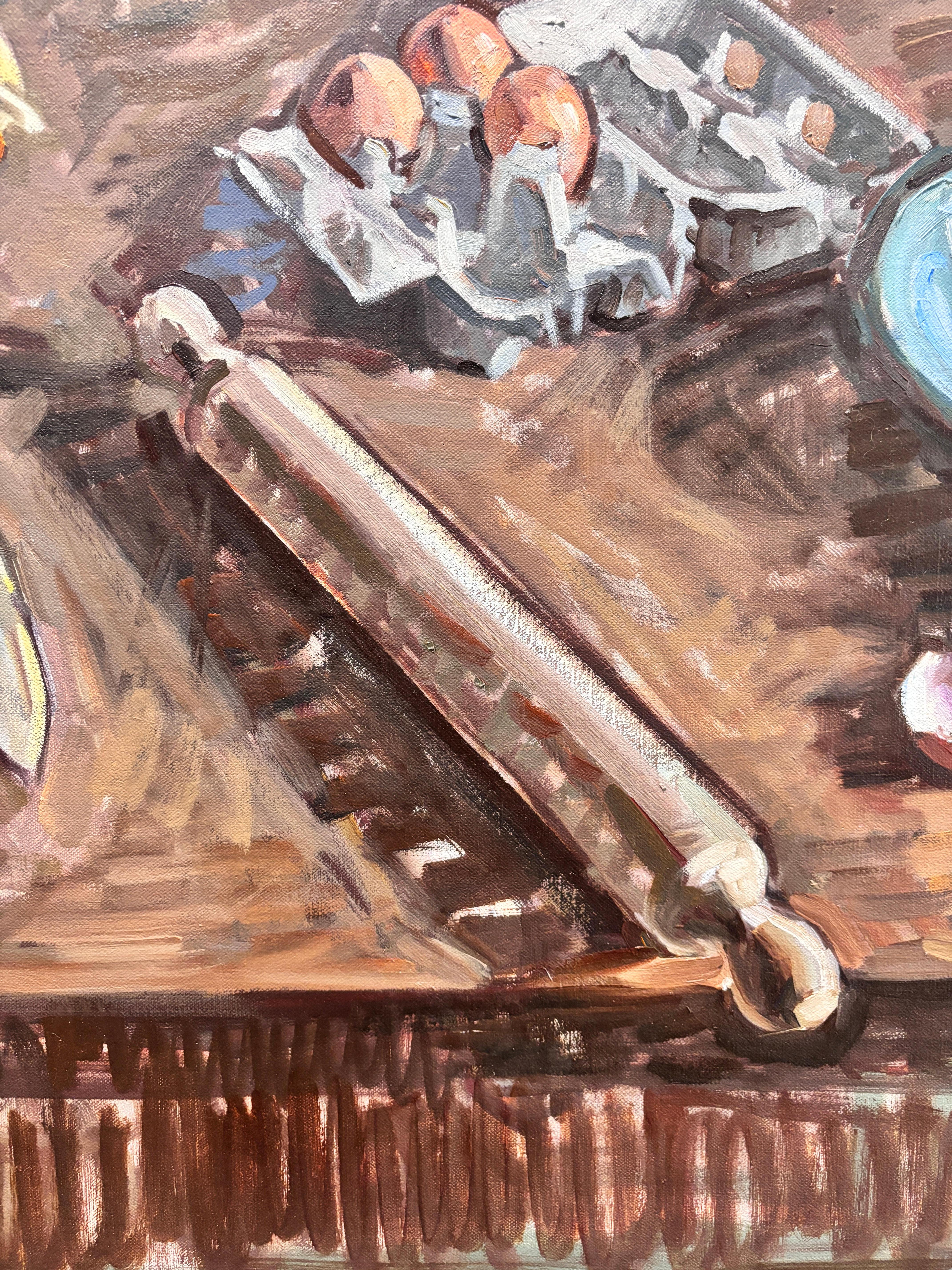 Ein Ölgemälde von Amy Florence (geb. 1989) London), nachdem Florenz von der Stadt aufs Land gezogen war. Sie machte sich mit ihrem inneren Boulanger vertraut und nahm sich die Zeit, einen Kuchen von Grund auf zu backen. Dieses Gemälde ist nicht einfach ein Stilleben, sondern ein Zeugnis idyllischen, pastoralen Lebens.
