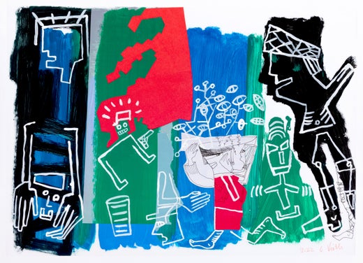 Die Malerin und Grafikerin Caroline Veith wurde 1958 in Le Havre geboren. Im Jahr 1982 erhielt sie ihr Diplom an der Ecole Nationale Supérieure des Arts Appliqués et des Métiers d'Art (ENSAAMA). Caroline Veiths Werk führt uns in das Herz eines "mechanischen Universums", das von geschäftigen Wesen bewohnt wird, die in der Aufregung einer unvorhersehbaren Welt gefangen sind. In diesem städtischen Dschungel nimmt jedes Wesen an einem verrückten Wettlauf teil, absurd oder amüsant. Vorausgesetzt, jede kann, wenn möglich, allein oder im Zusammenspiel mit den anderen existieren? Alles schwebt auf den labyrinthischen Entwürfen, in denen der Künstler versucht, den Faden der Existenz zu entwirren, bewaffnet mit einem dicken Mantel von Schichten. Es ist ein Kampf zwischen der Großen Ordnung und der Kleinen Unordnung. Wer wird gewinnen? DIE UNERMESSLICHEN EINLEGEARBEITEN DER REALITÄT (AUSZUG) Heute hat Caroline Veith eine wirklich ungewöhnliche Art entwickelt, verschiedene Aspekte der Welt zusammenzubringen. Bestimmte Gemälde, meist in kleinem Format, stellen die Interaktionen zwischen zwei oder drei Personen dar, während größere Gemälde größere Gruppen von Menschen zeigen. In beiden Fällen ist jeder dem anderen nahe, während er in einer einsamen Welt lebt. Es ist, als ob man durch das Papier in die Szene hineinschaut. Durch die Verwendung von Transparentpapier kann das Licht neue Schichten zum Vorschein bringen, die sonst unsichtbar geblieben wären. Die Kraft des Papiers liegt in seinem Widerstand gegen alles, vom Vergehen der Zeit bis zu den plötzlichen und heftigen menschlichen Gesten. Man kann und muss das Papier kratzen, graben, biegen, verdrehen und entfalten, und man muss all dies tun, um endlich den Lebensatem zu befreien, den es in sich birgt. Das Papier ist das Gewand der Träume. Die neue Methode, auf Pauspapier zu arbeiten, verleiht den Werken einen grenzenlosen Maßstab. Meistens gibt es keine Farbe, sondern ein Netz von dicken, unterschiedlichen Linien in verschiedenen Farben, die verschiedene Funktionen zum Ausdruck bringen: ein Gesicht formen, eine Richtung angeben, eine Blume wachsen lassen, eine Hand schnitzen, eine Erinnerung zudecken, ein Fragment einer Karte zeichnen, ein Detail einer Erinnerung extrahieren, einen anderen in der Dunkelheit ertränken, einen gelenkigen Arm heben, eine Kraft zum Stillstand zwingen, den Raum sättigen, eine Waffe am Ende aller Hoffnung reichen, eine Straße öffnen, einen Berg versetzen, den Schmerz begraben. Durch das Spiel der unsichtbaren" Oberflächen, auf denen die verschiedenen Elemente des Werks leben, macht Caroline Veith ihre Linie zum Vektor der Probleme. Dies verleiht ihrer Schöpfung eine magische Kraft. JEAN-LOUIS POITEVIN - SCHRIFTSTELLER, KUNSTKRITIKER