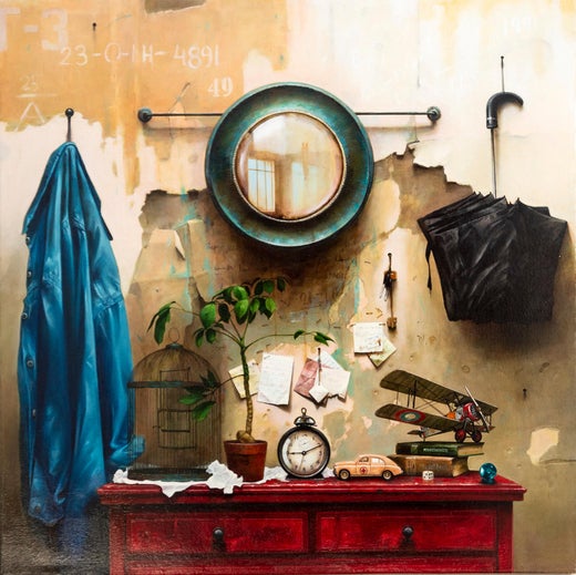 In diesem realistischen Gemälde von Dmitry Yuzefovich wird ein Moment in der Zeit in intimen Details festgehalten. Bekannt für seine nostalgischen Trompe-l'Oeil-Arbeiten, zeigt diese Komposition eines Eingangsbereichs einen liebevoll getragenen Strohhut in der Mitte, umgeben von einem Wirrwarr handgeschriebener Notizen, die an die Wand gepinnt sind, darüber ein Regenschirm auf dem Regal. Yuzefovich verwendet oft die verfallene Wandfarbe und die abblätternden alten Tapeten, um ein Gefühl für die Zeit zu vermitteln. Die Farbpalette ist warm und sanft - Brauntöne, Gelb, Blau, Rosa, Weiß und ein Hauch von Rot.