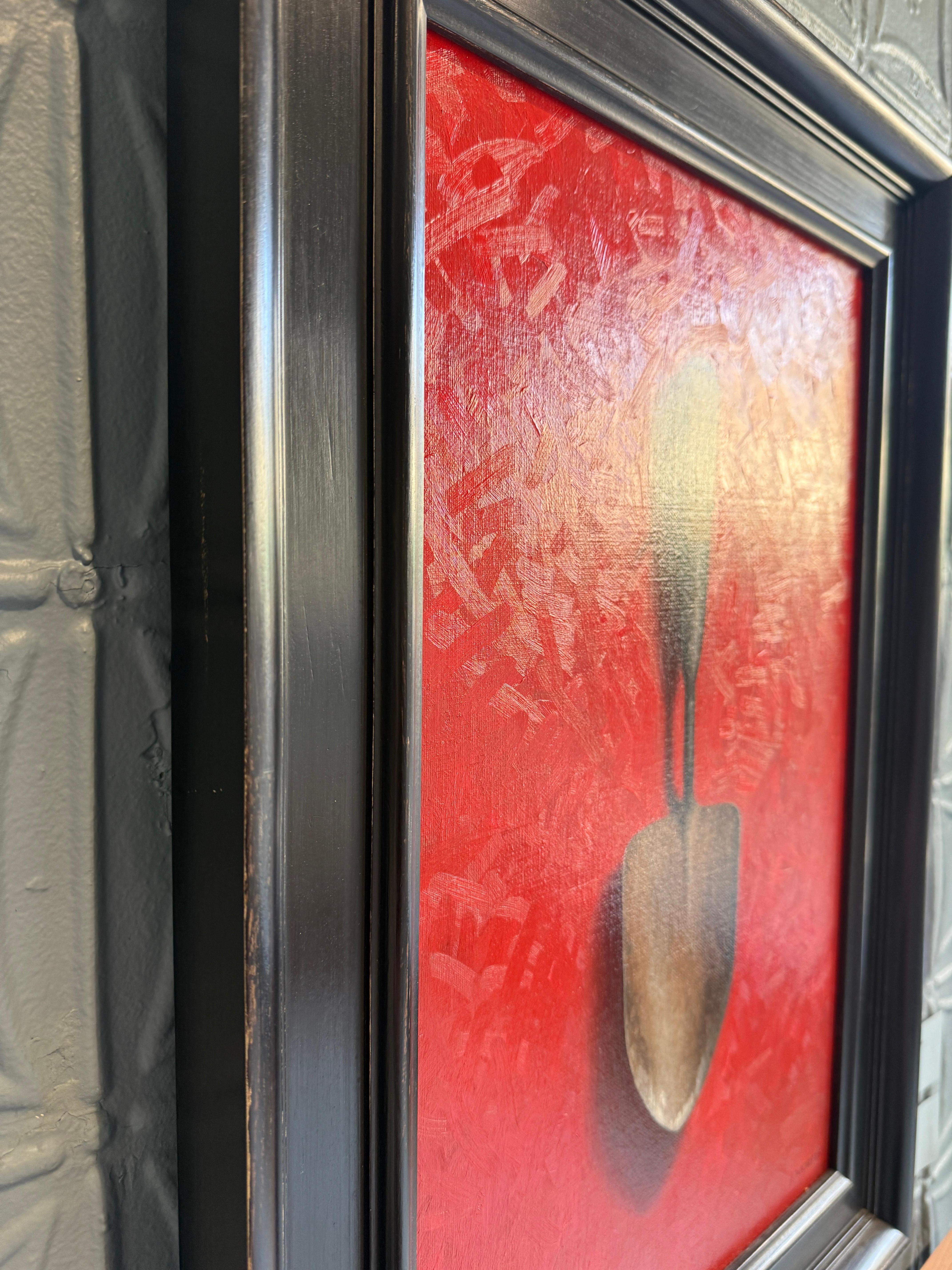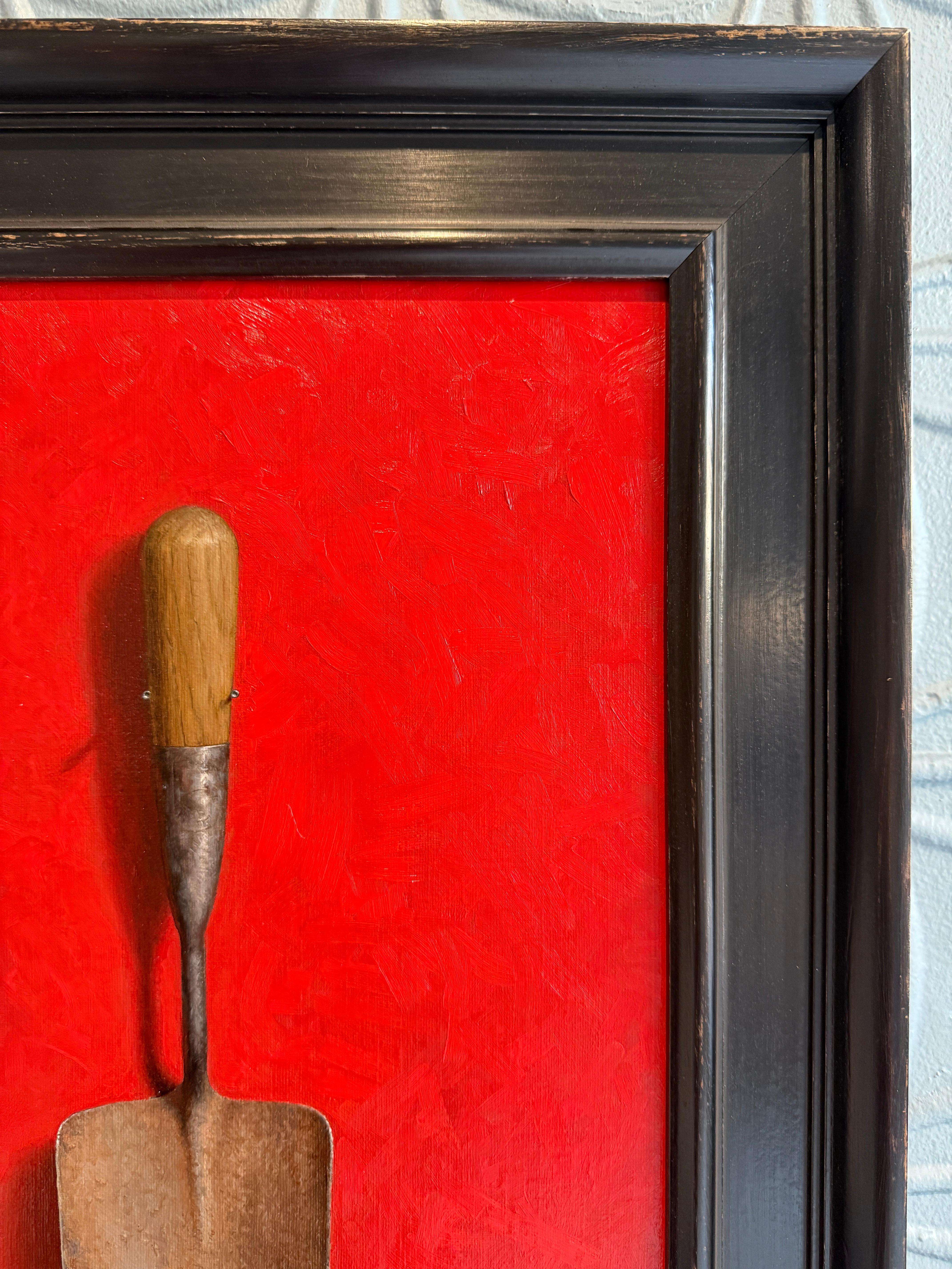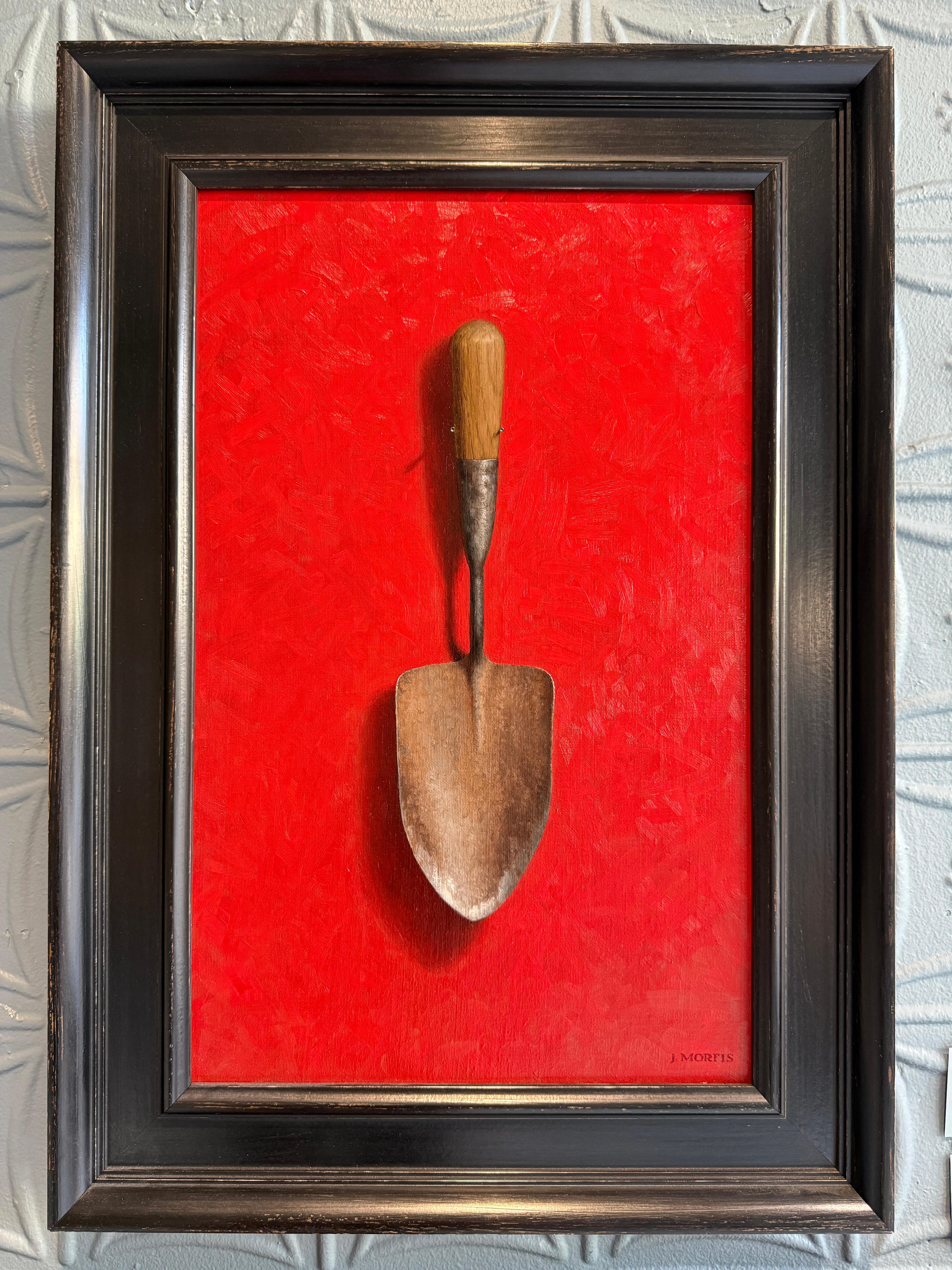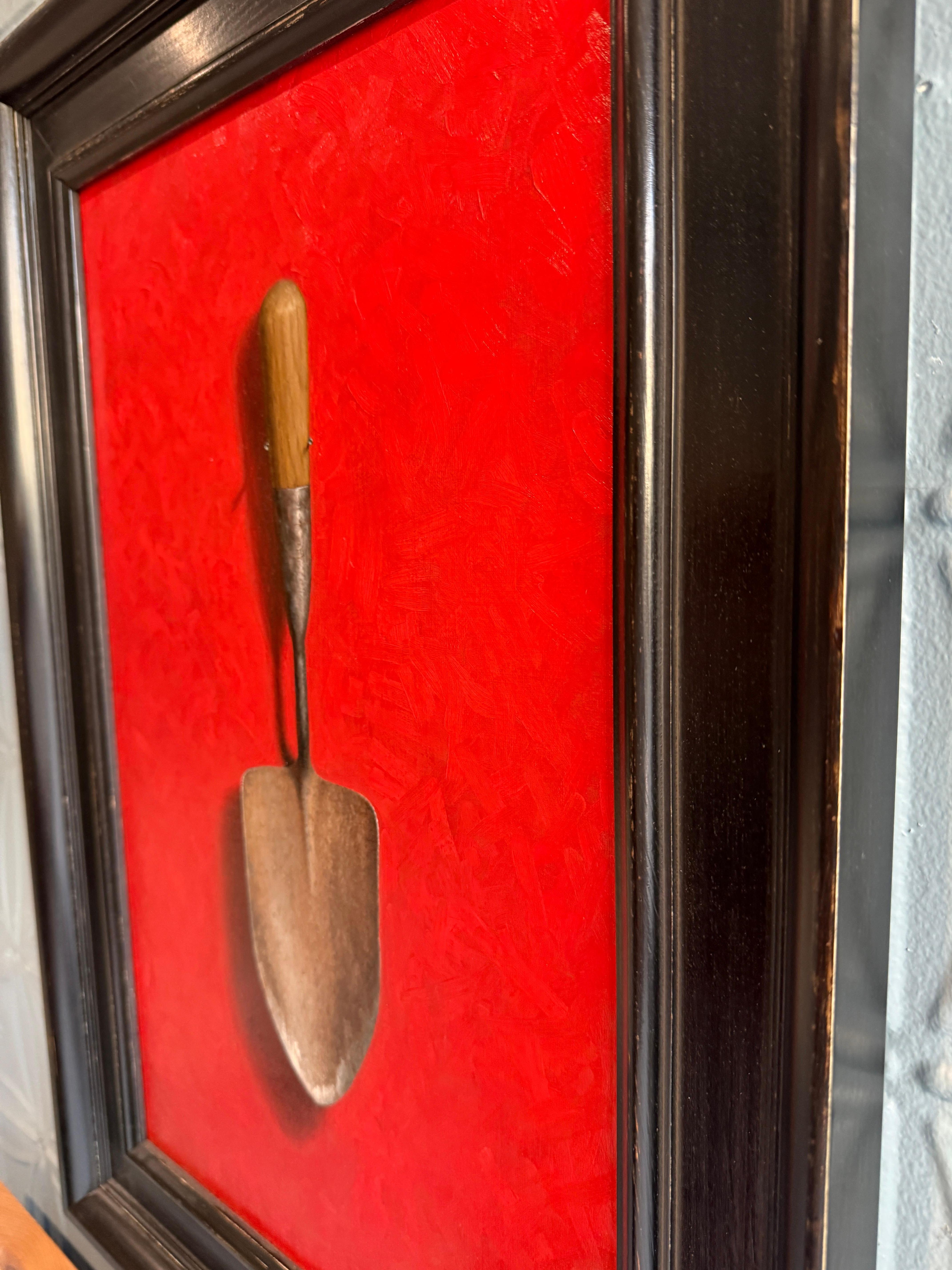 John Morfis"Gartenschaufel auf Rot" hyperrealistisches Ölgemälde, Handkelle, signiert