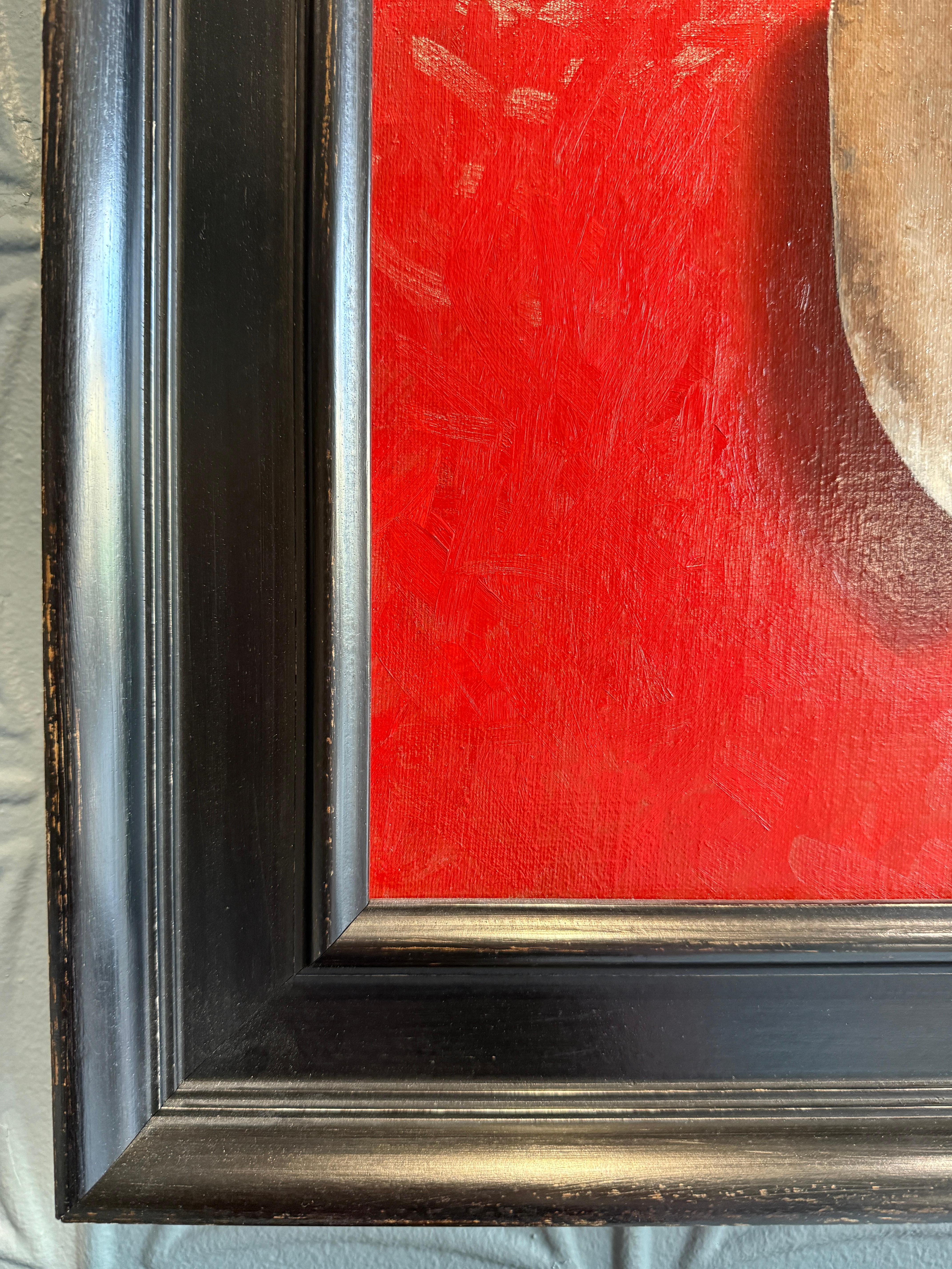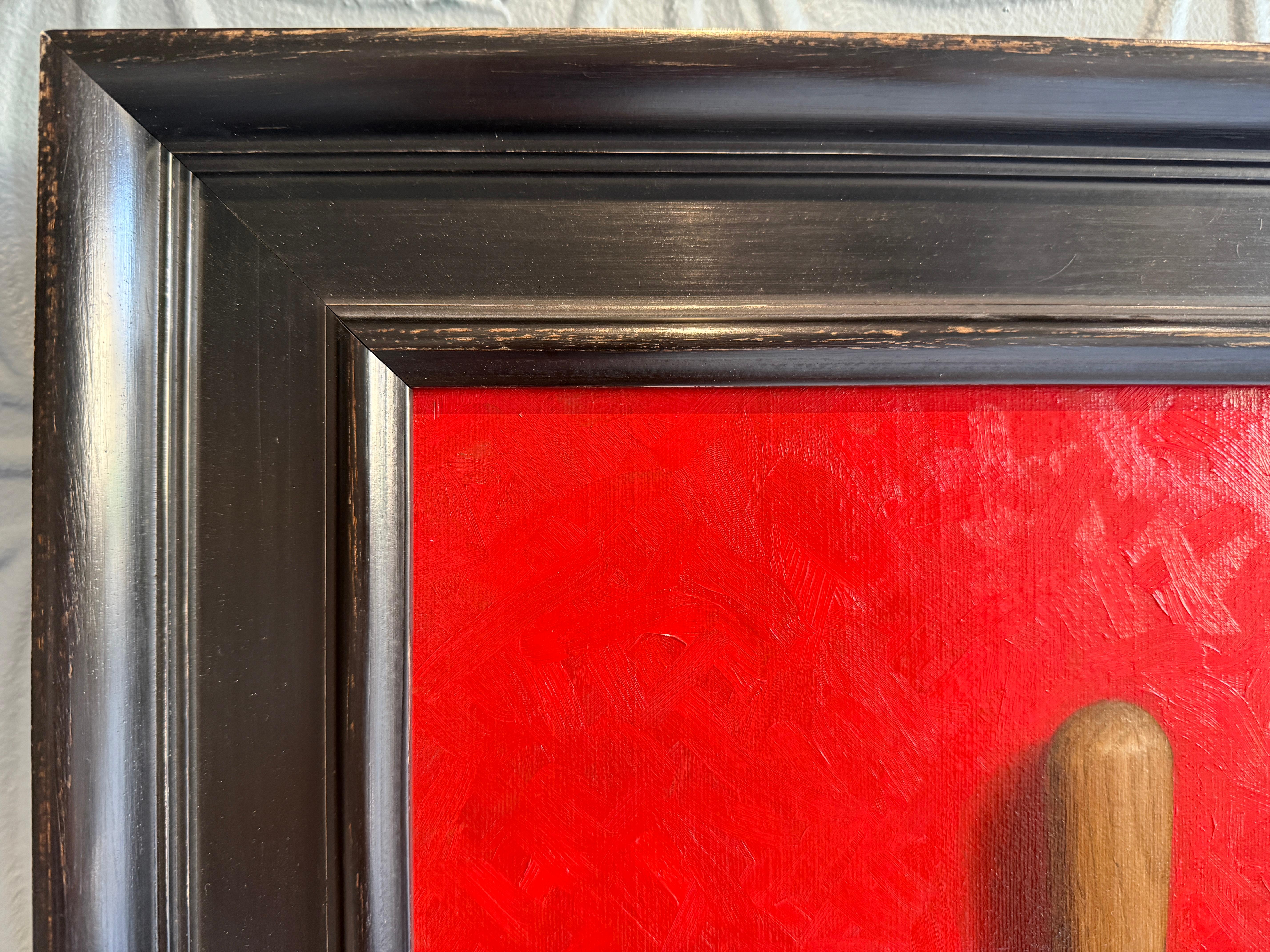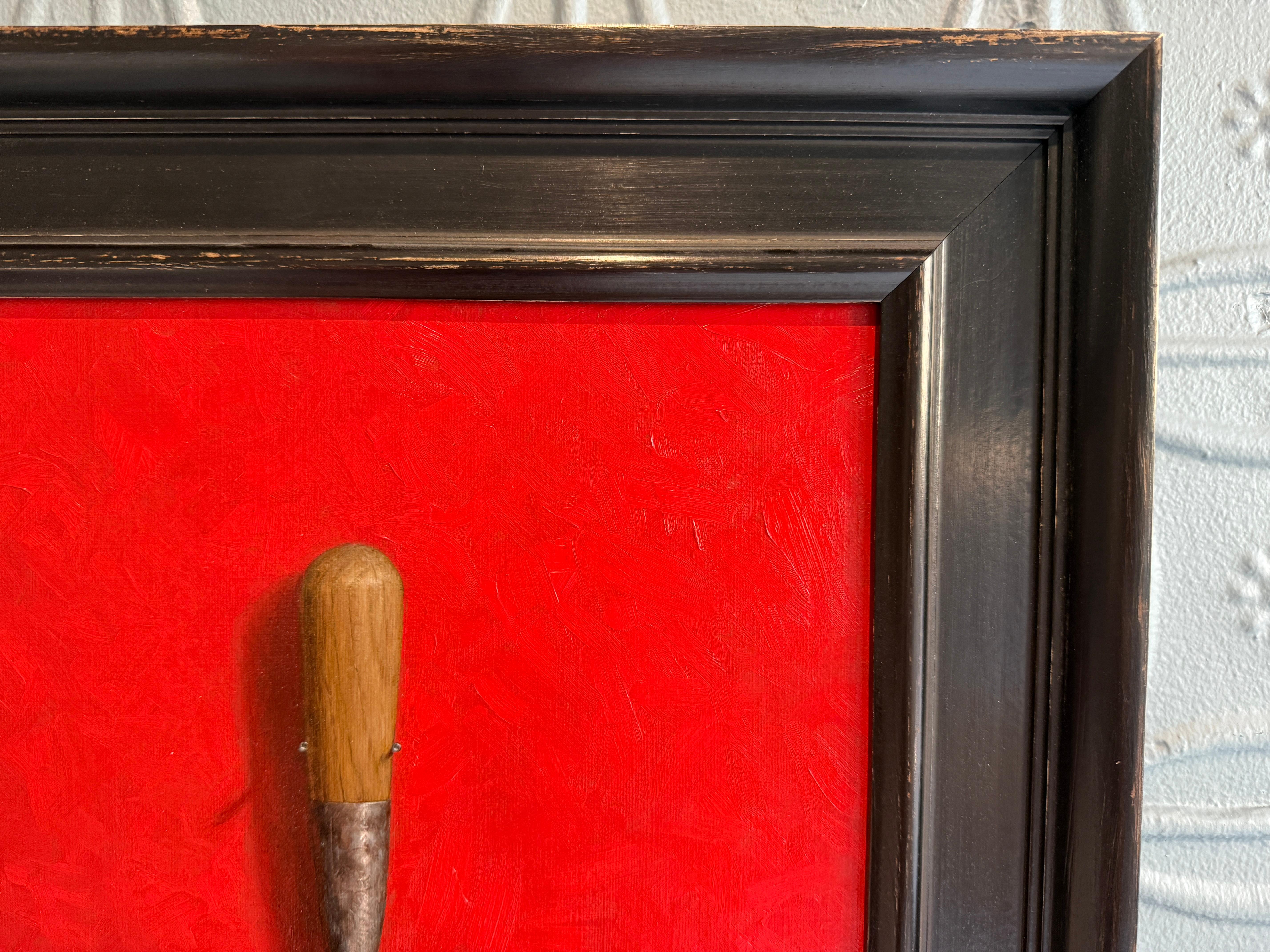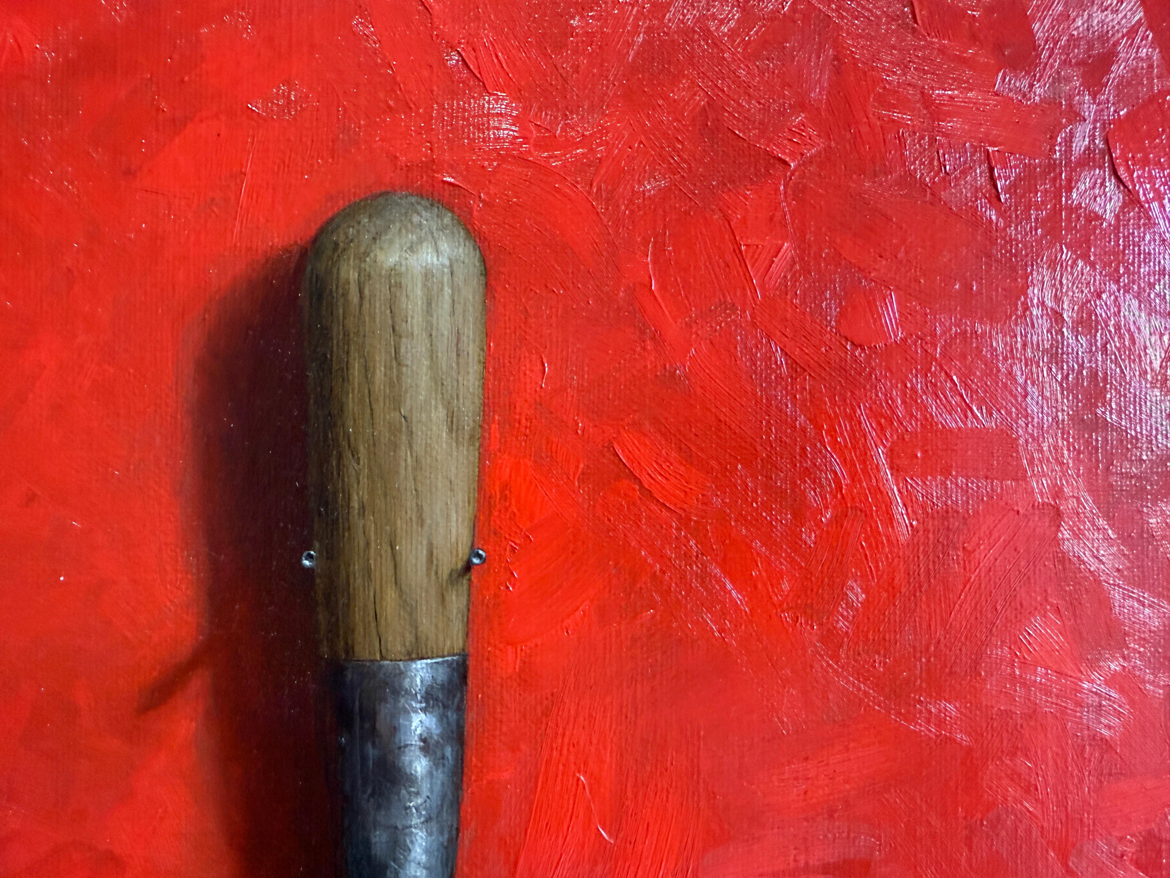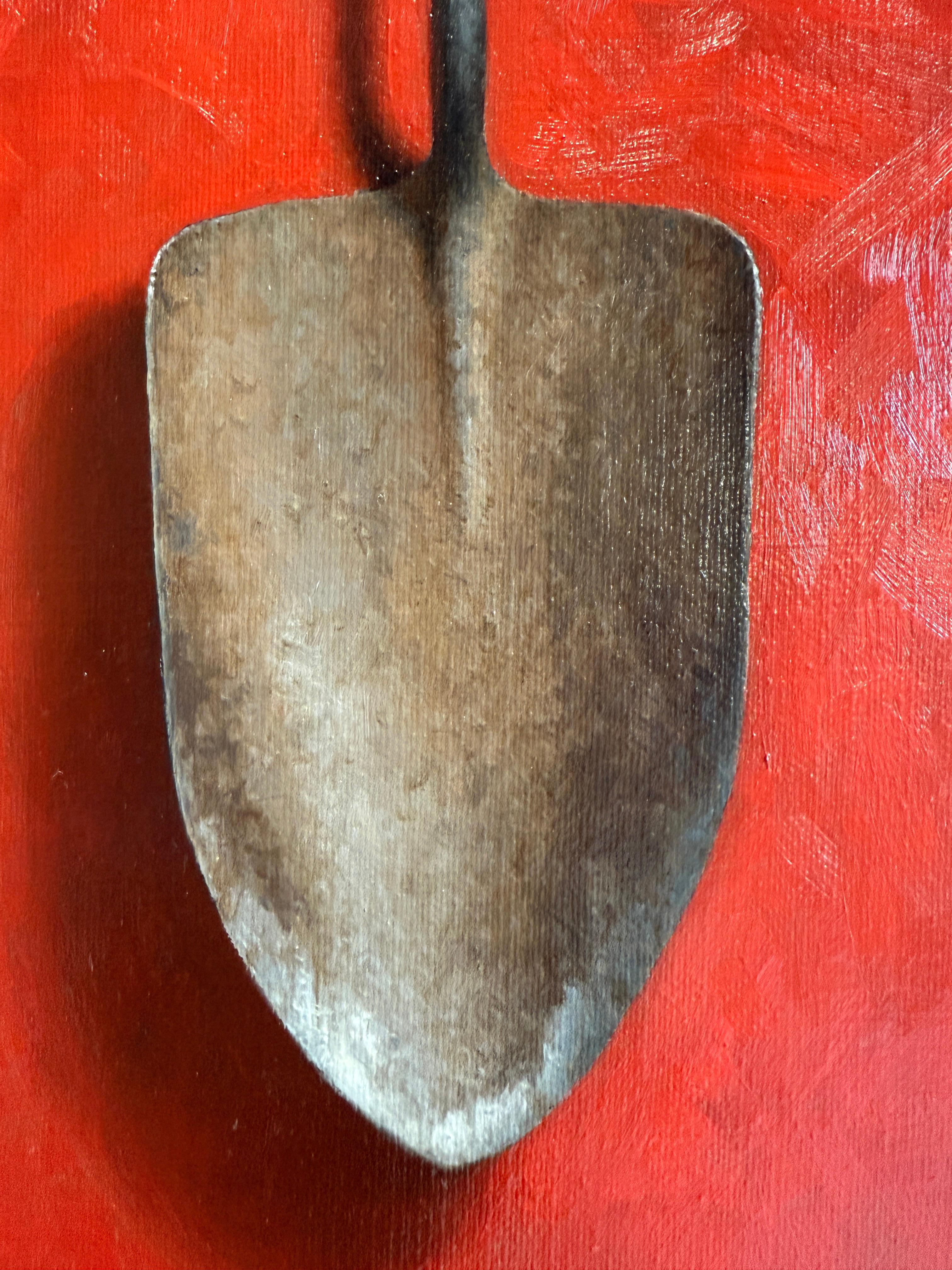 John Morfis"Gartenschaufel auf Rot" hyperrealistisches Ölgemälde, Handkelle, signiert