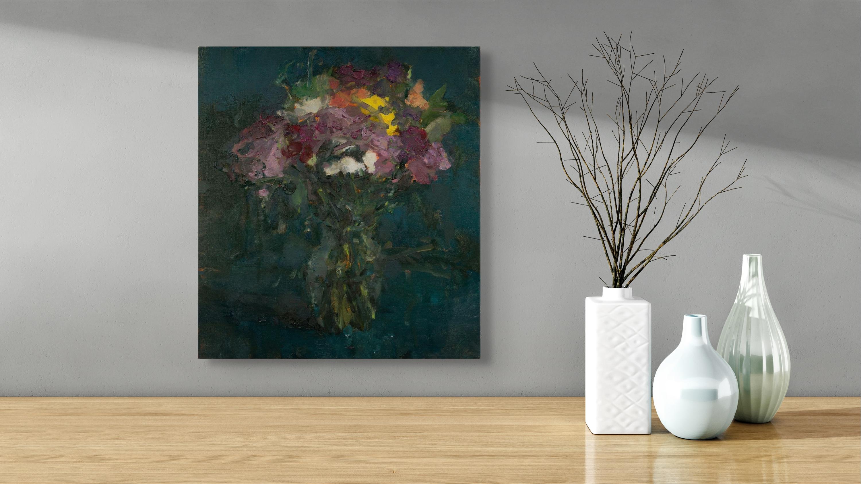 Impressionistisches Blumenstillleben, lebhaftes Blumenstrauß in einer dunklen Vase, Ölgemälde