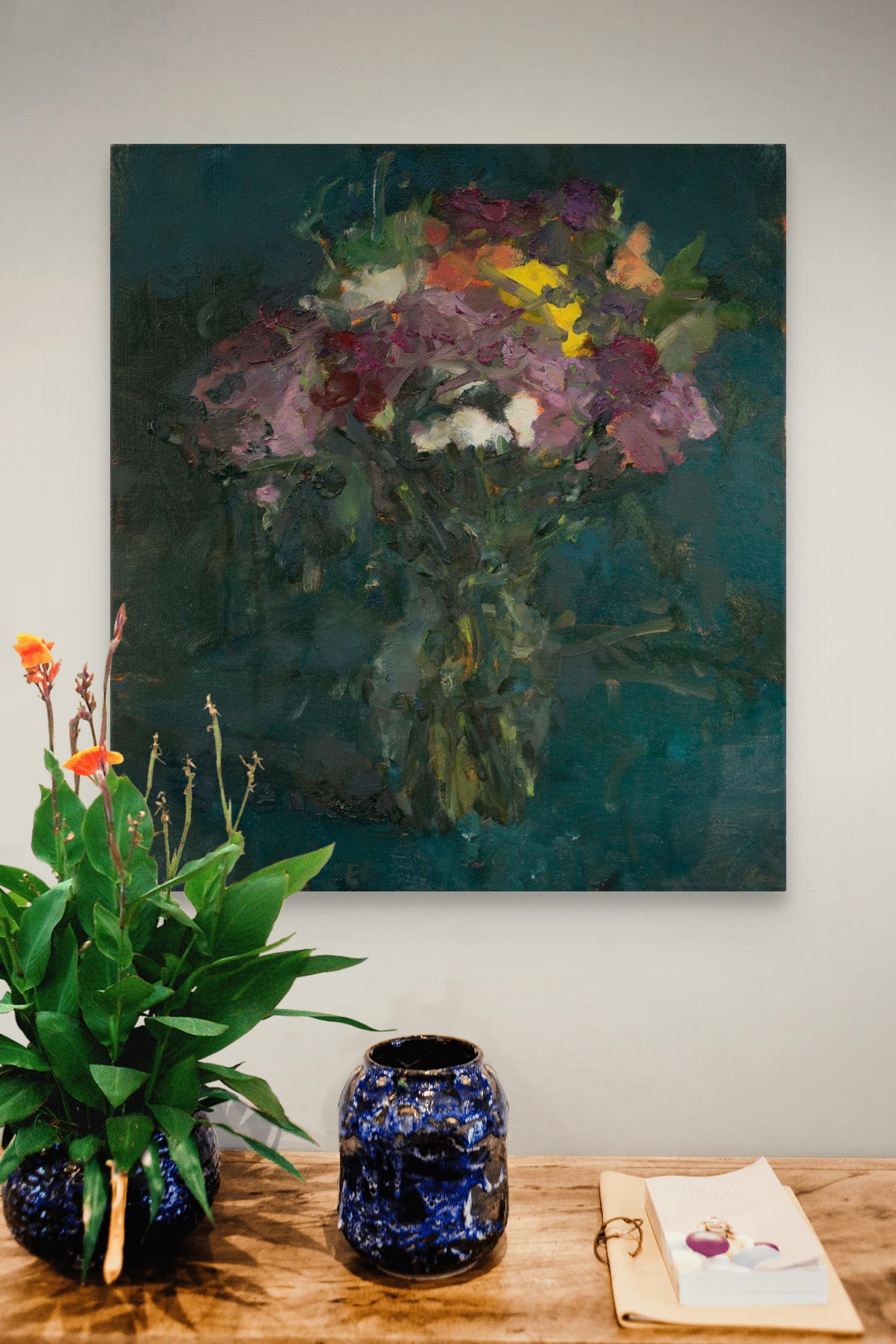 Jordan Wolfsons (USA) "Still Life with Flowers XXIII" ist ein beeindruckendes Original-Ölgemälde, das ein leuchtendes Blumenarrangement in einer durchscheinenden Vase vor einem tiefgrünem Hintergrund zeigt.
