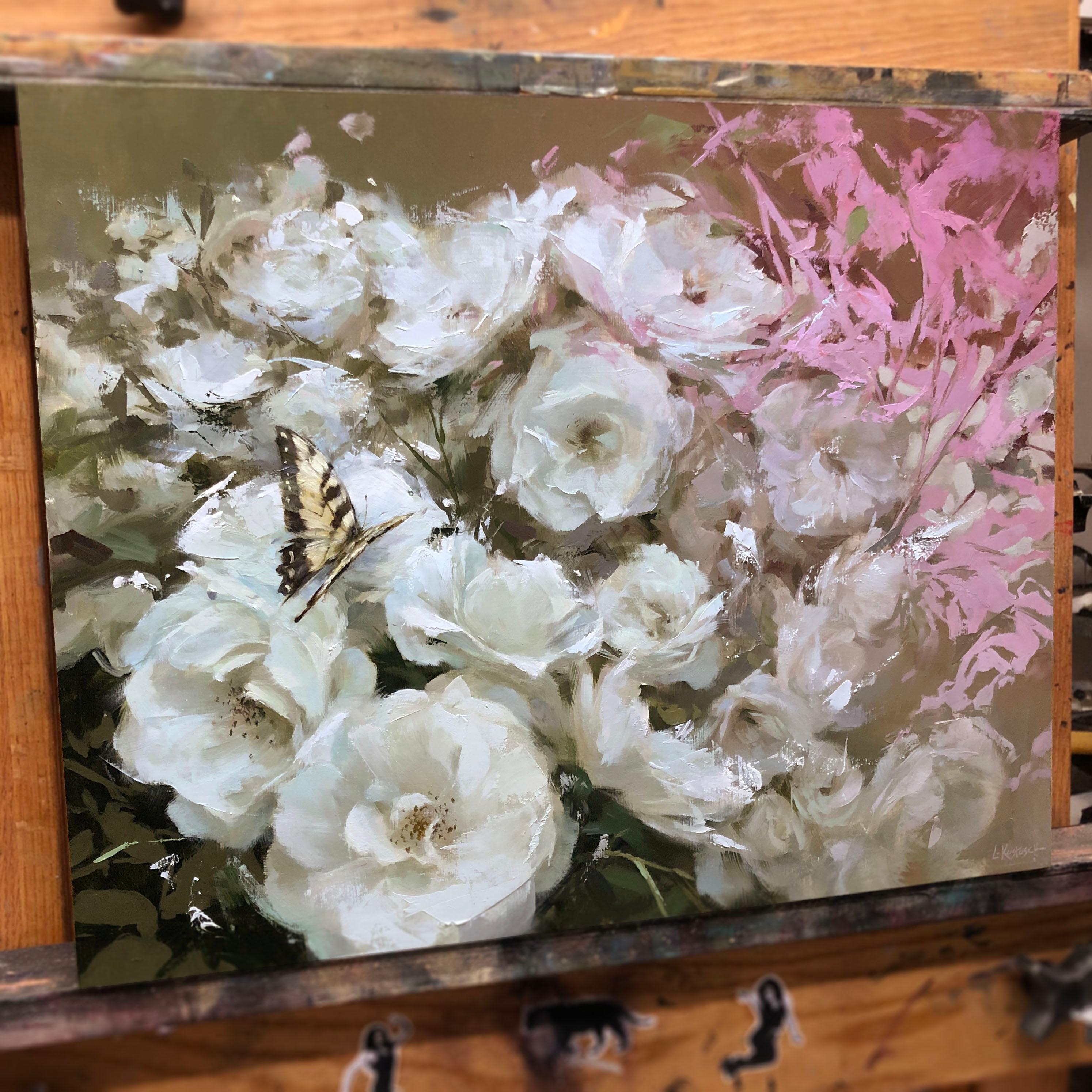 Lindsey Kustuschs "Roses in Bloom" ist ein fesselndes, handgefertigtes Original-Kunstwerk in Öl auf Holzplatte mit den Maßen 16 x 20 Zoll. Diese Arbeit aus dem Jahr 2025 ist ein Produkt des Primärmarktes, das anlässlich von Kustuschs Einzelausstellung "Under the Same Sky" in der Abend Gallery entstanden ist. Dieses Werk ist ungerahmt, aber verdrahtet und kann sofort aufgehängt werden.