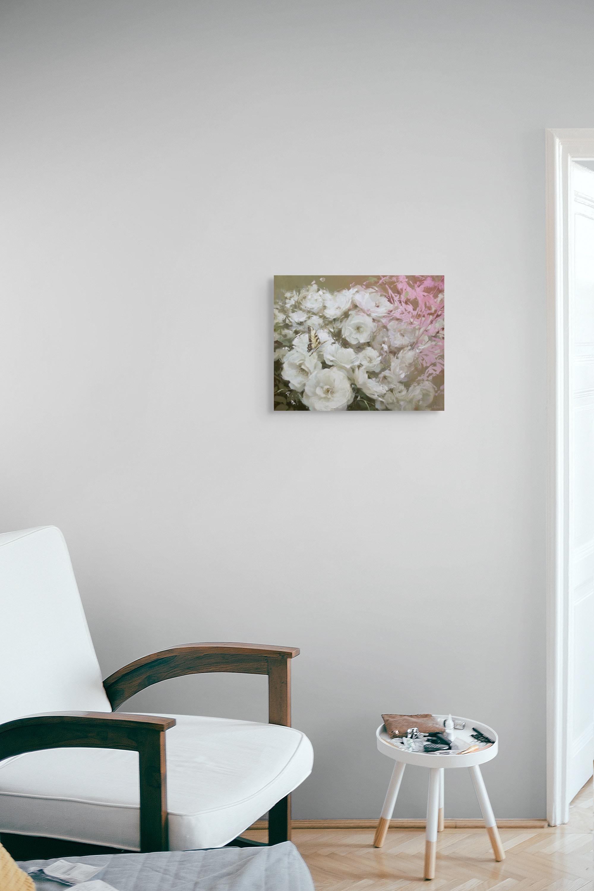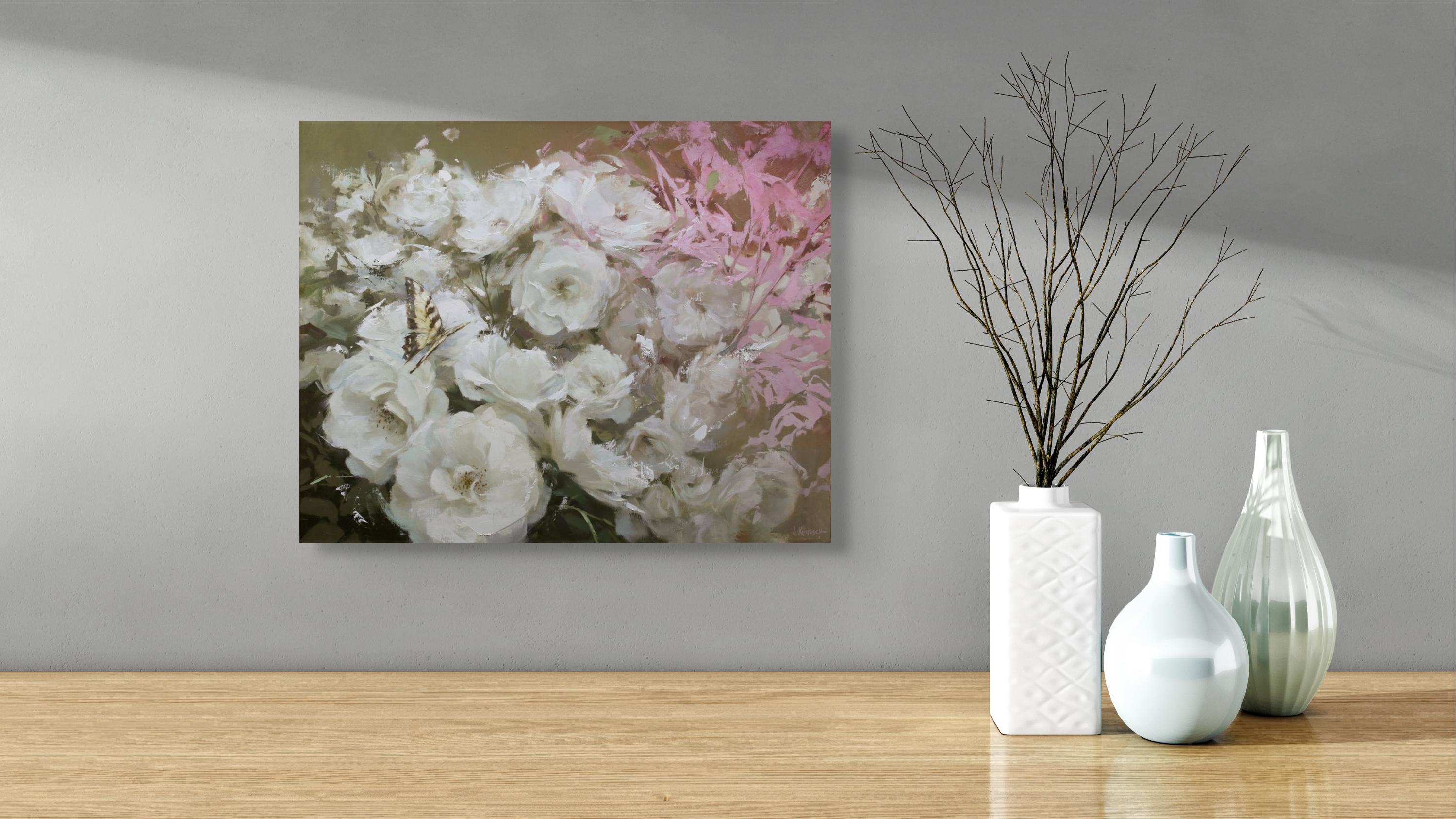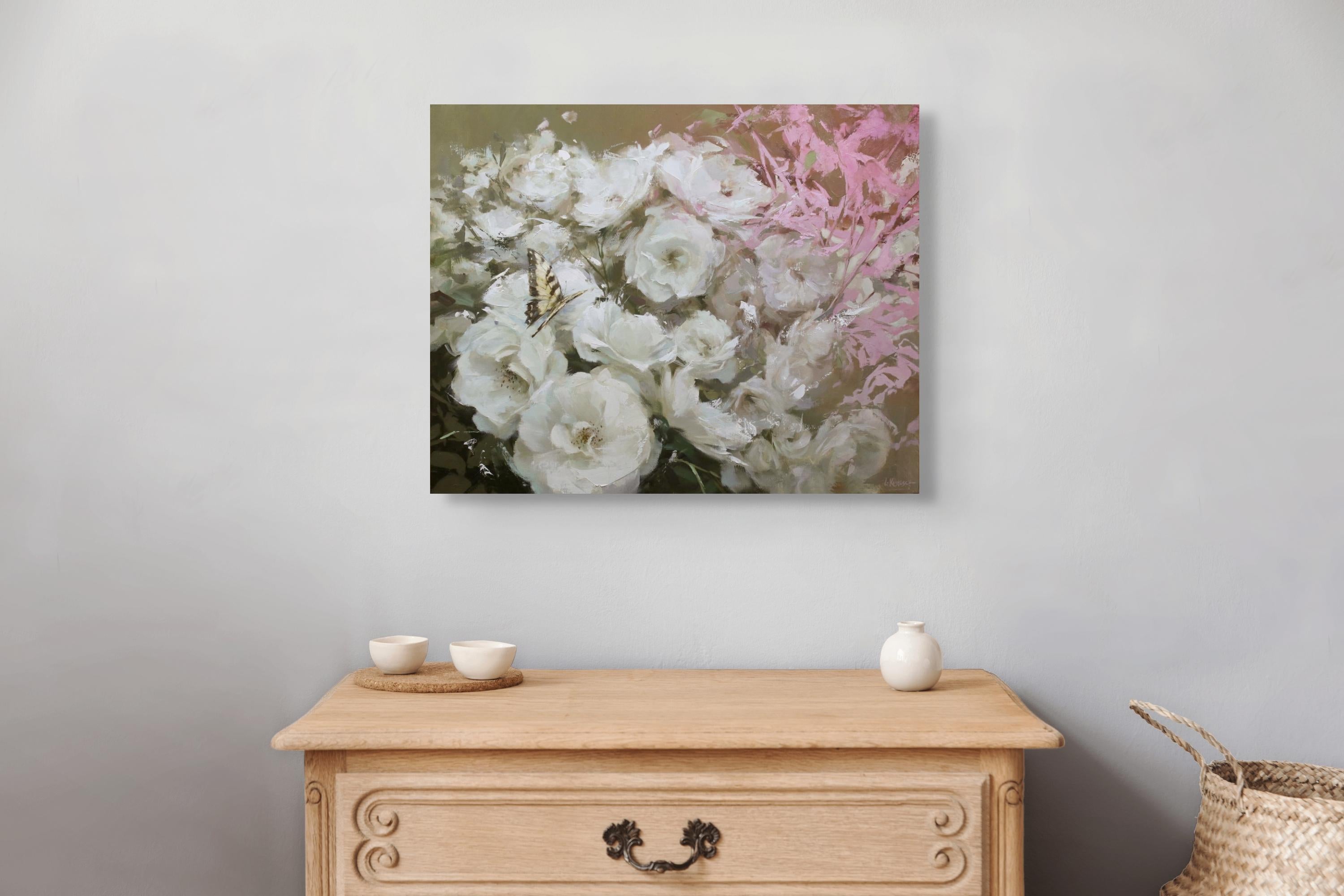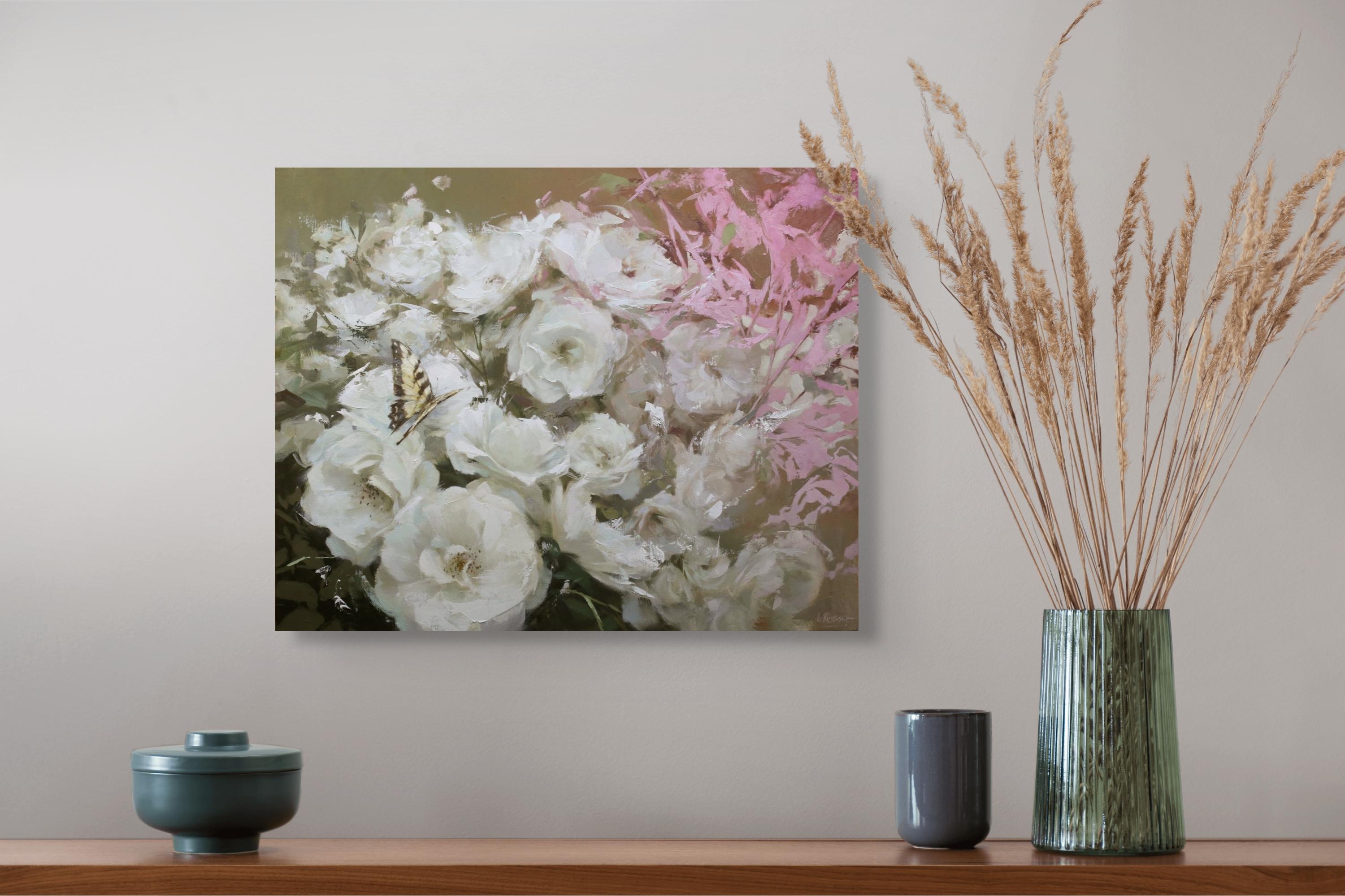 Jon Dorans (Großbritannien) "Fragmented Roses" ist ein Ölgemälde aus dem Jahr 2019 und zeigt weiße Rosen mit einem abstrahierten Hintergrund.