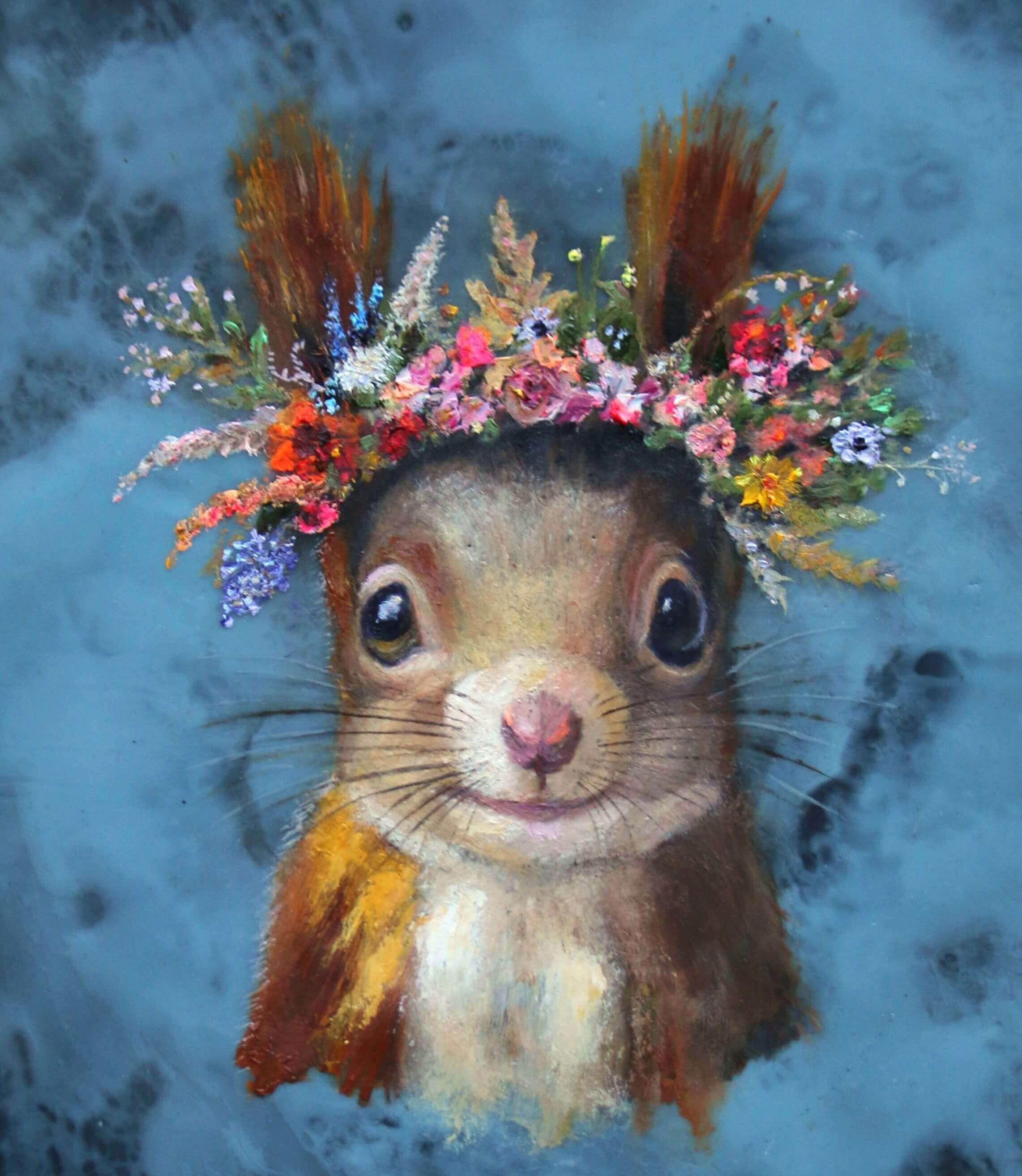 Objekte ähnlich wie "Butch (Blühendes Eichhörnchen)" - Öl- und Enkaustikgemälde auf Leinwand