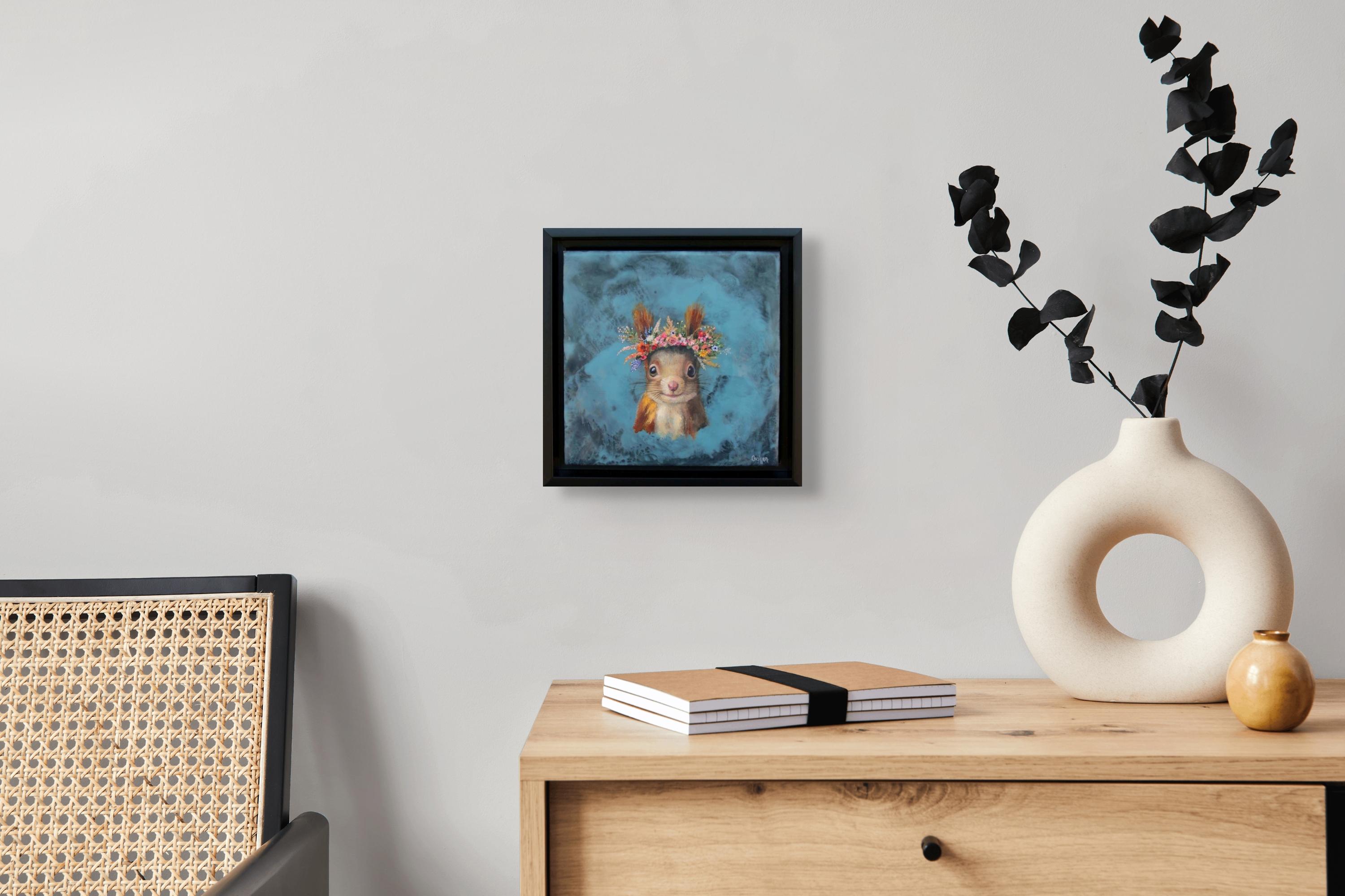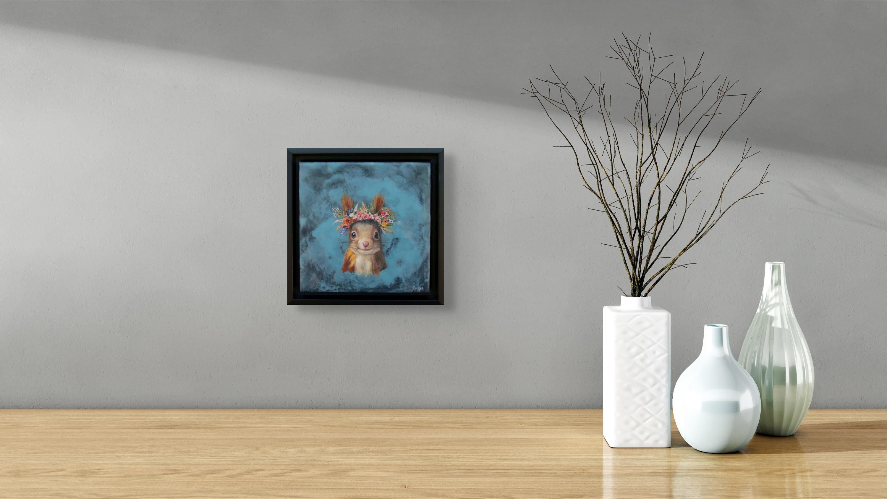 Carrie Gollers (USA) "Butch (Floriferous Squirrel)" (2025) ist ein handgefertigtes Originalgemälde in Mischtechnik mit Öl- und Enkaustikfarben. Dieses Stück misst 9,75 x 9,75 Zoll gerahmt und ist bereit zu hängen.