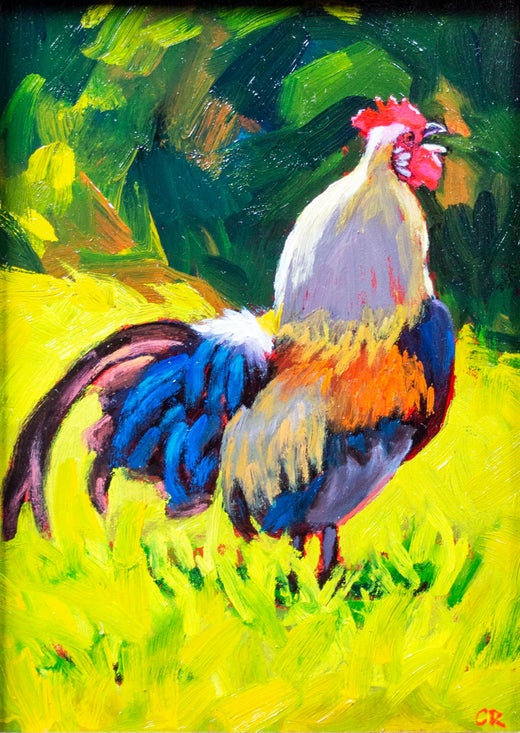 "Feeling Roostery!" ist ein Original-Ölgemälde von Cathryn Ruvalcaba. Hier zeigt sie einen farbenfrohen Hahn, der durch eine grüne Weide stolziert. Cathryn malt im Stil des russische...