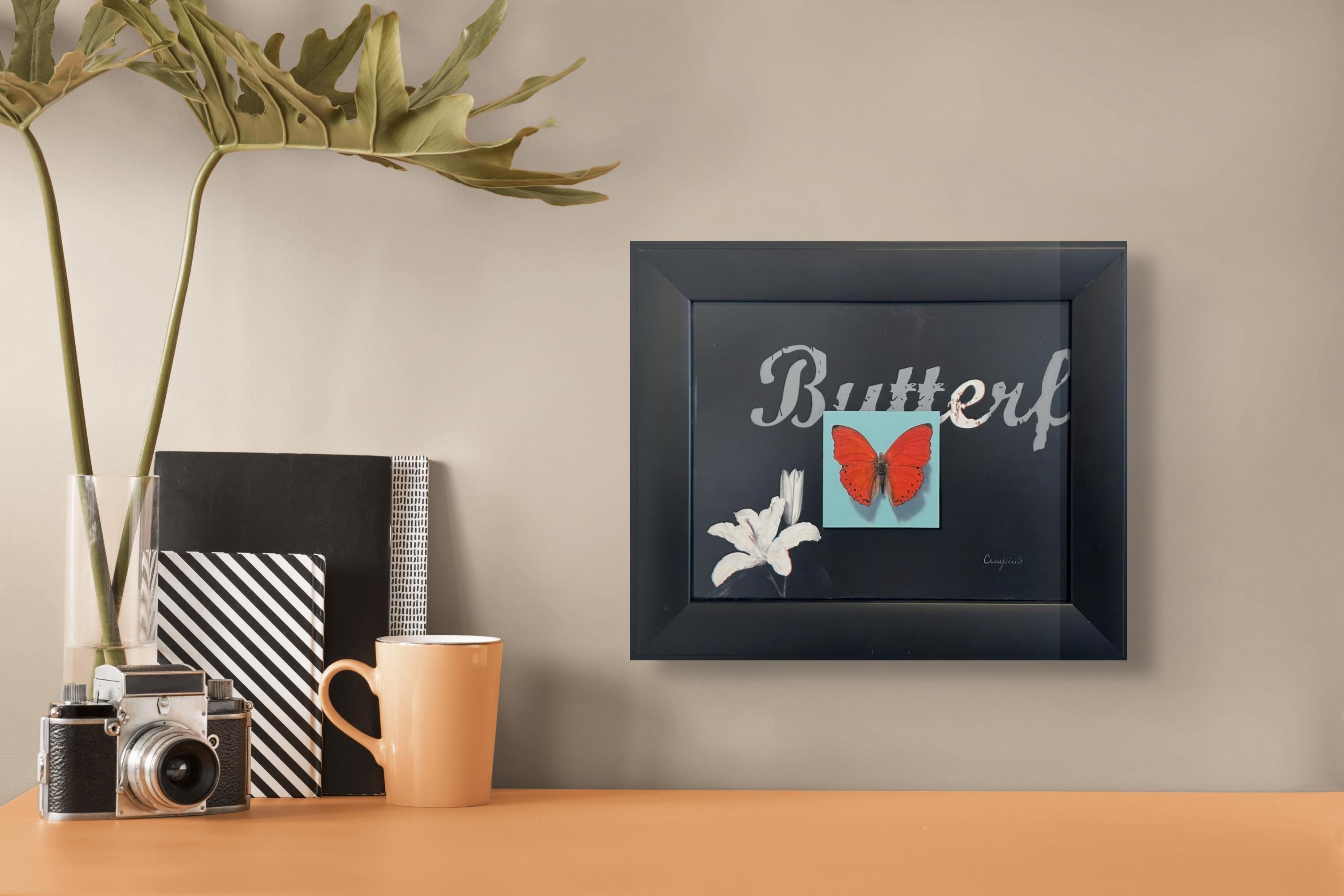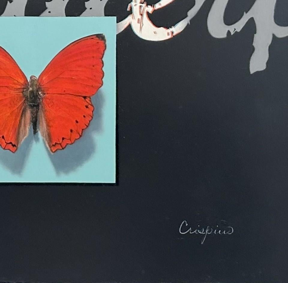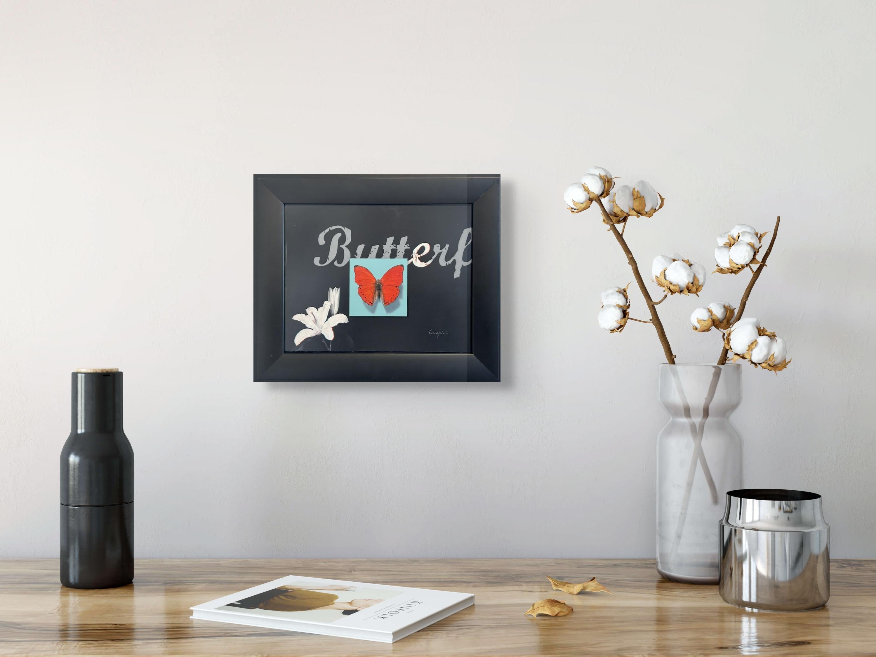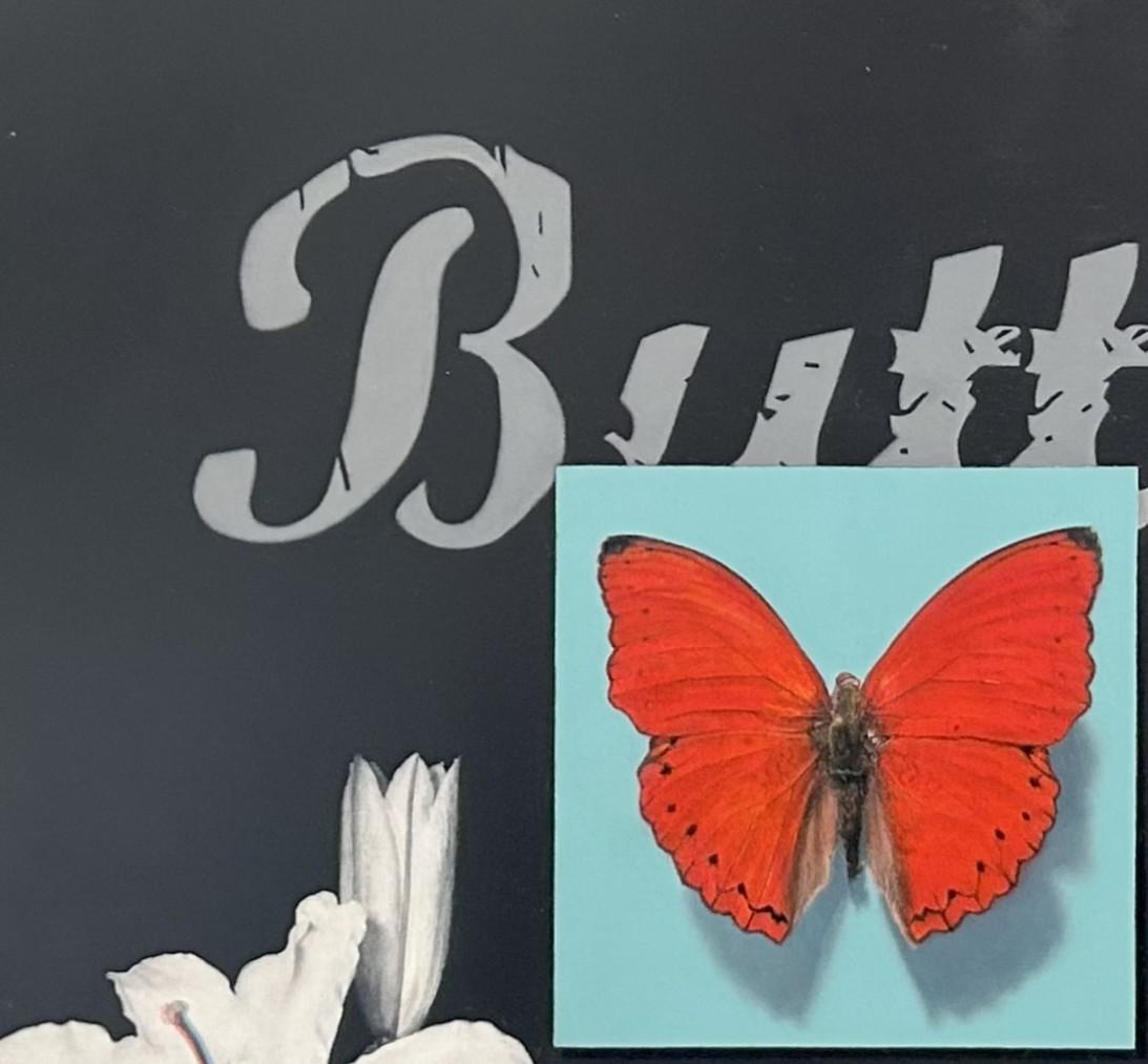 Emma Hirst (USA) "Repose" ist ein originales, handgefertigtes Ölgemälde, das einen schwarz-gelben Schmetterling zeigt, der friedlich auf einem weißen Hintergrund sitzt.