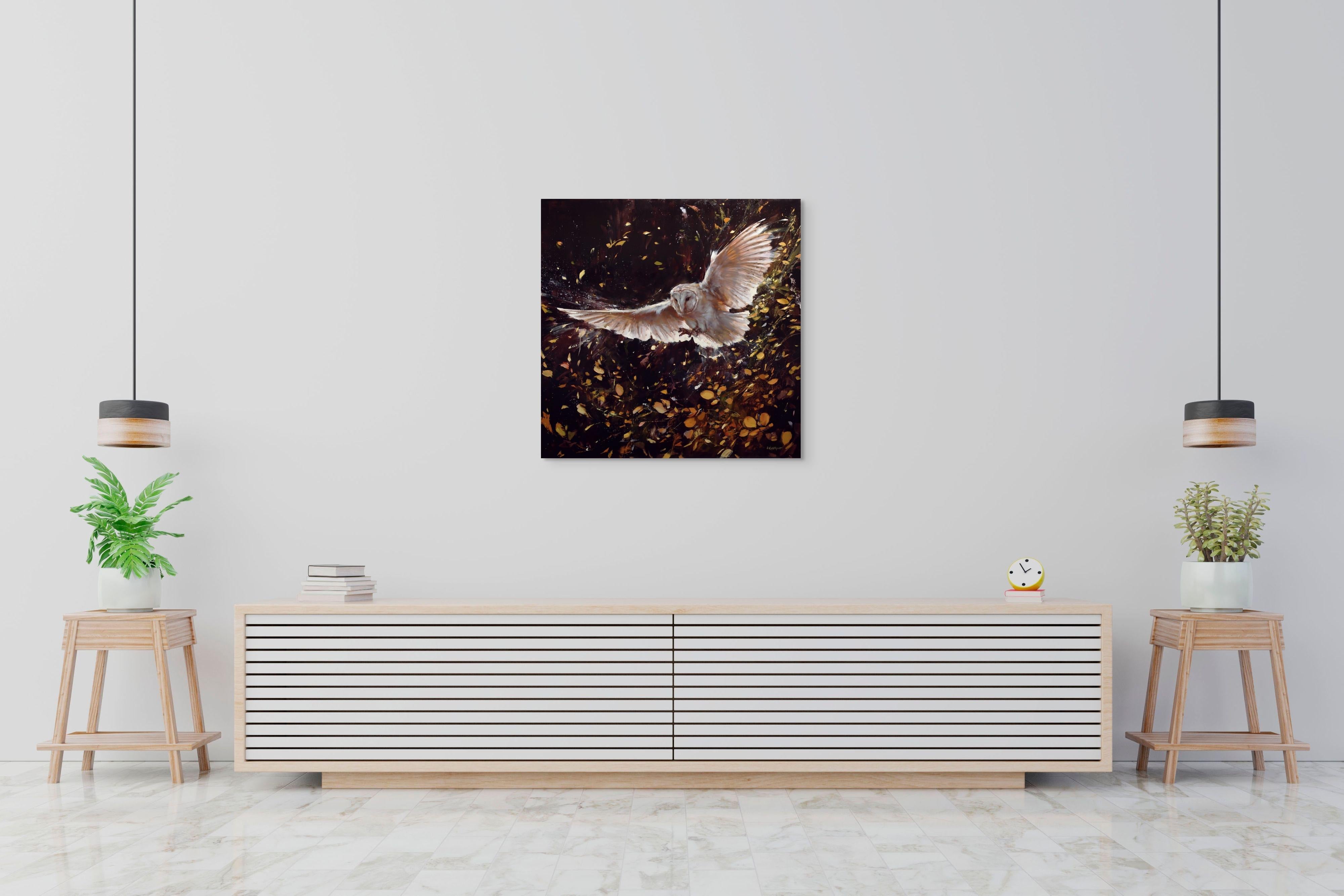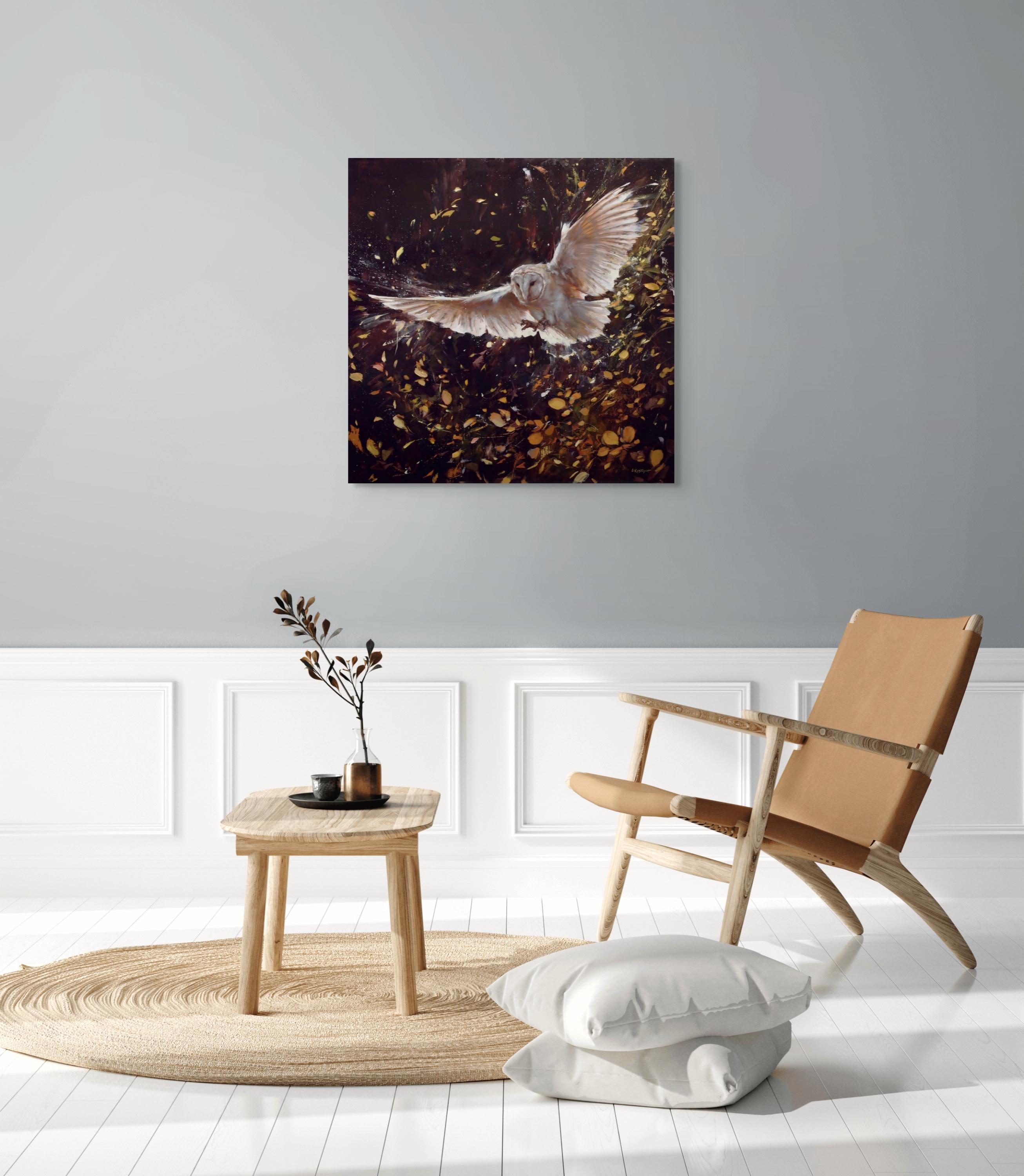 Lindsey Kustuschs "A Rustle in the Leaves" (Ein Rascheln im Laub) ist ein fesselndes, handgefertigtes Original-Kunstwerk in Öl auf Holzplatte mit den Maßen 36 x 36 Zoll. Diese Arbeit aus dem Jahr 2025 ist ein Produkt des Primärmarktes, das anlässlich von Kustuschs Einzelausstellung "Under the Same Sky" in der Abend Gallery entstanden ist. Dieses Werk ist 38 x 38 Zoll groß und kann sofort aufgehängt werden.