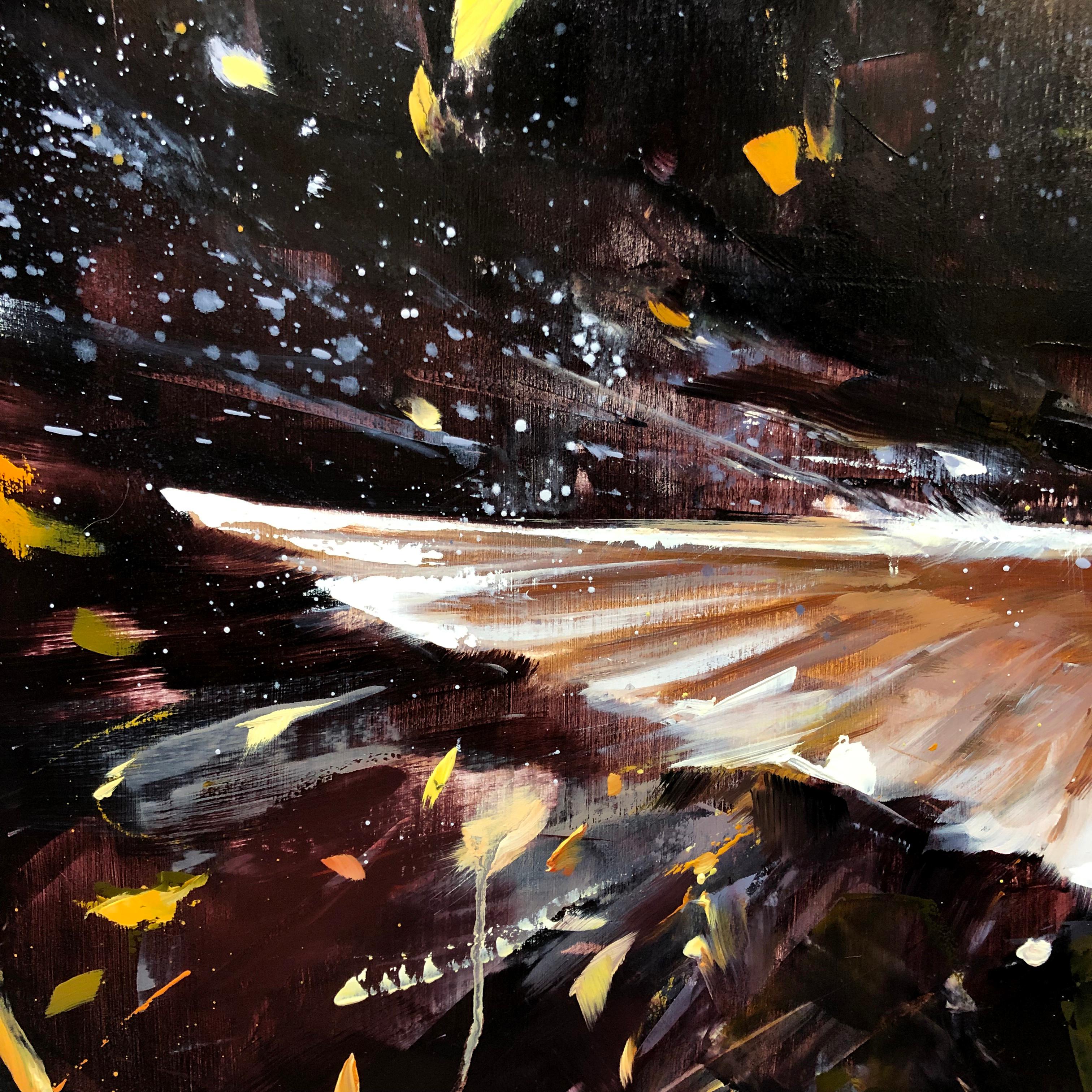 Lindsey Kustuschs "In the Golden Haze of Autumn" ist ein fesselndes, handgefertigtes Original-Kunstwerk in Öl auf Holzplatte mit den Maßen 36 x 18 Zoll. Diese Arbeit aus dem Jahr 202...