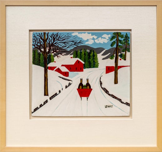 Dieses Volkskunstgemälde mit einem roten Schlitten im Winter stammt von Maud Lewis.