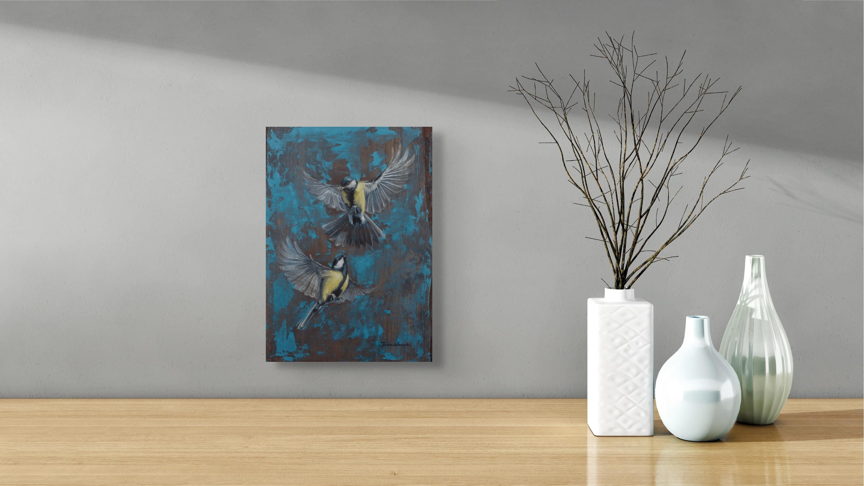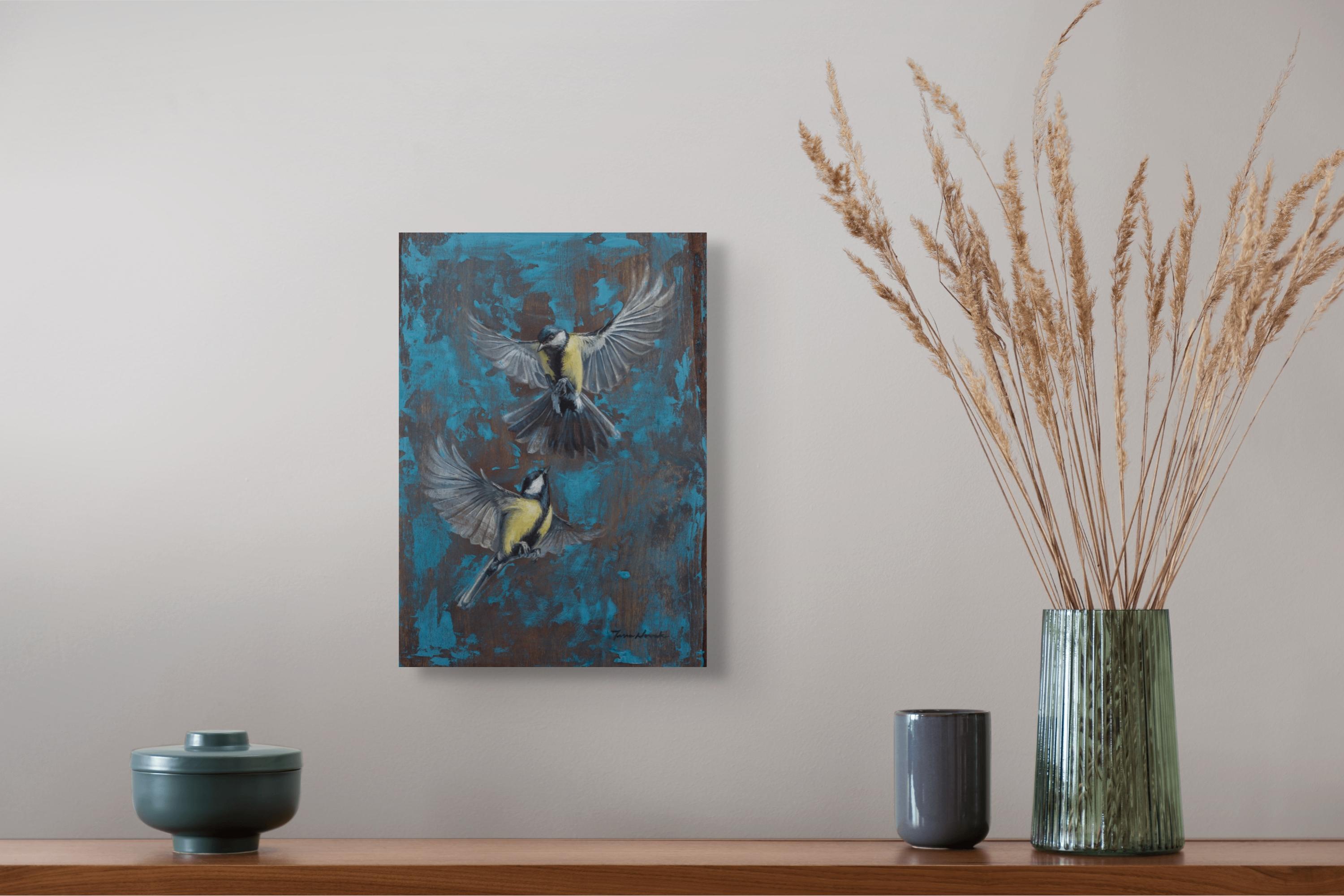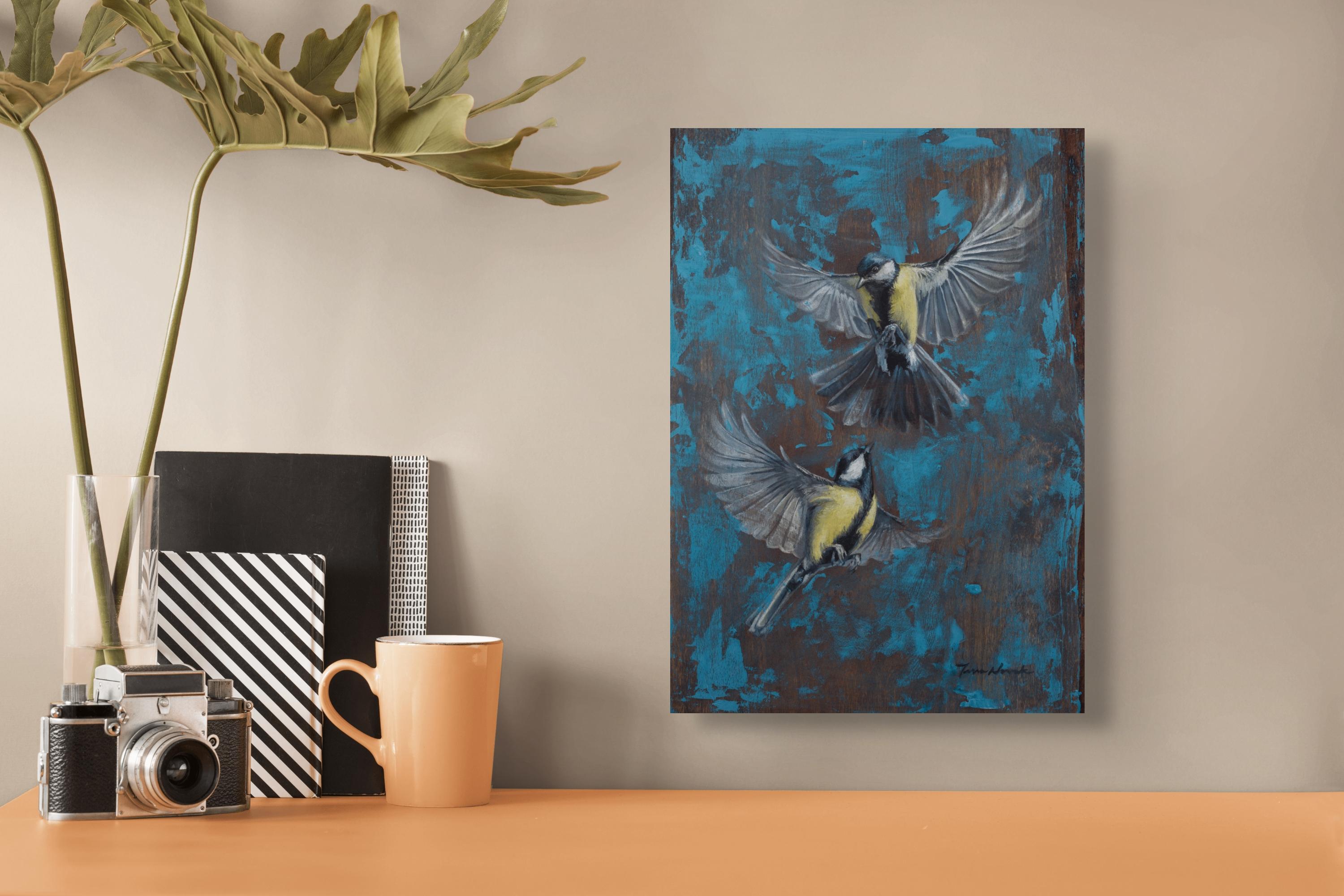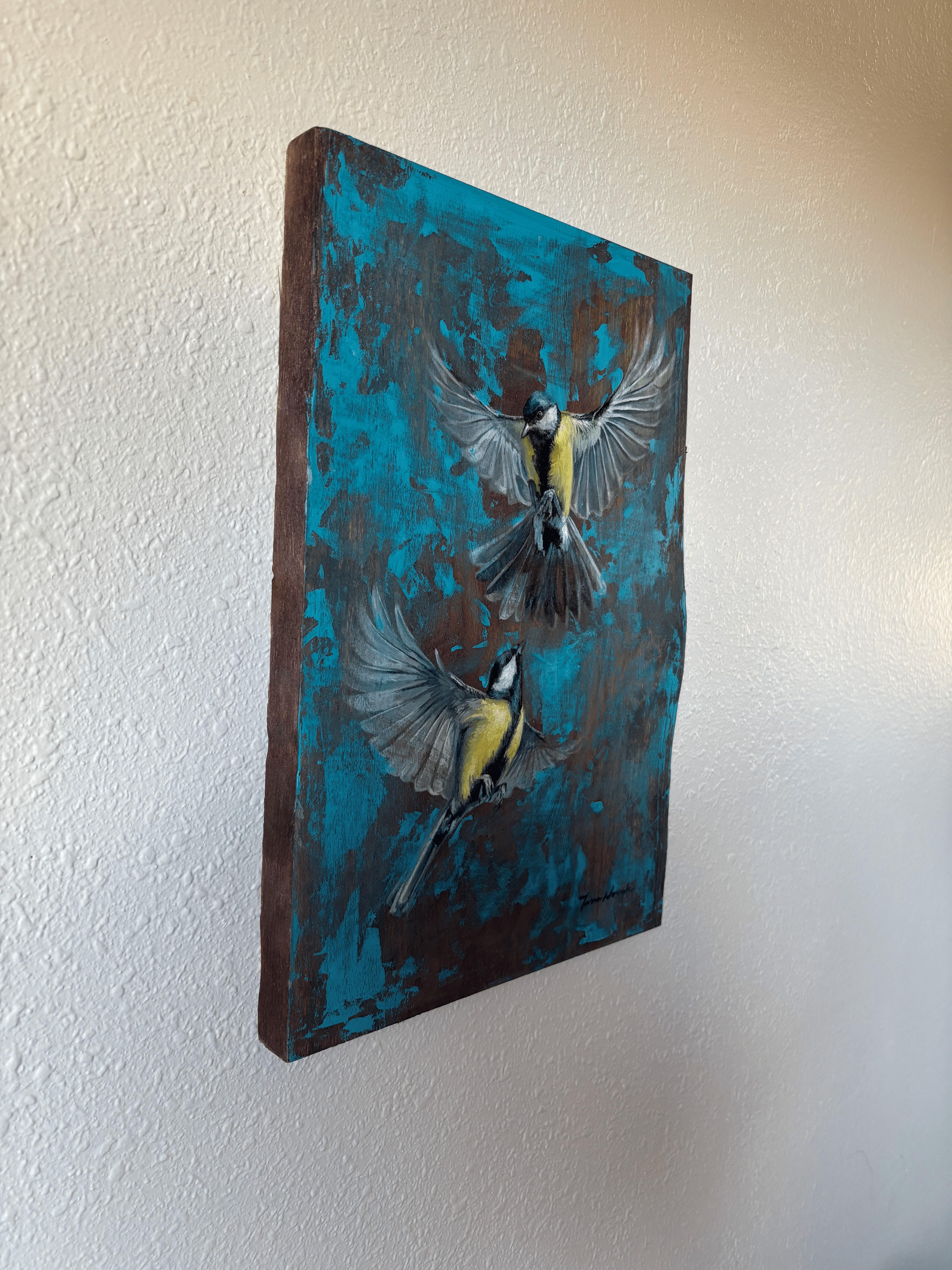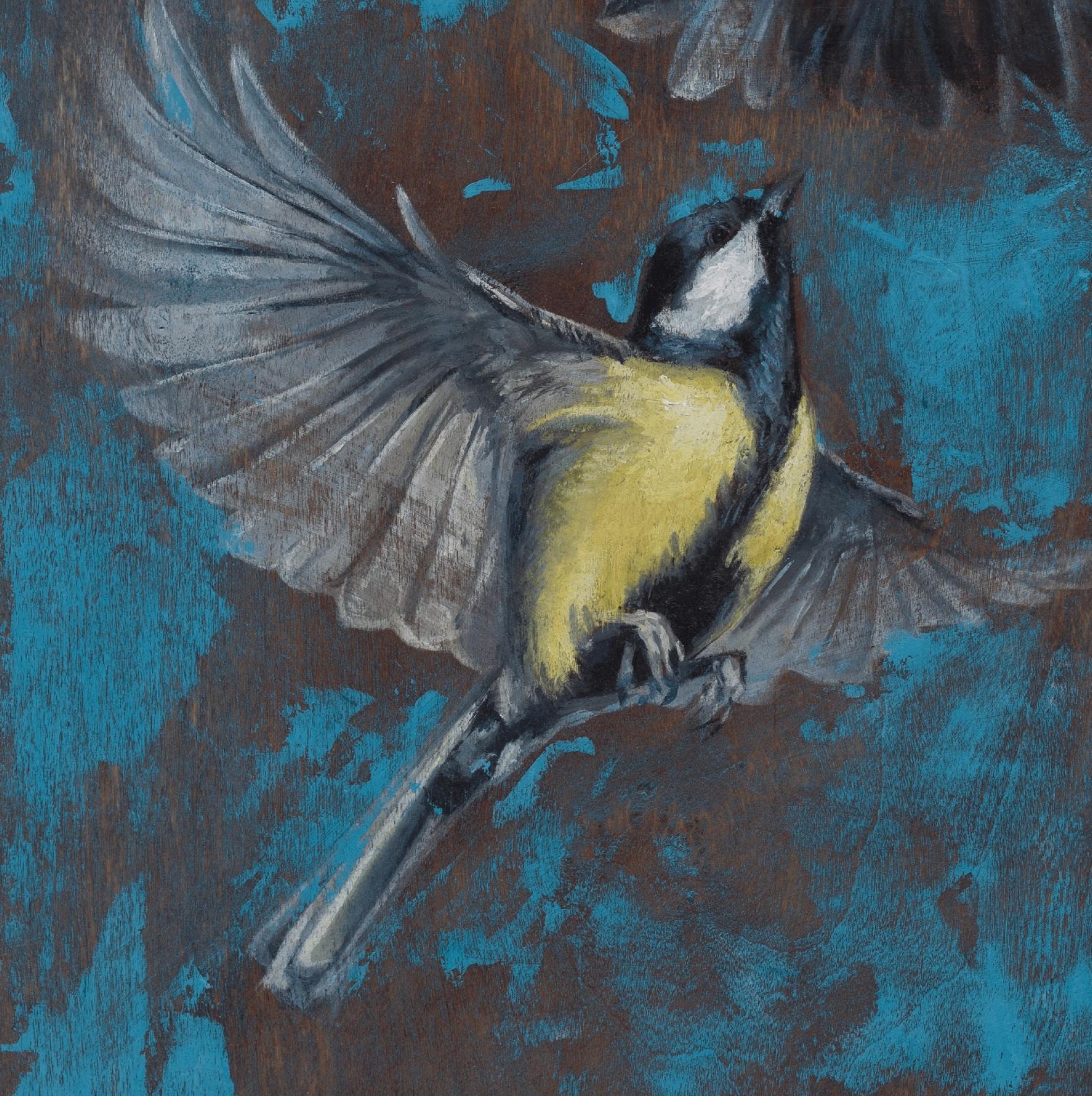 Zwei Vögel fliegen vor einem ausdrucksstarken Hintergrund. Dieses Gemälde ist eine Studie darüber, wie geschliffenes Holz und lebendige Farbe die Illusion von Bewegung erzeugen und die Energie und Lebendigkeit von Vögeln in Bewegung einfangen können.