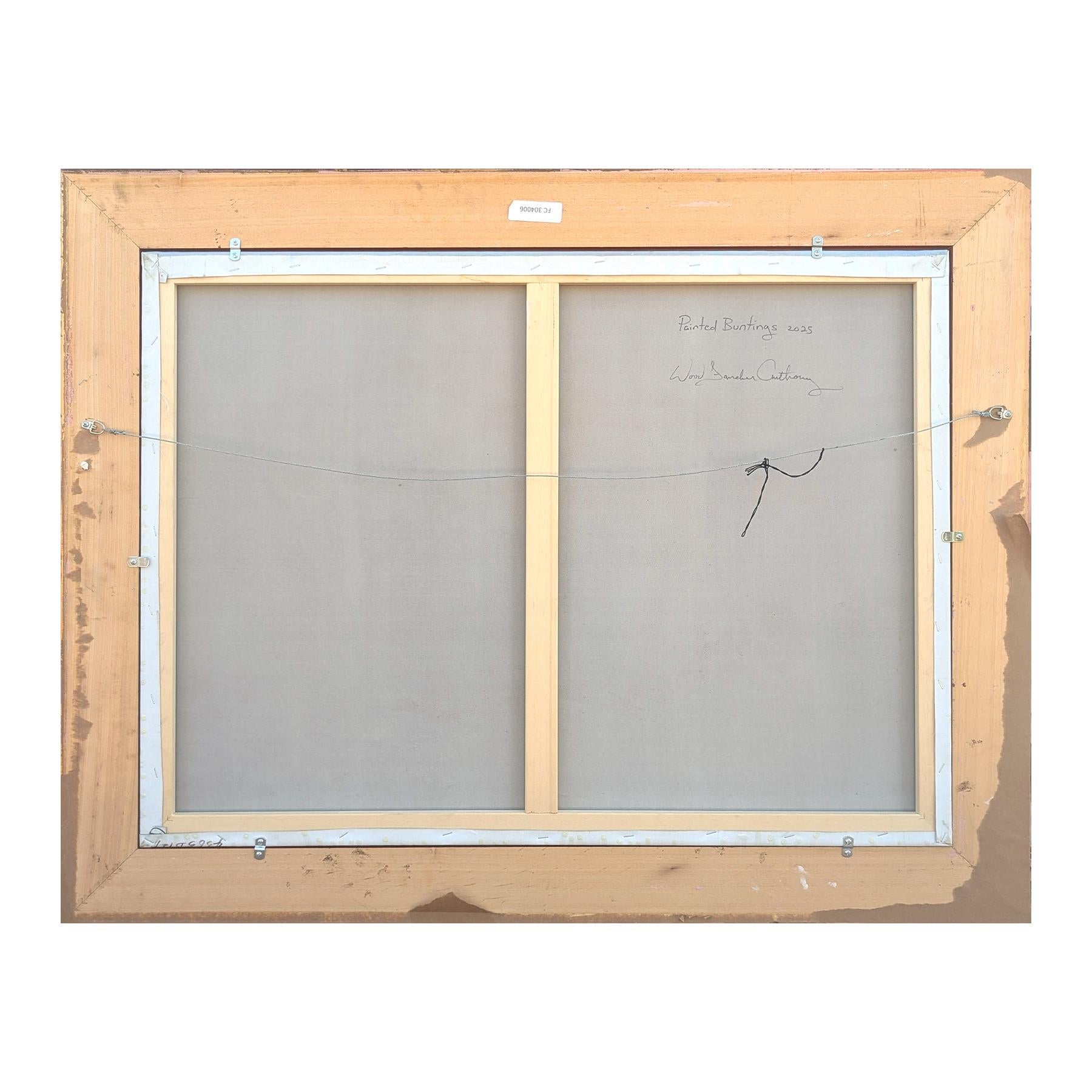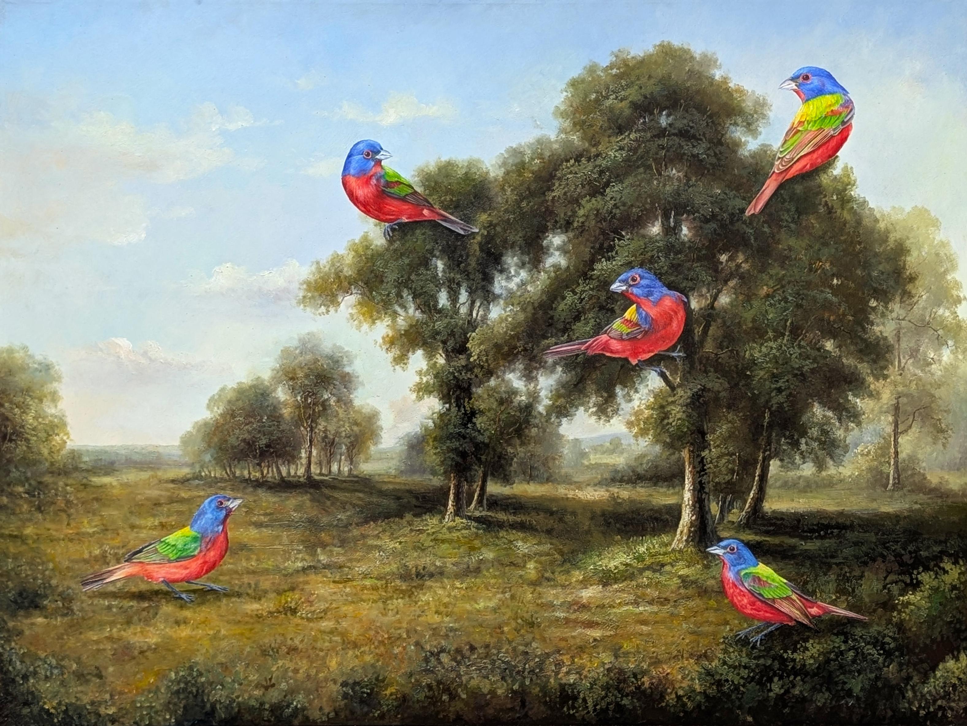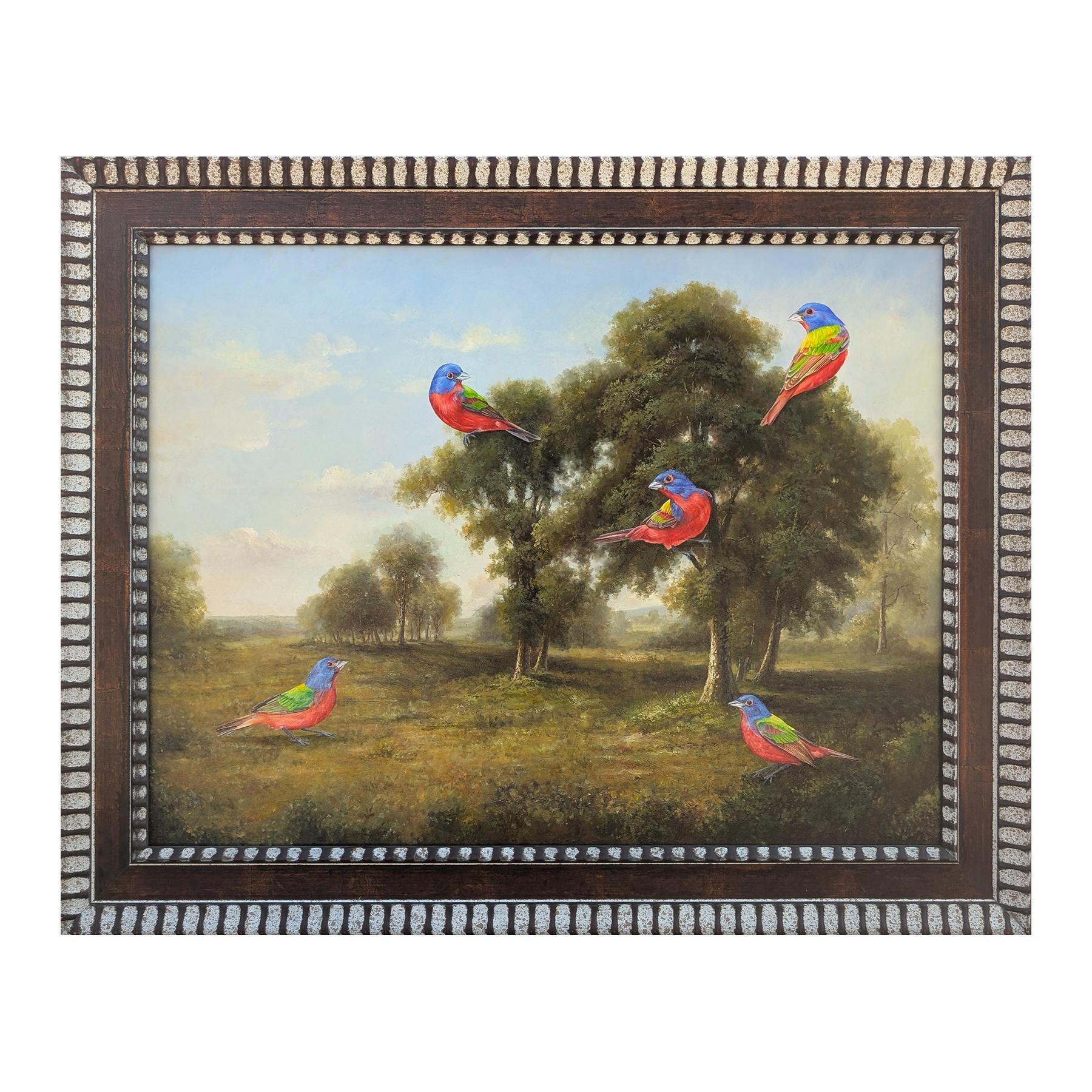 Zeitgenössische Landschaftsmalerei des in Texas lebenden Künstlers Wood Fancher Anthony. Das Werk zeigt hyperrealistische Darstellungen von gemalten Ammern in einer friedlichen Landschaft. Rückseitig signiert, betitelt und datiert. Derzeit in einem braunen Rahmen aufgehängt.