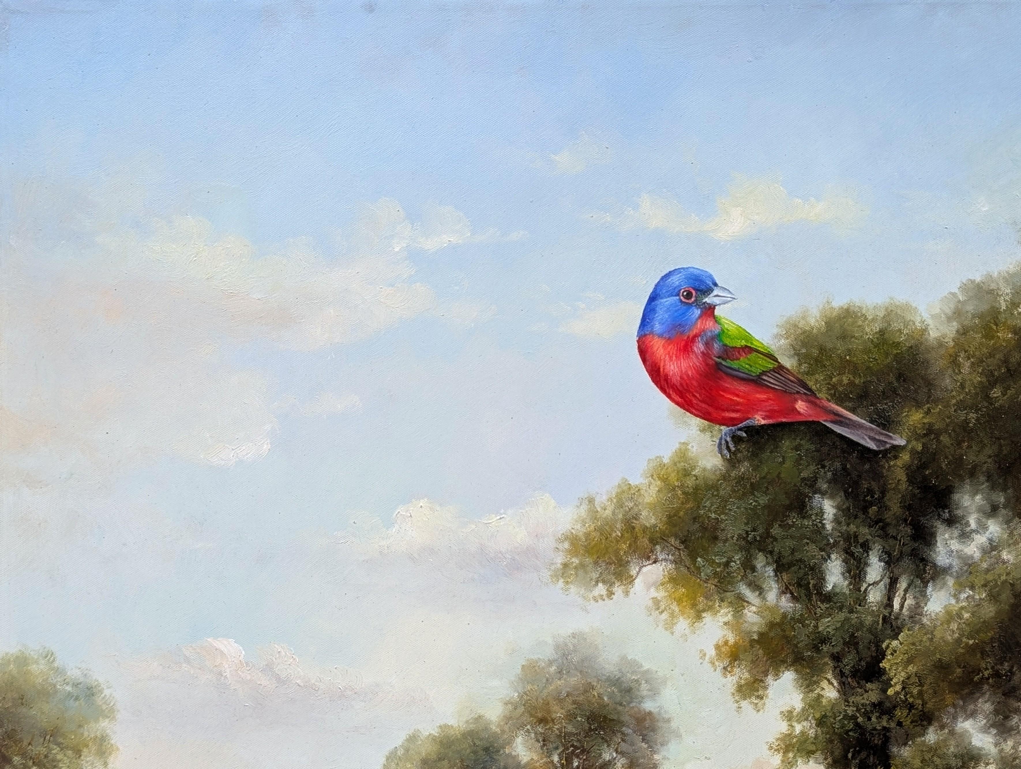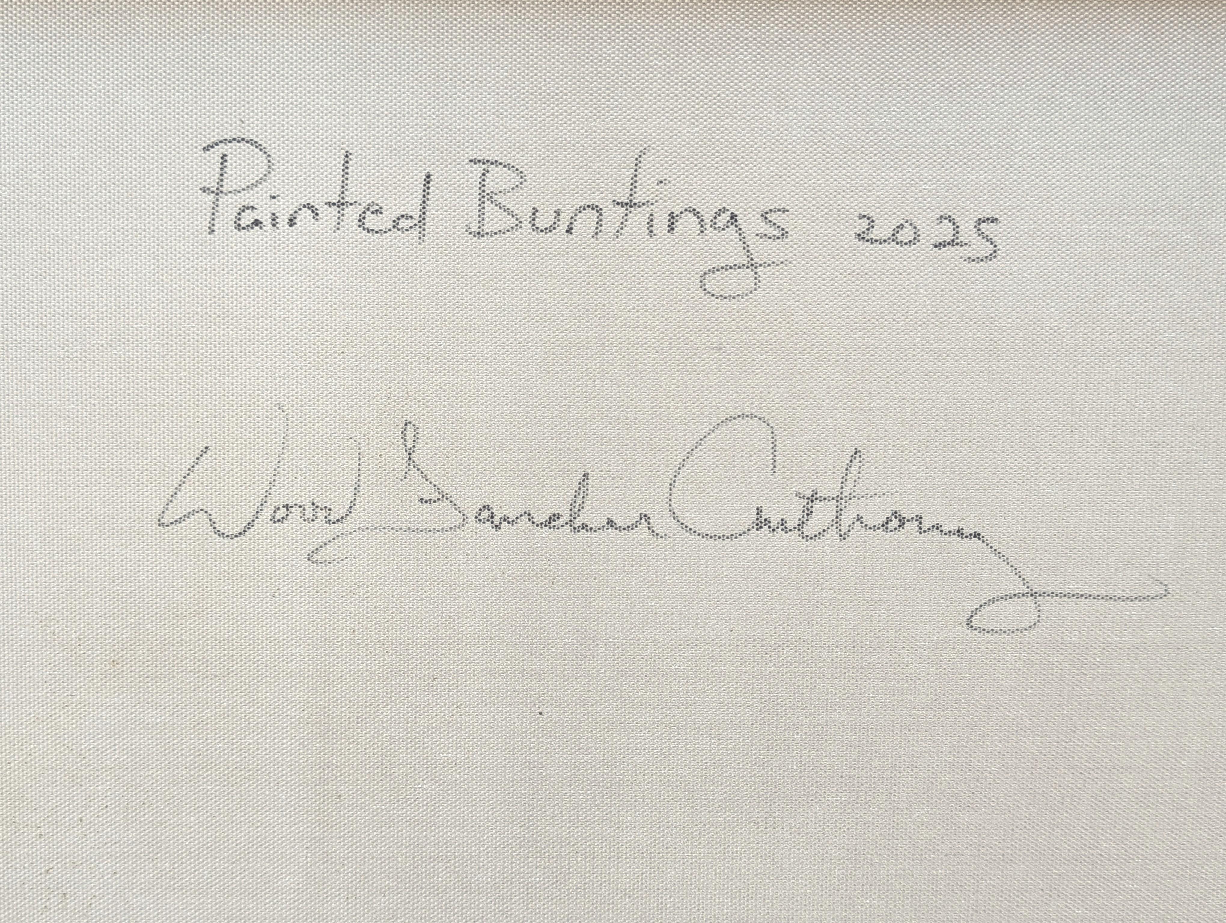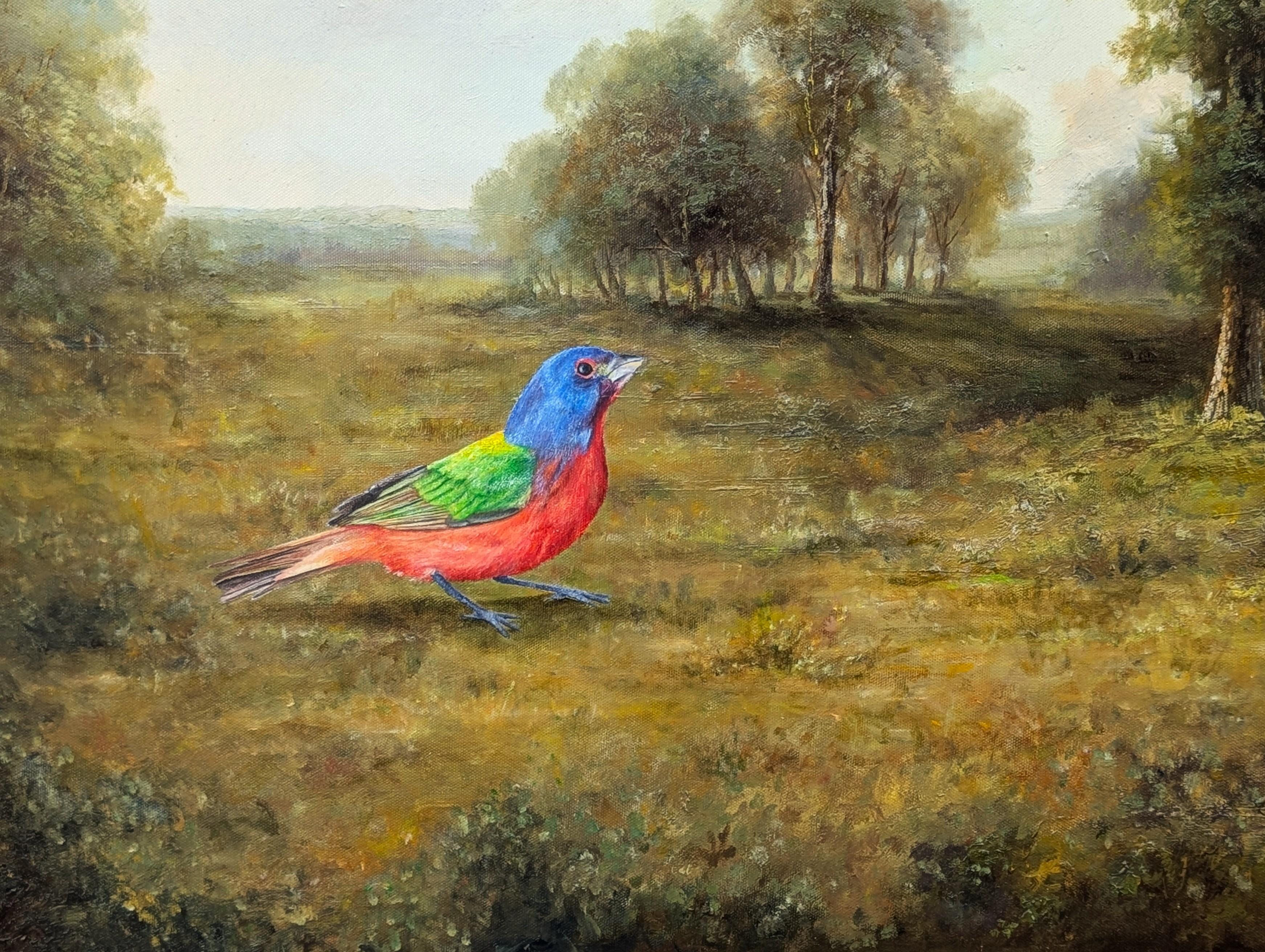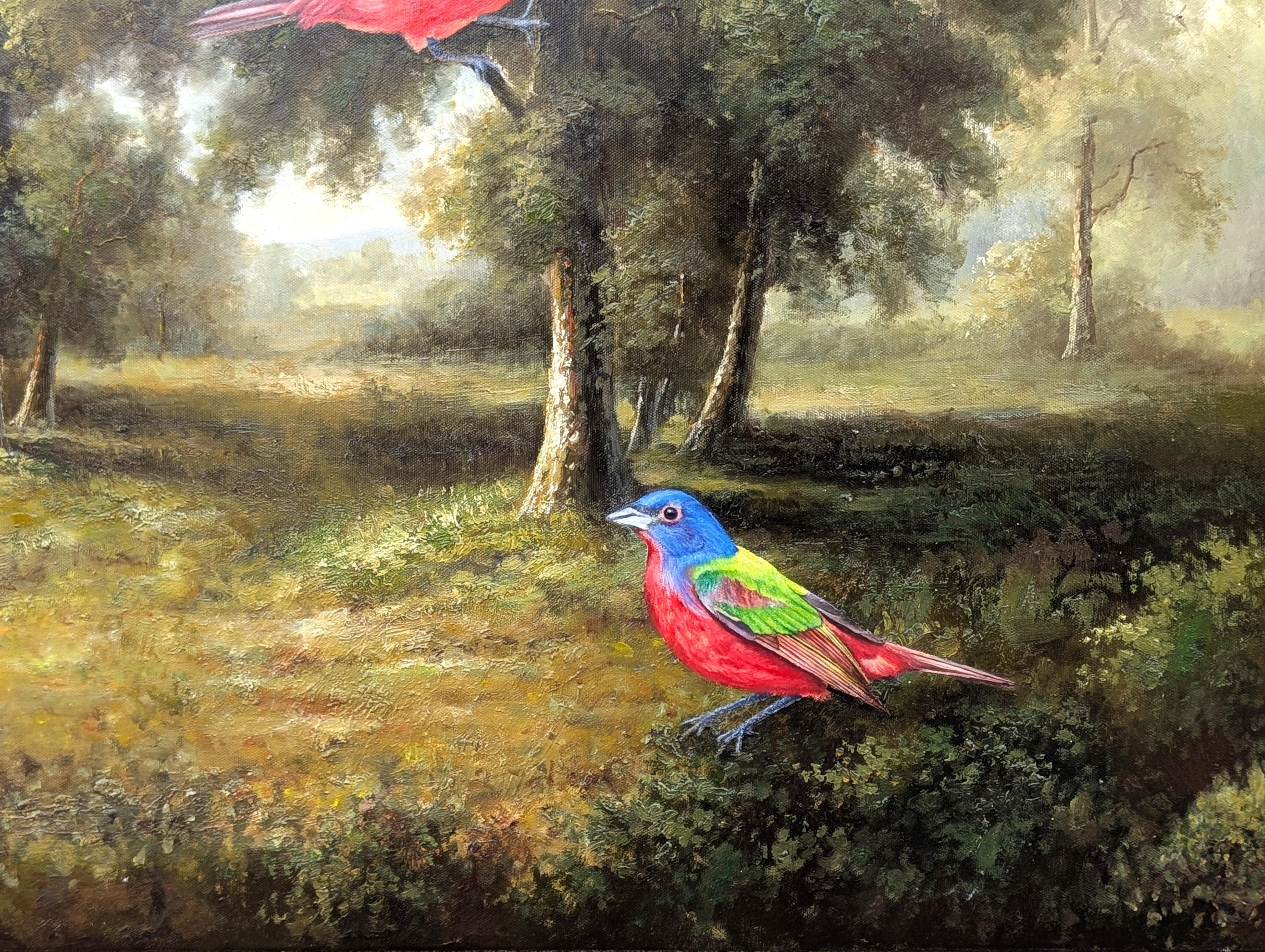 Zeitgenössische Landschaftsmalerei des in Texas lebenden Künstlers Wood Fancher Anthony. Das Werk zeigt hyperrealistische Darstellungen von gemalten Ammern in einer friedlichen Landschaft. Rückseitig signiert, betitelt und datiert. Derzeit in einem braunen Rahmen aufgehängt.