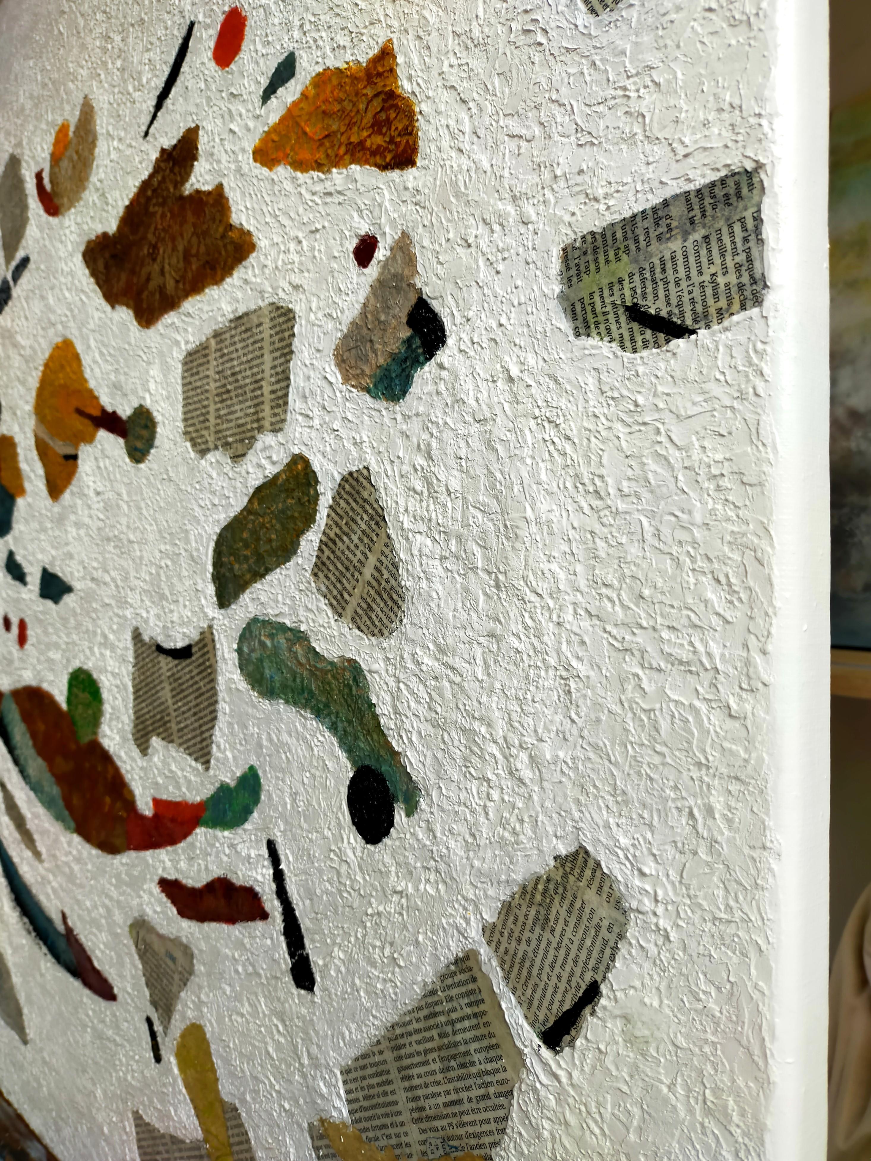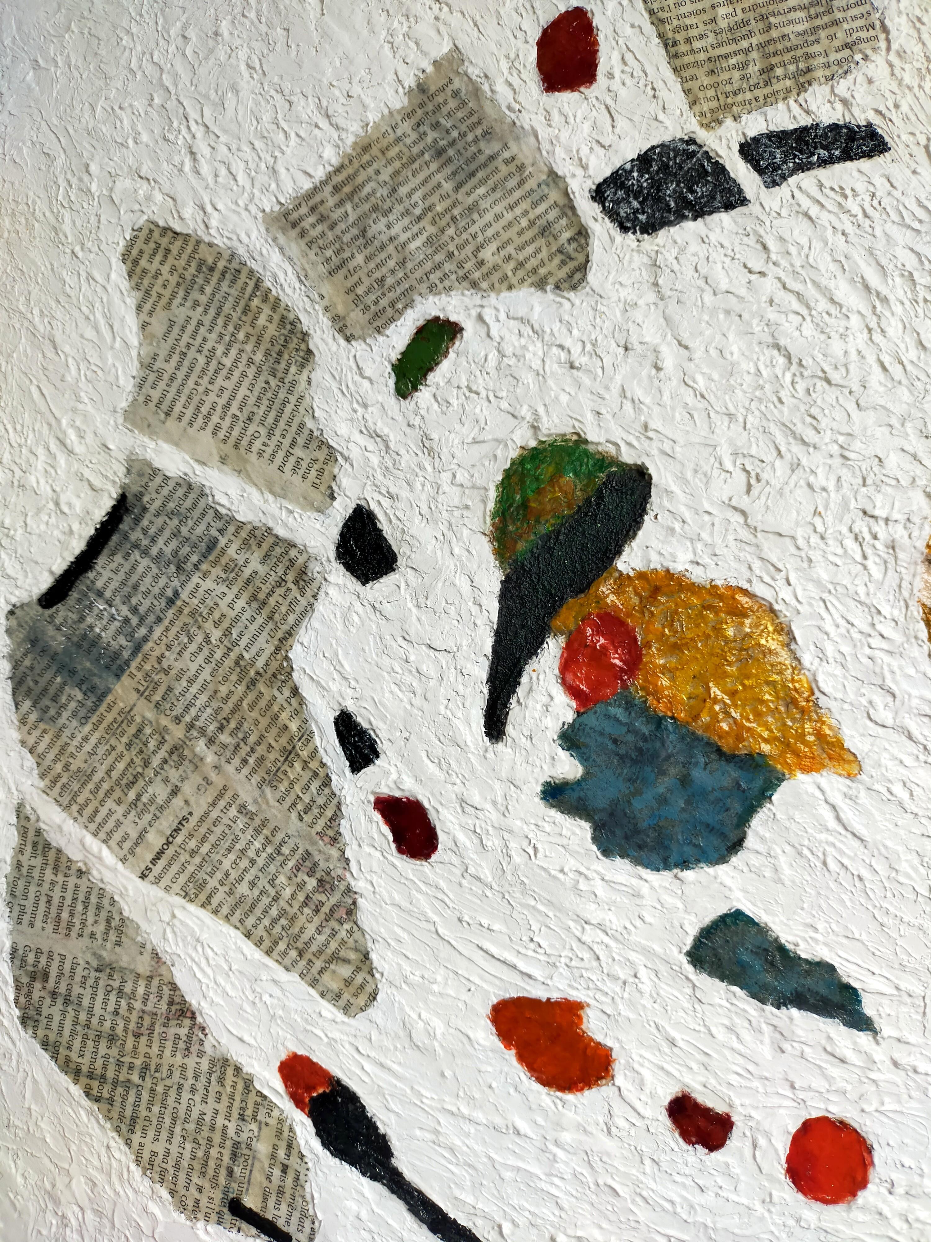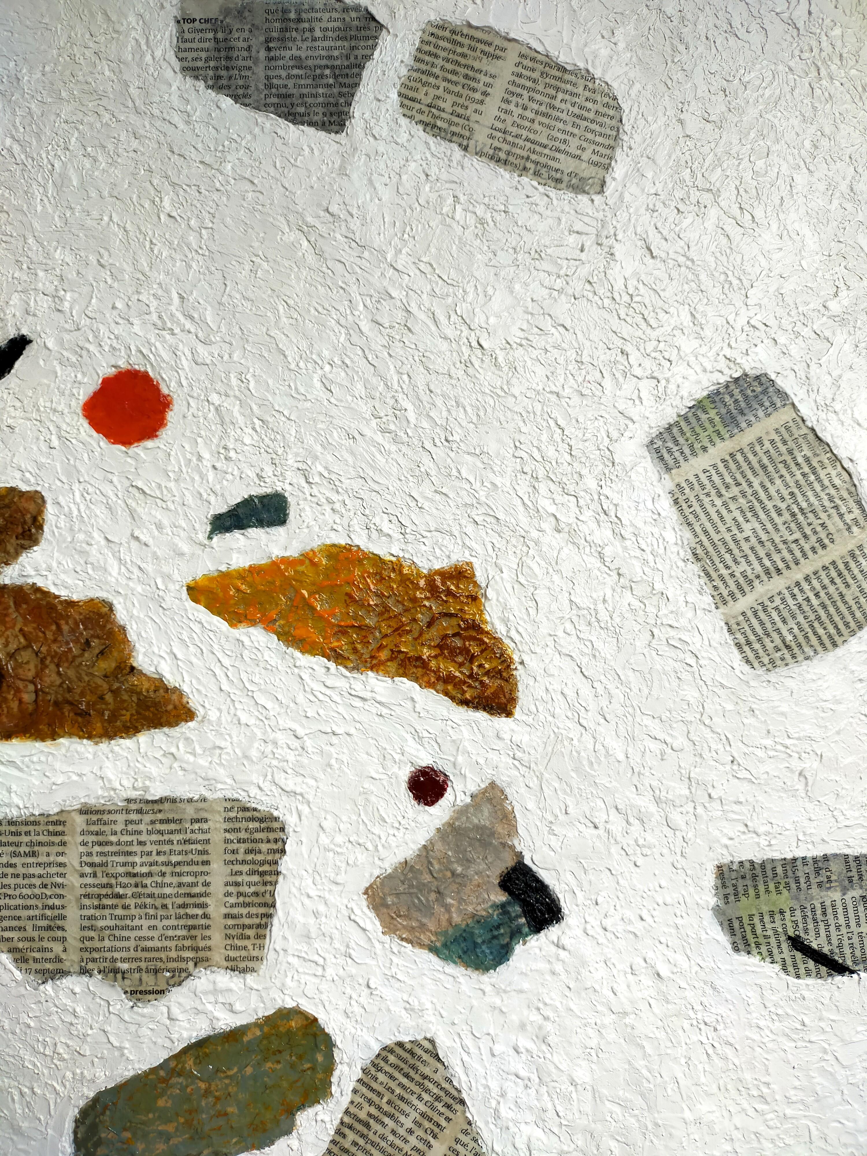 Es handelt sich um ein abstraktes Gemälde, das mit der Technik der Collage von Zeitungsausschnitten und deren Vermischung mit Farbe hergestellt wurde. Der Hintergrund des Gemäldes ist ganz weiß und sehr rau - unter der Farbe befindet sich eine körnige Paste, die für viel Textur sorgt.