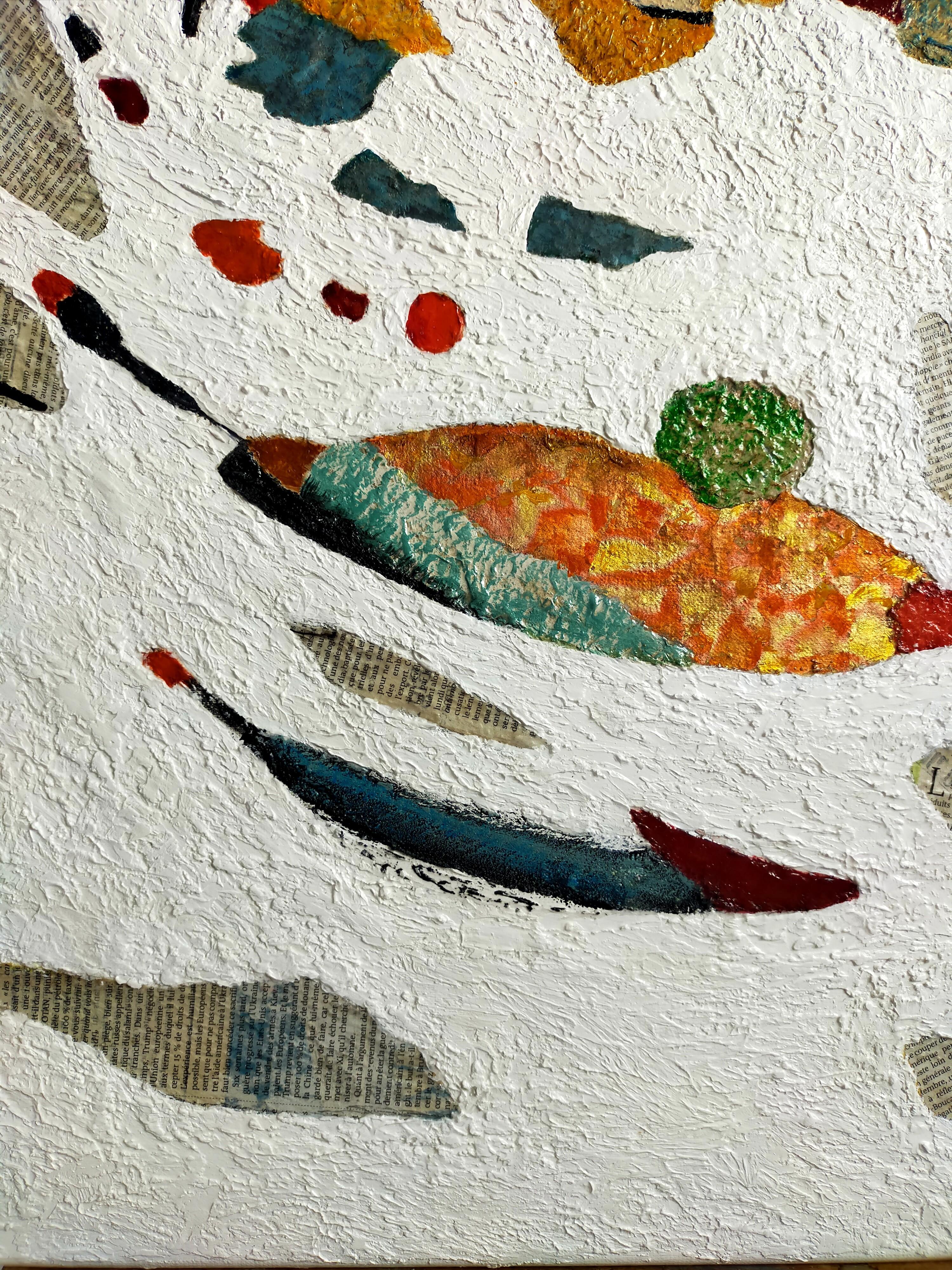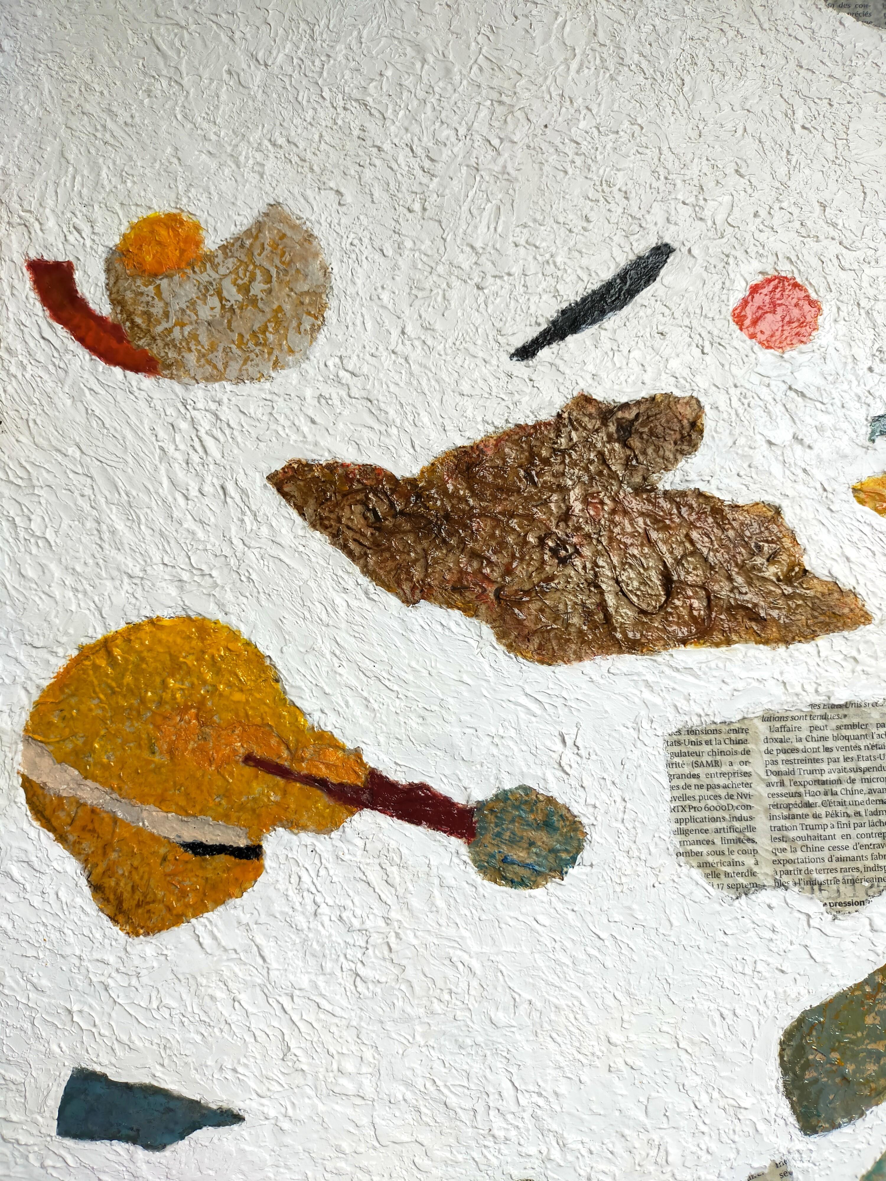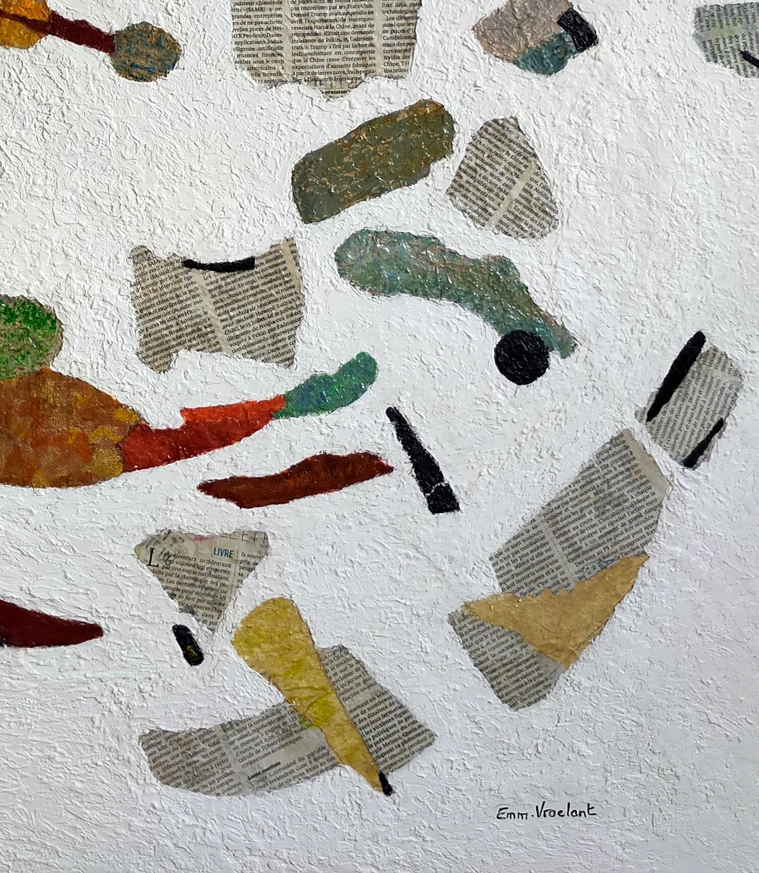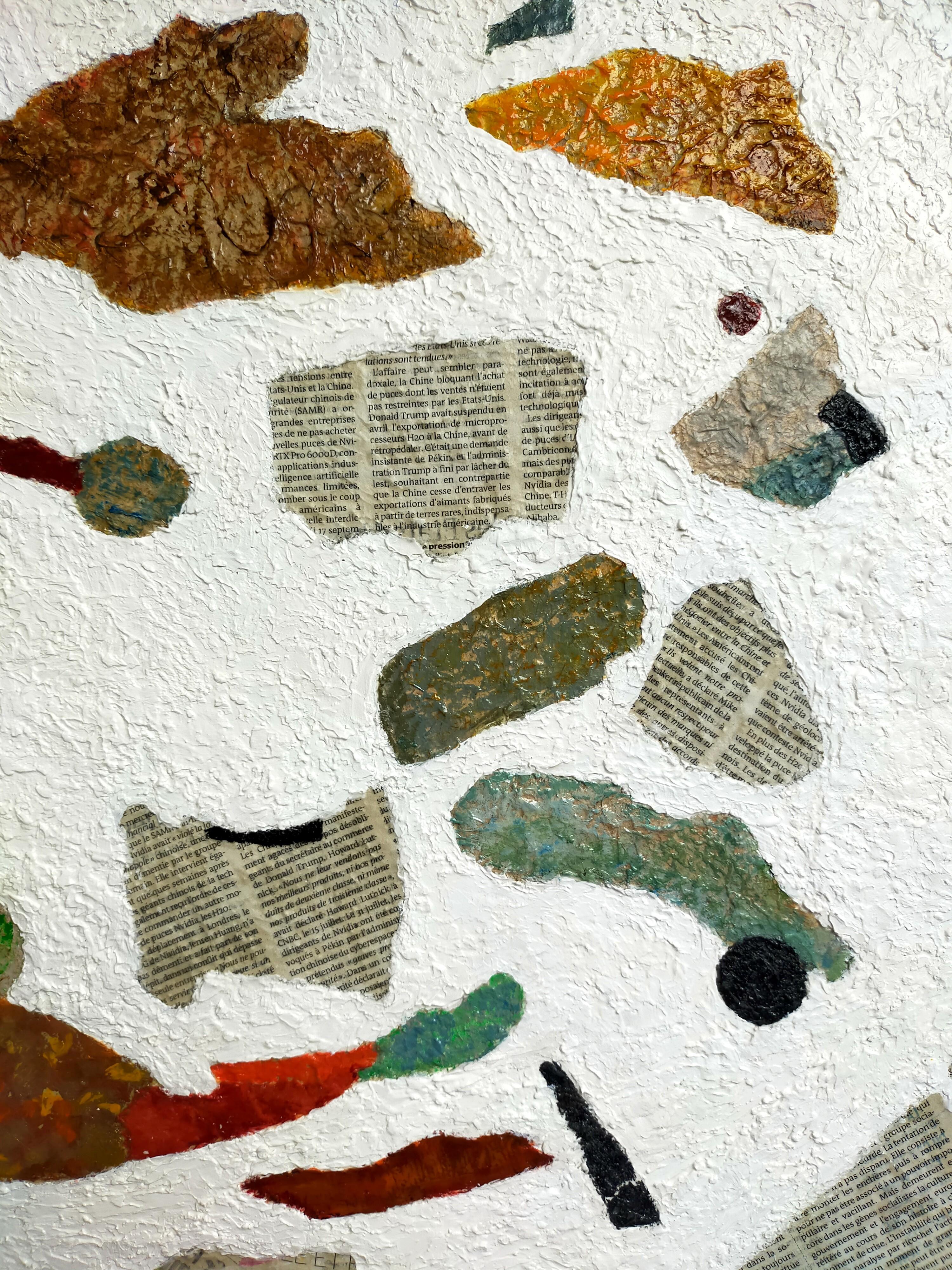 Es handelt sich um ein abstraktes Gemälde, das mit der Technik der Collage von Zeitungsausschnitten und deren Vermischung mit Farbe hergestellt wurde. Der Hintergrund des Gemäldes ist ganz weiß und sehr rau - unter der Farbe befindet sich eine körnige Paste, die für viel Textur sorgt.