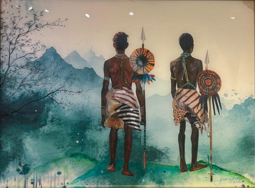 „Renew...Live...Reflect“ Stammeskunst afrikanische Männer mit grafischer Kleidung, Federn