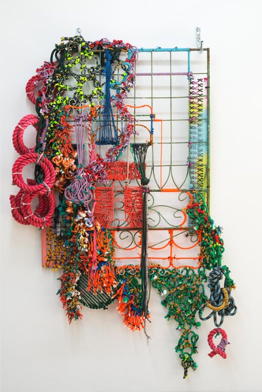 In ARCHITECTURAL HYPERBOLE 02 schafft Liz Miller einen skulpturalen Wandbehang, der auf der Gegenüberstellung von Festigkeit und Formbarkeit, Architektur und Faser, Struktur und Knoten aufbaut. Indem sie mit Seilen auf eine wiederverwendete, stark strukturierte Metallarmatur aufbaut und gleichzeitig zulässt, dass das Seil in diesem geordneten Raum chaotisch und wild wirkt, präsentiert sie dem Betrachter die Spannung zwischen zwei Arten, in der Welt zu sein.