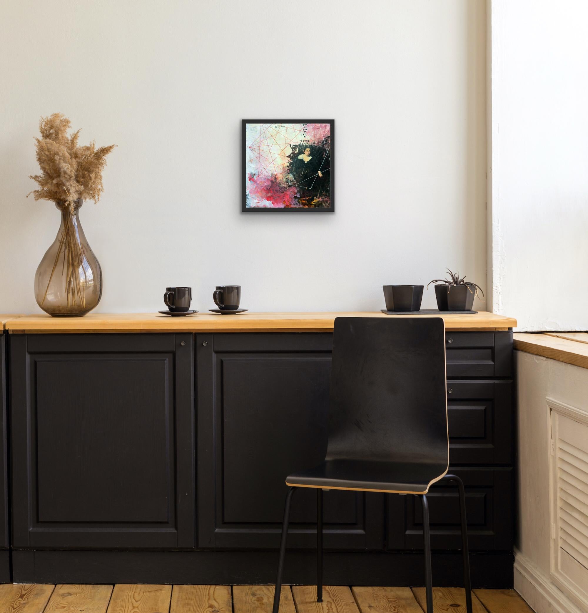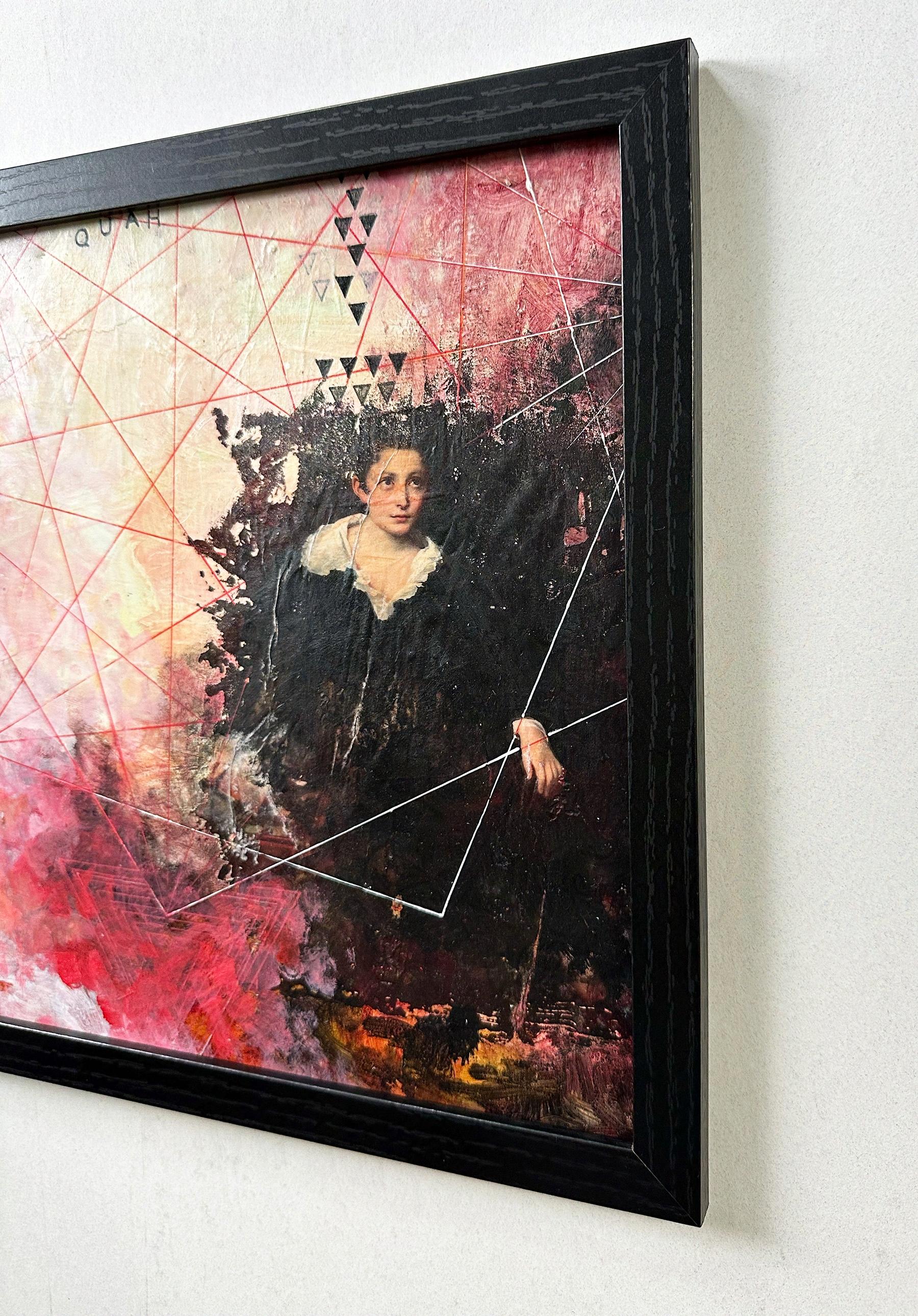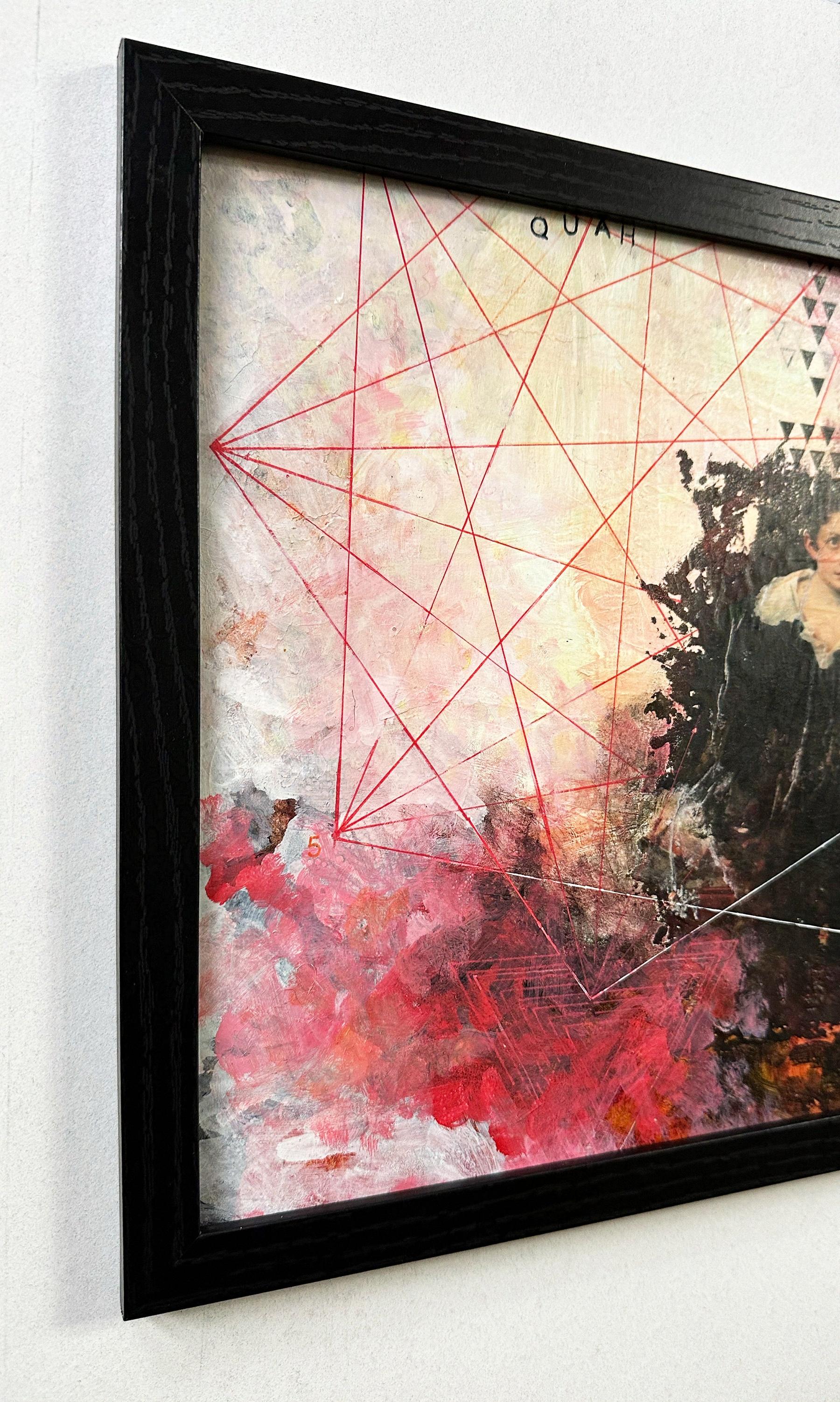 "Quah" von Sandra Cohen ist ein 12 x 12 x 0,25 Zoll großes Werk in Mischtechnik auf Archivkarton in leuchtenden Rot- und Rosatönen, Weiß, Gold, Pfirsich und Schwarz. Eine verwirrende Geometrie webt sich um eine Gestalt, die eine Hand durch die Dunkelheit streckt. Acryl, Stift und Inkjet-Transfer mit Kaltwachs veredelt, ist dieses Werk bescheiden gerahmt, verkabelt und hängefertig. Es ist auf der Rückseite signiert.