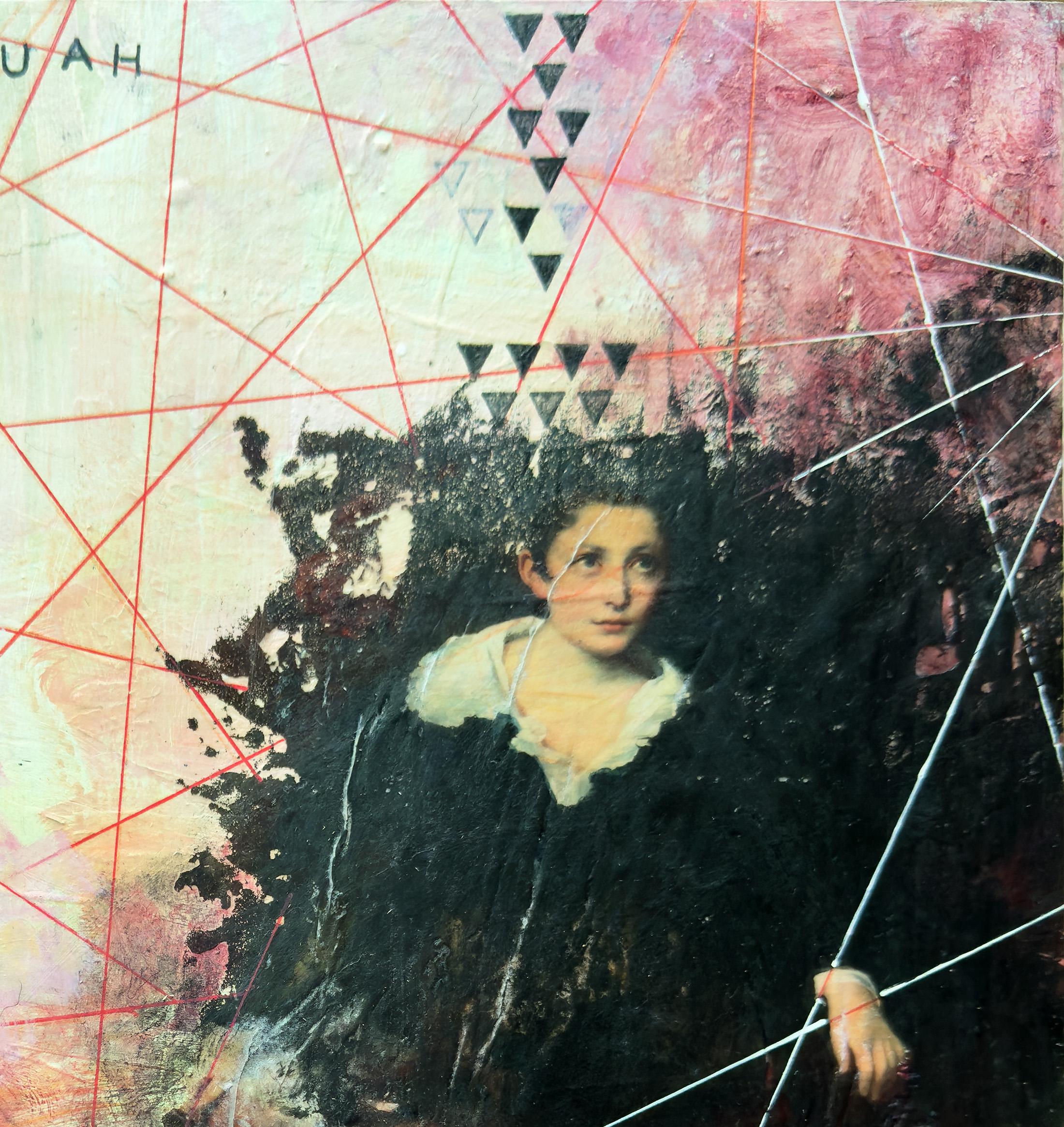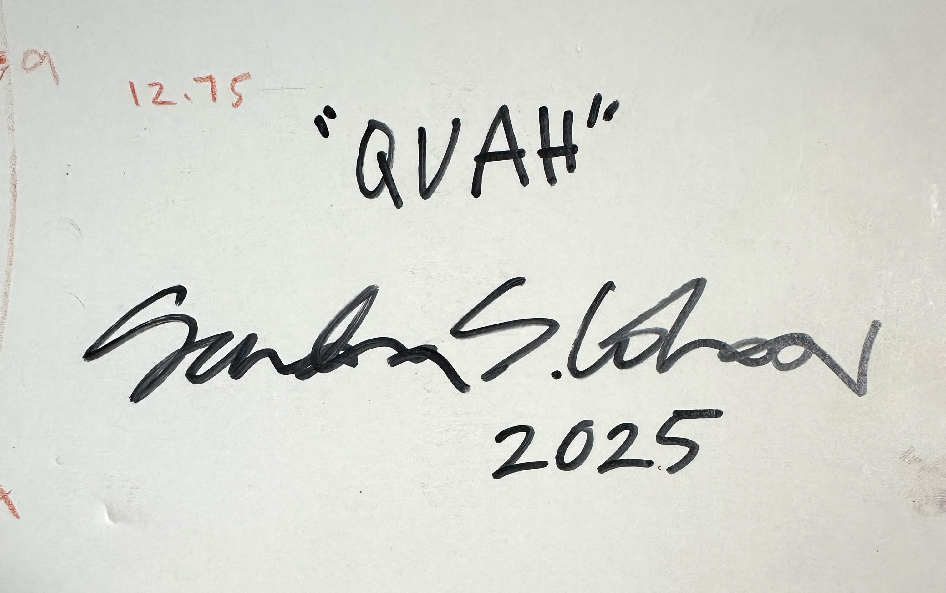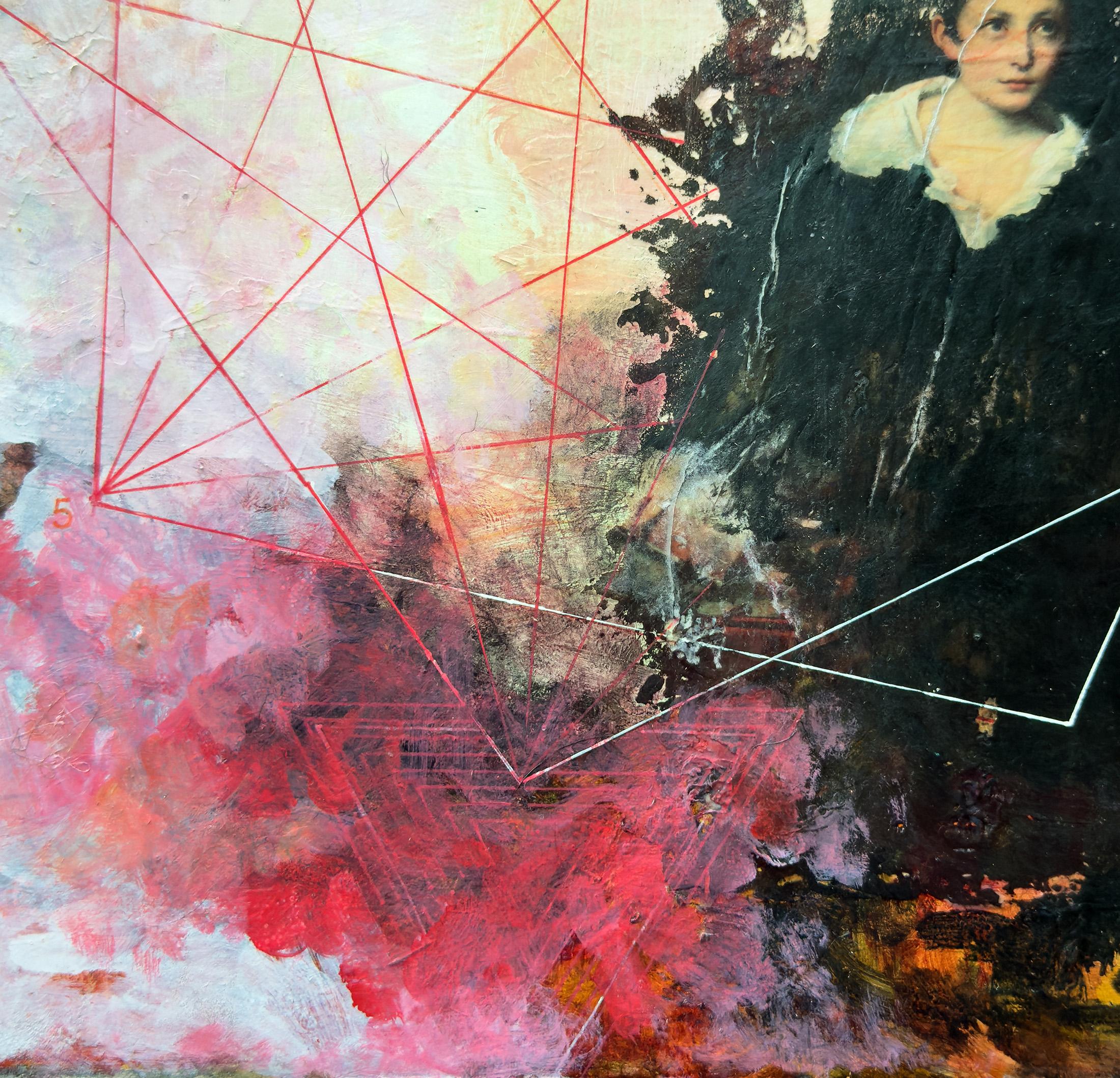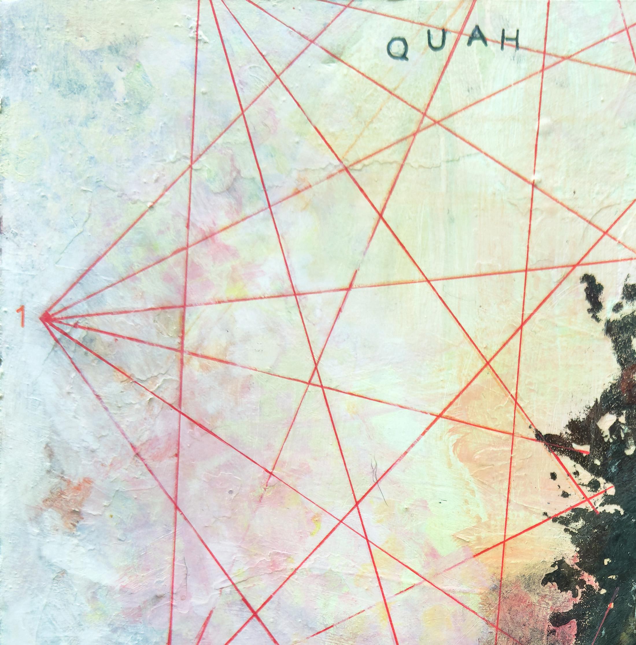 "Quah" von Sandra Cohen ist ein 12 x 12 x 0,25 Zoll großes Werk in Mischtechnik auf Archivkarton in leuchtenden Rot- und Rosatönen, Weiß, Gold, Pfirsich und Schwarz. Eine verwirrende Geometrie webt sich um eine Gestalt, die eine Hand durch die Dunkelheit streckt. Acryl, Stift und Inkjet-Transfer mit Kaltwachs veredelt, ist dieses Werk bescheiden gerahmt, verkabelt und hängefertig. Es ist auf der Rückseite signiert.