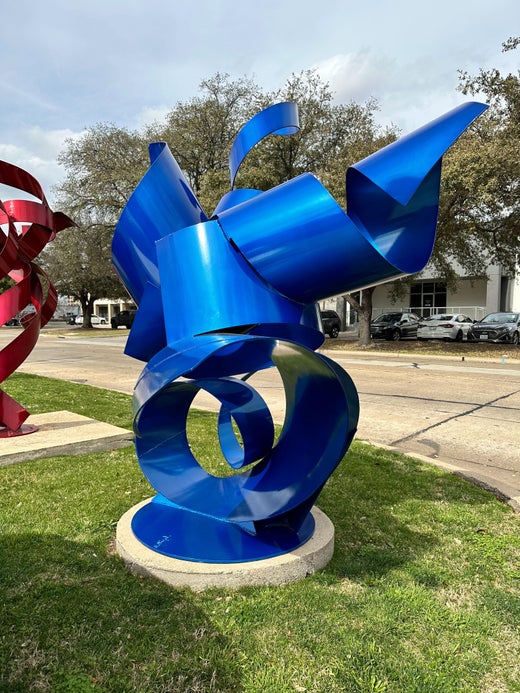 Nic Noblique ist ein in Texas ansässiger Bildhauer, dessen bevorzugtes Medium Stahl ist. Noblique hat sich in relativ kurzer Zeit zu einem der bedeutendsten abstrakten Bildhauer der Vereinigten Staaten entwickelt. Diese gelbe, gewellte Stahlskulptur wird das Ambiente Ihres Außenbereichs aufwerten. Diese Skulptur aus pulverbeschichtetem Stahl ist 120x48x72 groß und setzt ein Zeichen. Dieses rote Stahlstück zeichnet sich durch ein einzigartiges, gedrehtes Metalldesign auf der Oberseite aus, das an eine Schleife erinnert. Die Skulptur zieht mit Sicherheit die Aufmerksamkeit aller Betrachter auf sich und setzt in jedem Raum ein gewagtes Statement. Diese Skulptur ist nicht nur optisch auffallend, sondern auch für den Einsatz im Freien gemacht. Seine langlebige Konstruktion gewährleistet, dass er Ihren Raum über Jahre hinweg bereichern wird.