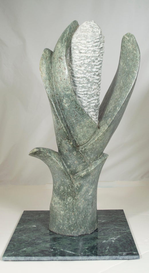 blooming Flower" ist eine originale Opal-Serpentin-Skulptur, signiert von dem simbabwischen Künstler Canaan Musiyiwa Ngandu. Die Skulptur zeigt eine abstrakte florale Figur in Ngandu...