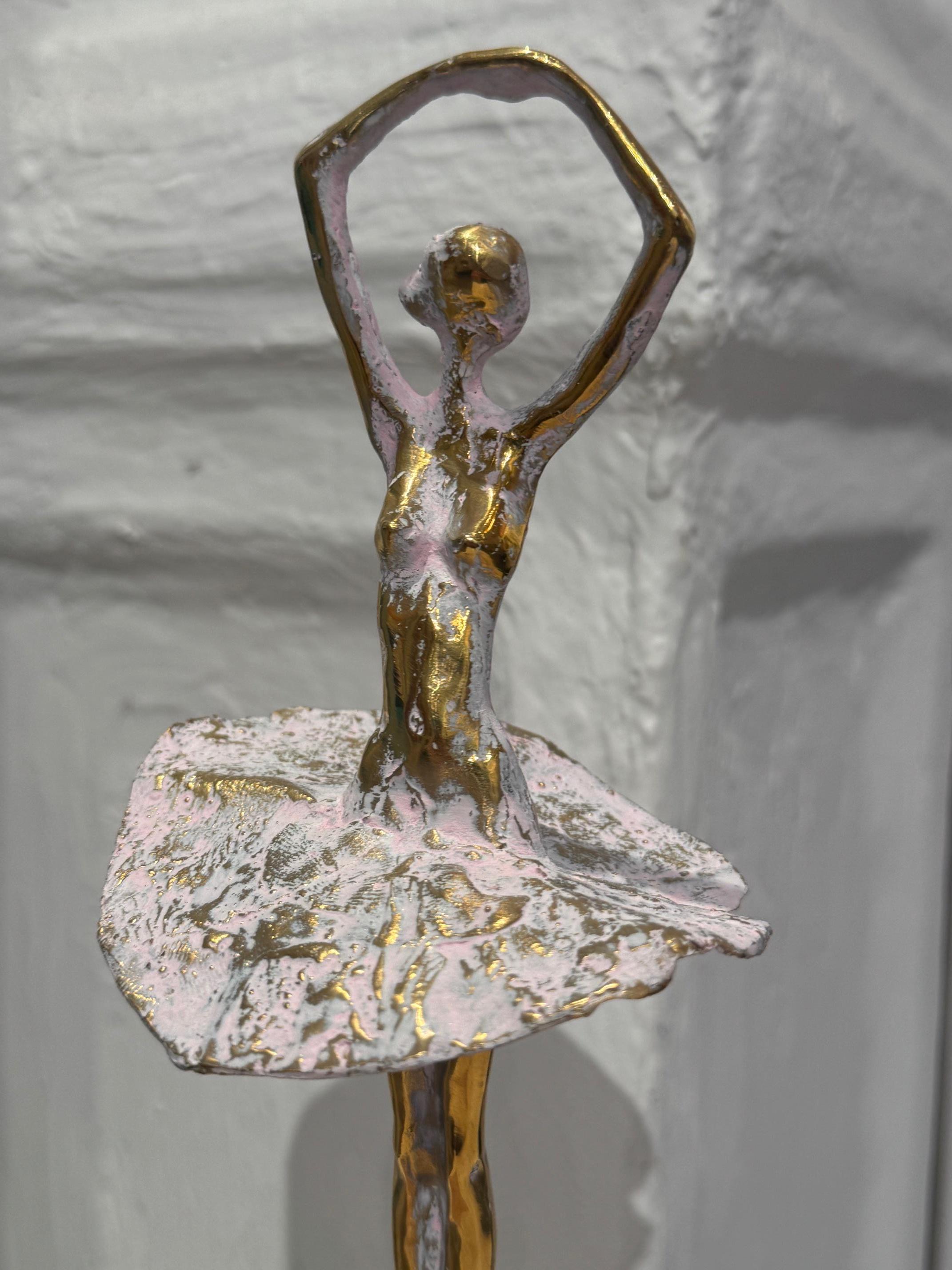 "Ballerina" ist eine einzigartige Bronzeskulptur (2024) einer tanzenden Ballerina in einem gold-rosa Kleid des bulgarischen Künstlers Günay Aliev, der gerade seine Karriere beendet hat. In dieser Skulptur stellt der Künstler eine Ballerina dar, die auf ihren Schleppen steht, die Beine zusammen und die Arme über dem Kopf in einem Kreis wirbelnd. Die Bronzefigur steht auf einem schönen Marmorstein. Einzigartige Arbeit. Zertifikat. 27 x 14 x 9 cm.